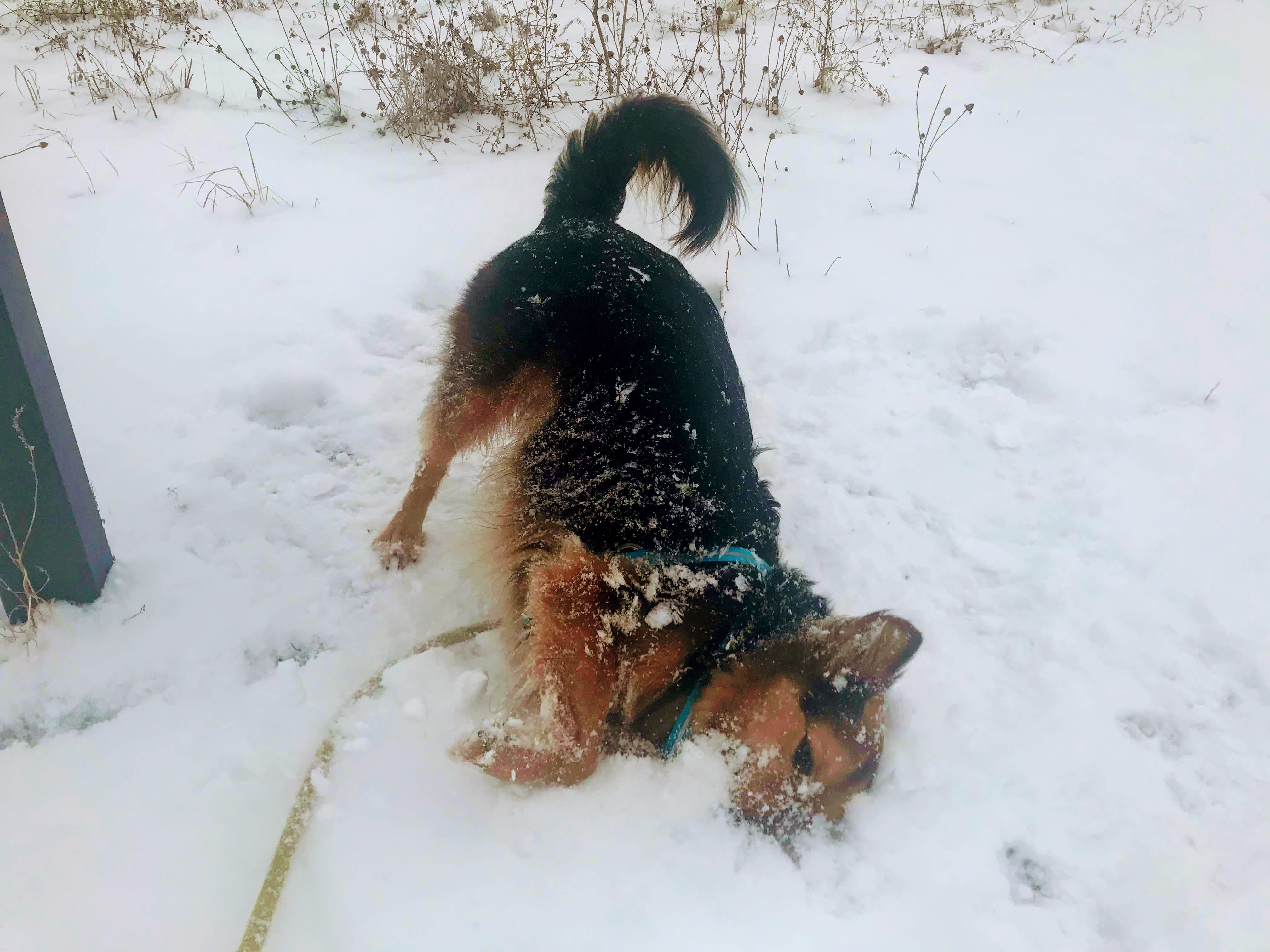 We find the trail by the riverfront. There is a small hill with equally small children sledding down it. Gob is not interested in them. Instead he is nose deep in the reeds, searching for rodents.