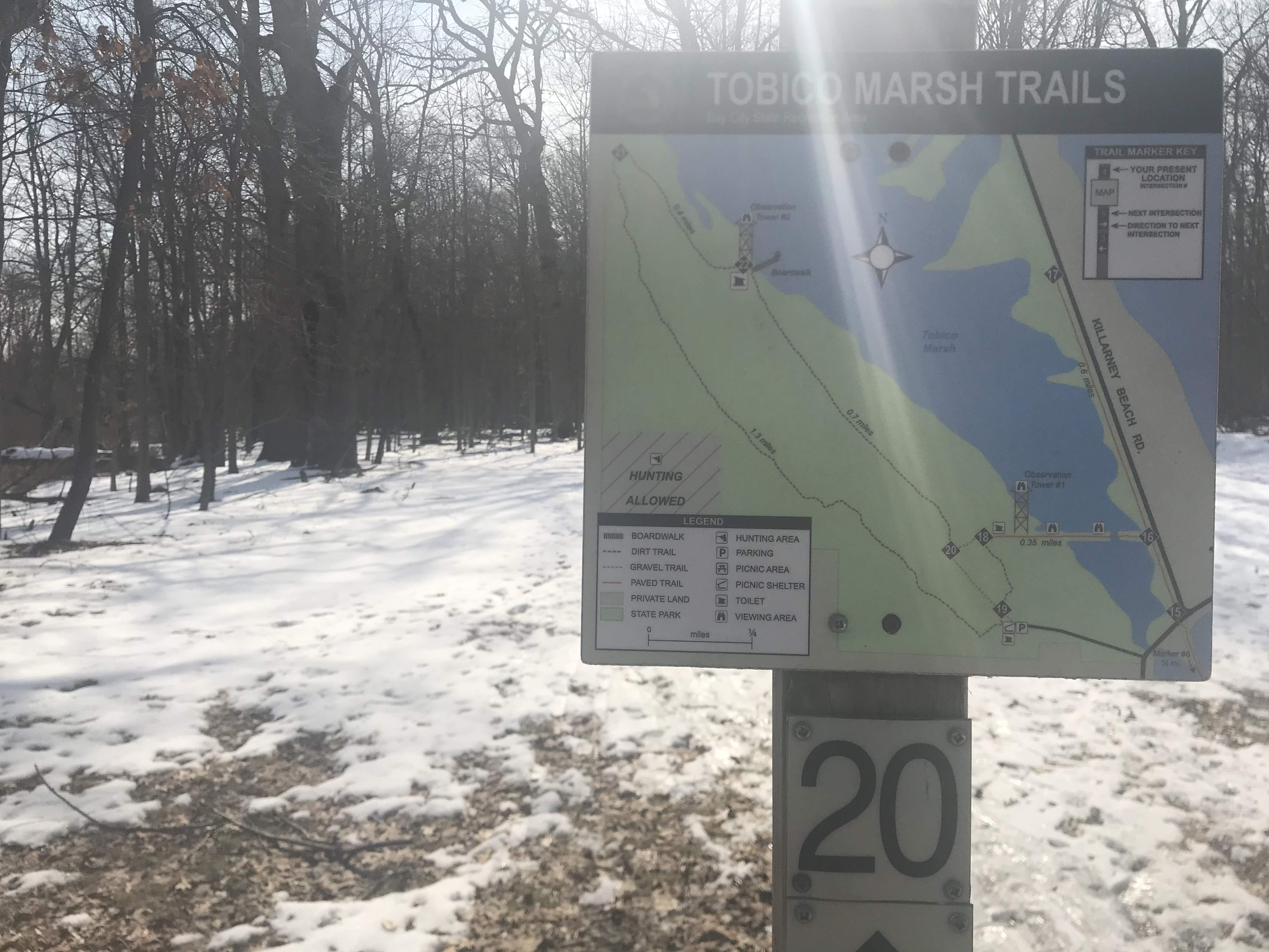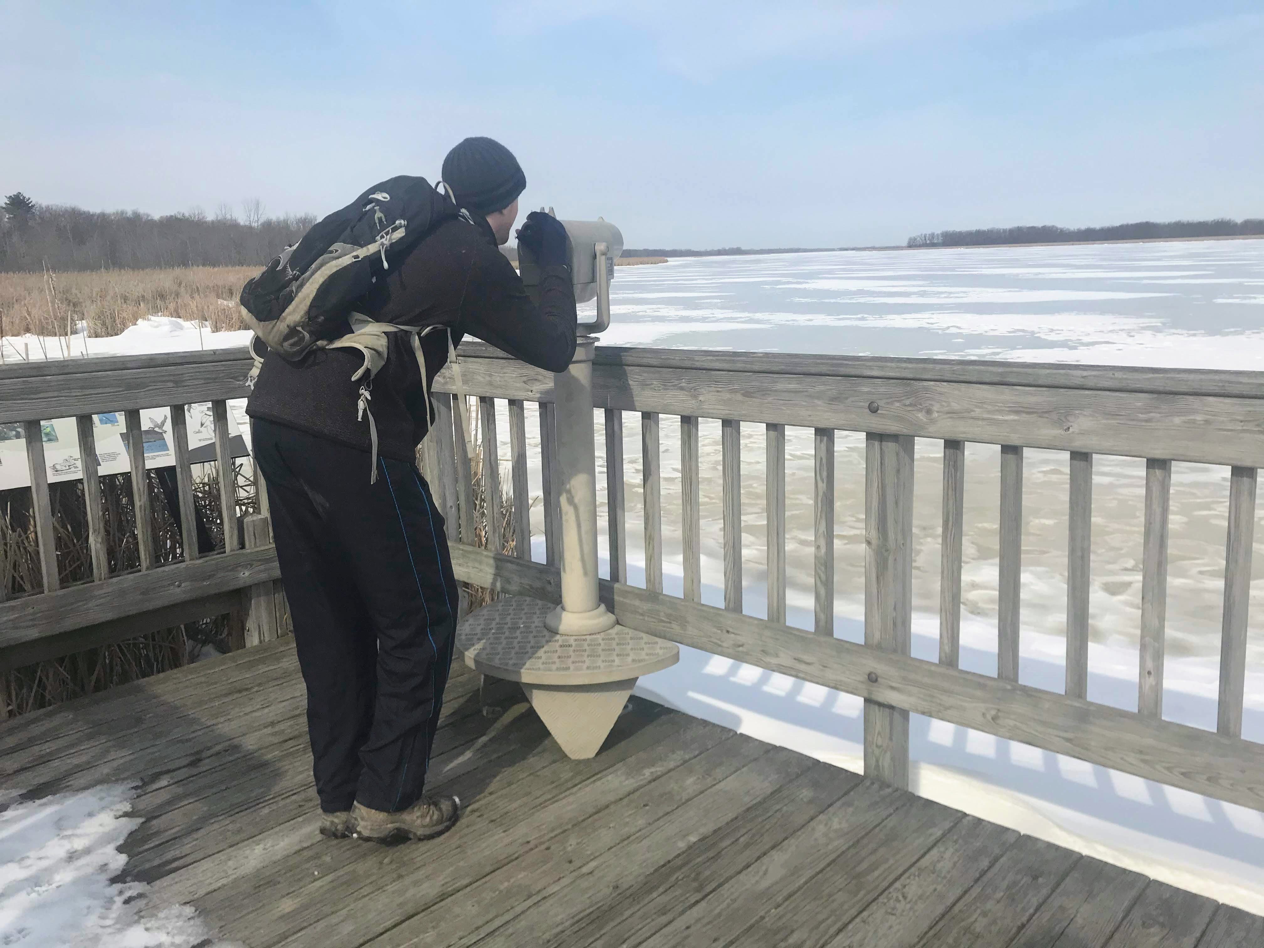 Eventually the marsh turns into woods. We happen upon an observation tower. Even Gob is excited to climb to the top. Once we reach the top, Gob tries to eat the snow rather then observe the surrounding nature. Oh well.