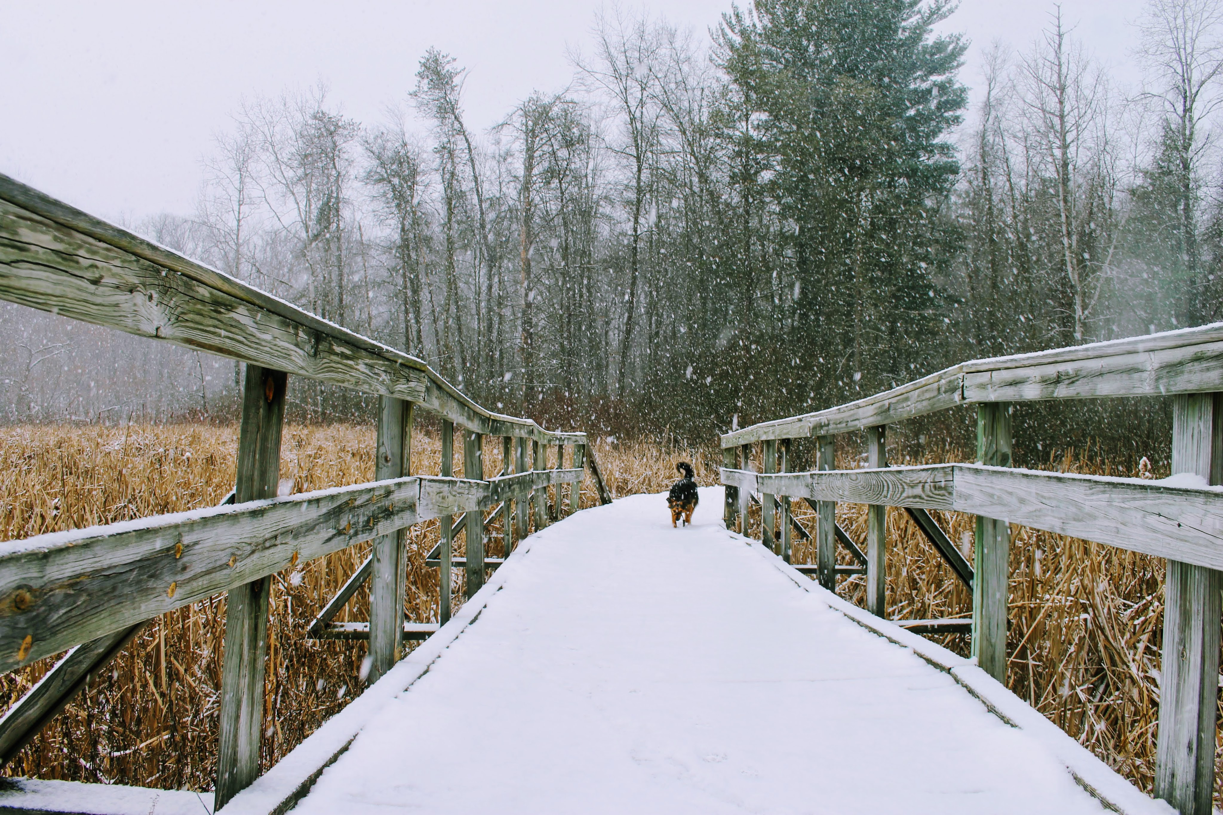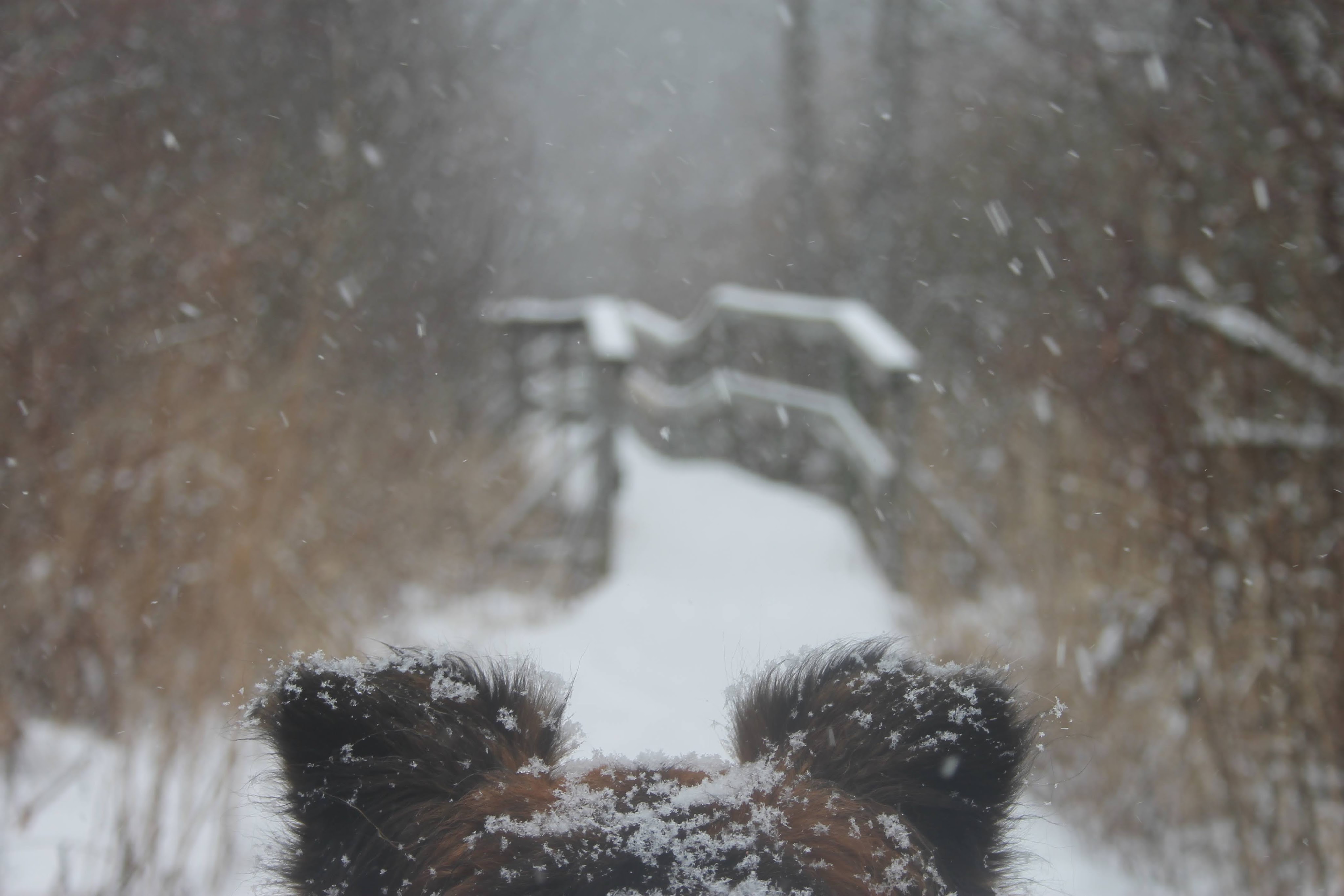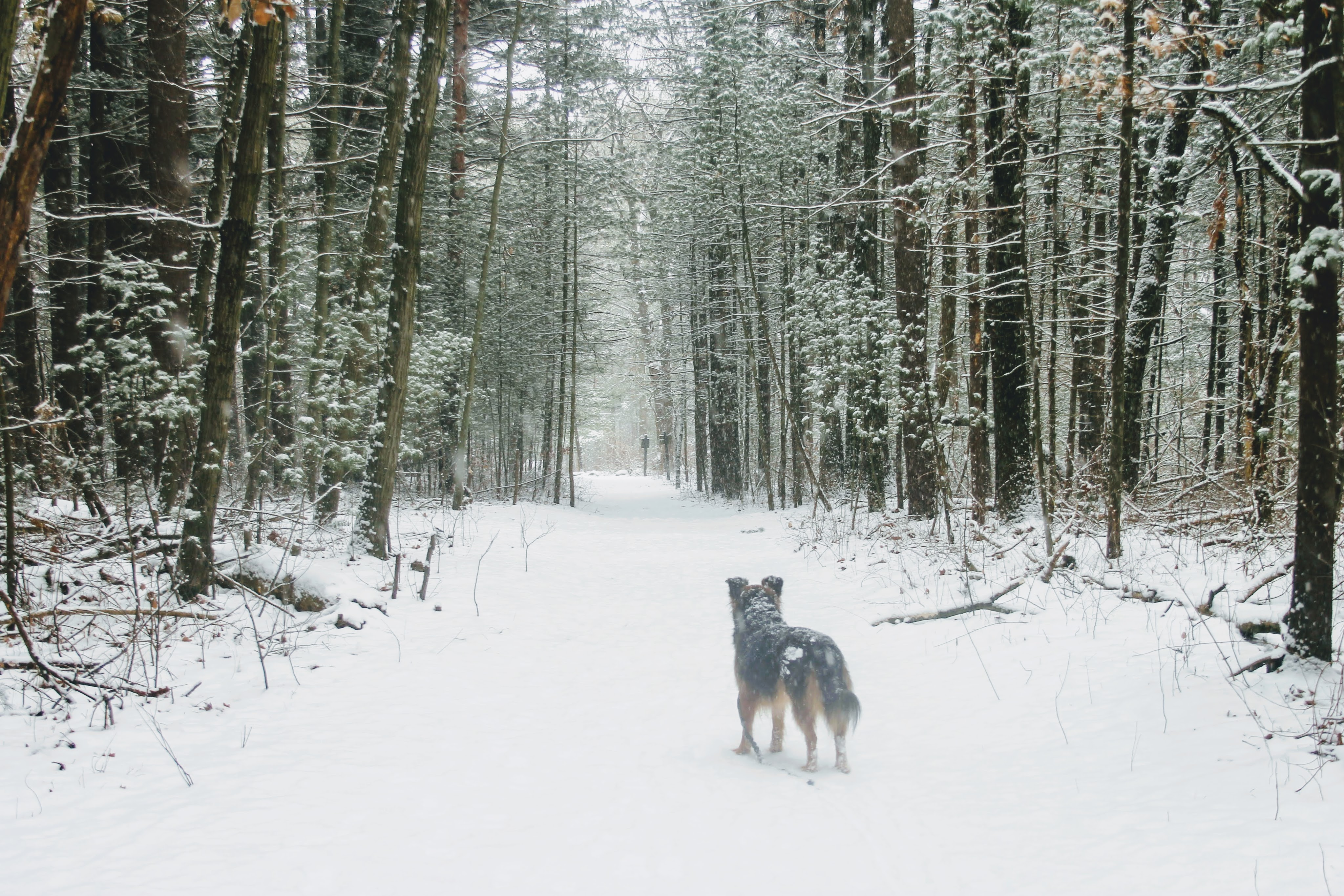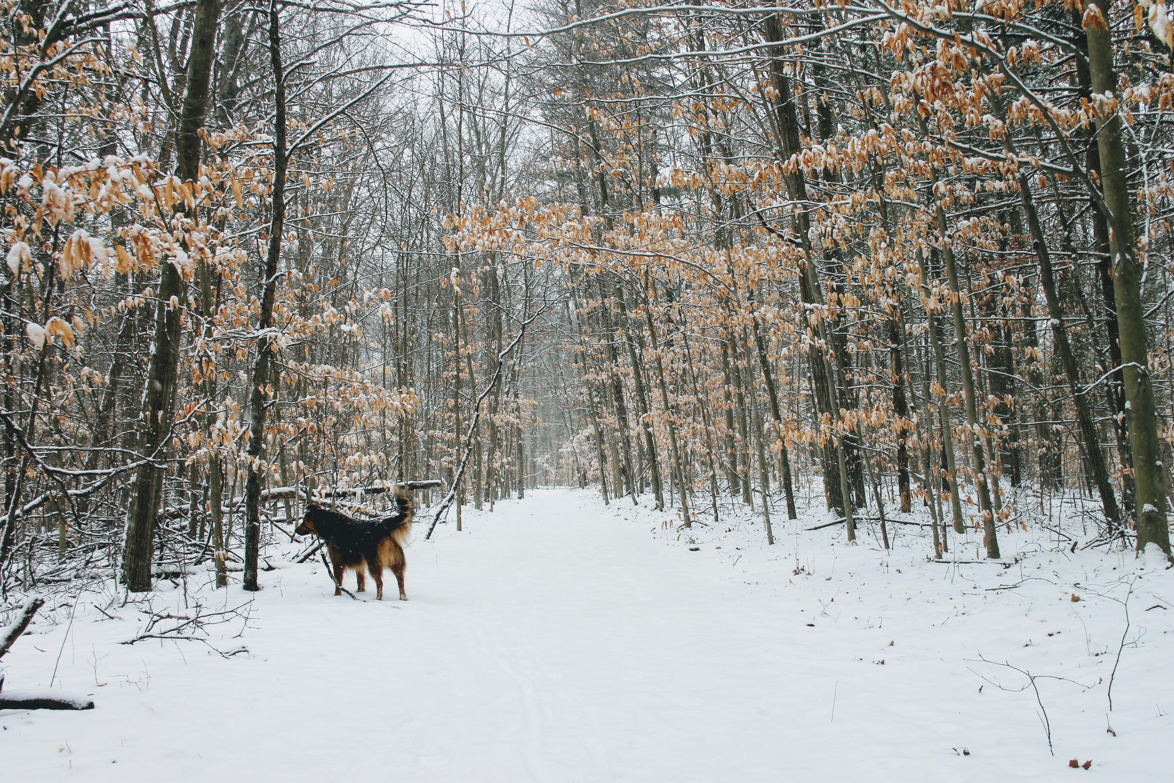 Snowflakes glitter to the ground as the sunlight hits, barely peaking through the grey clouds above. Gob hops out of the car, immune to the tiny snowballs growing between his toes. Meanwhile I am so bundled up that only the skin around my eyes is being kissed by the cold. It only takes a few steps for me to realize the layer of snow is masking a layer of ice. I slip on my Yaktrax, tie Gob to my waist, and finally we hit the trail.