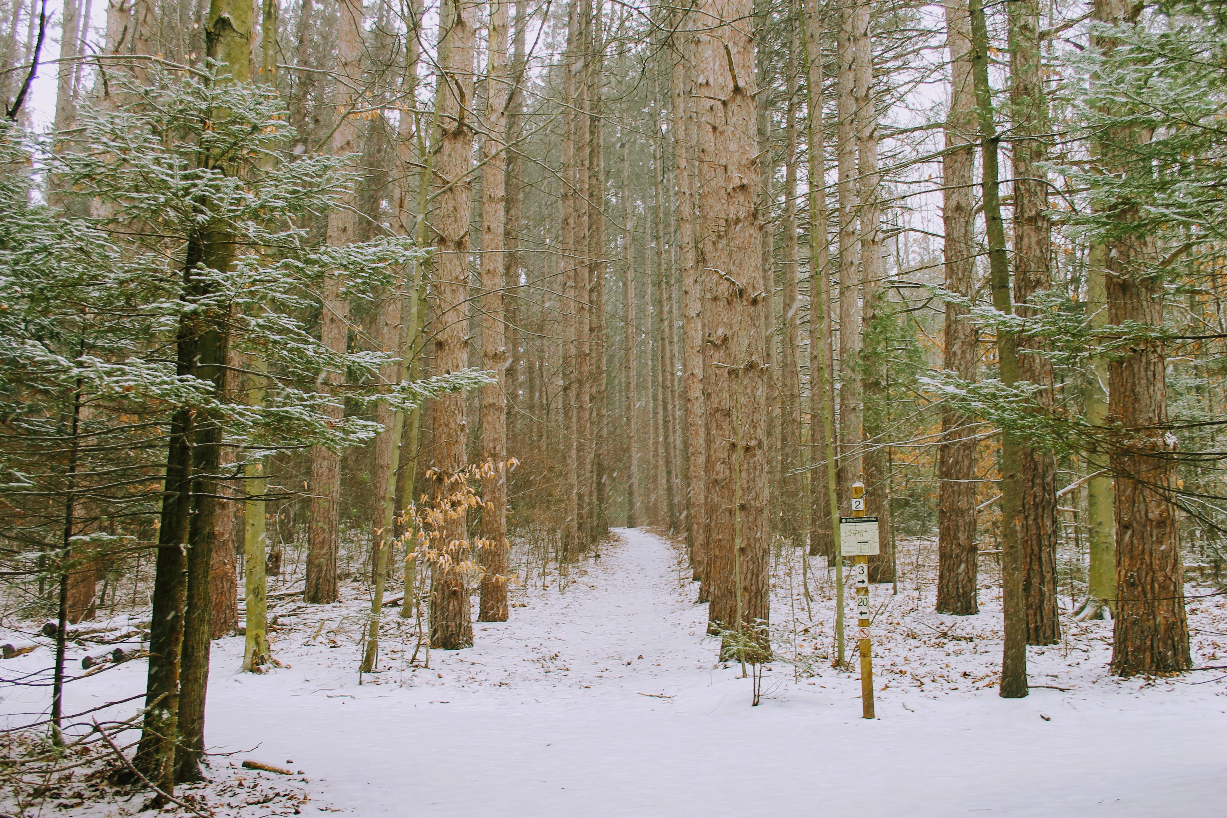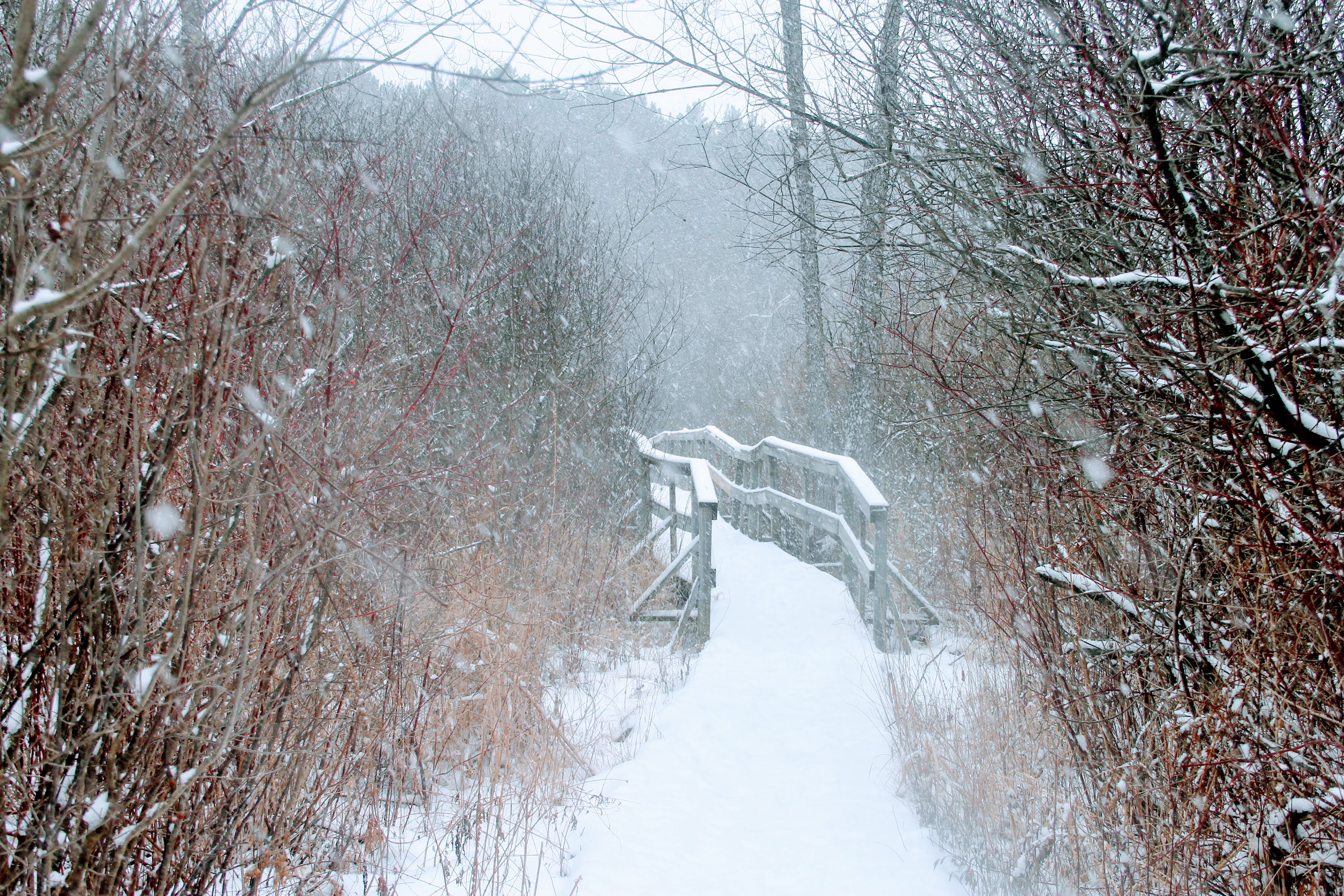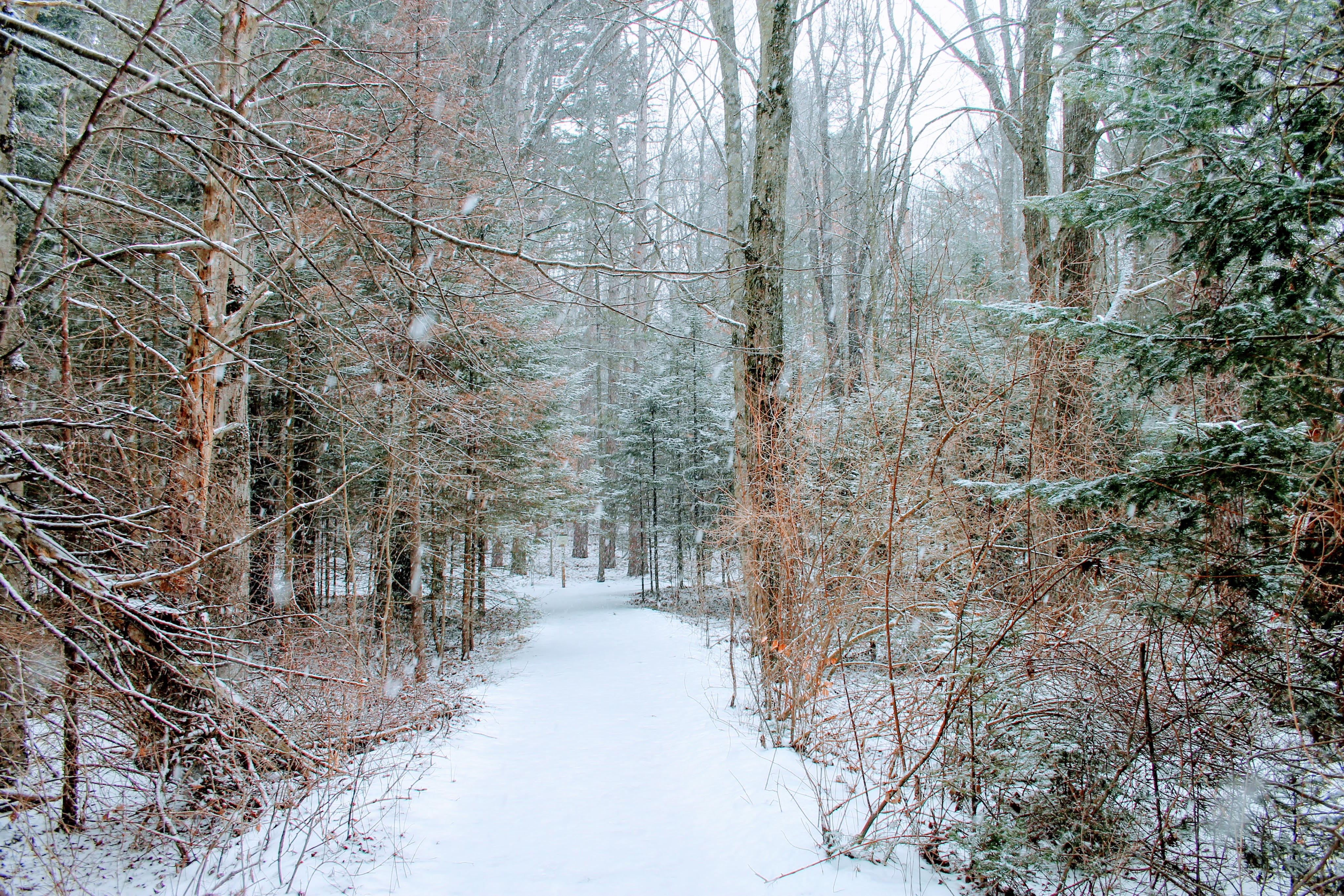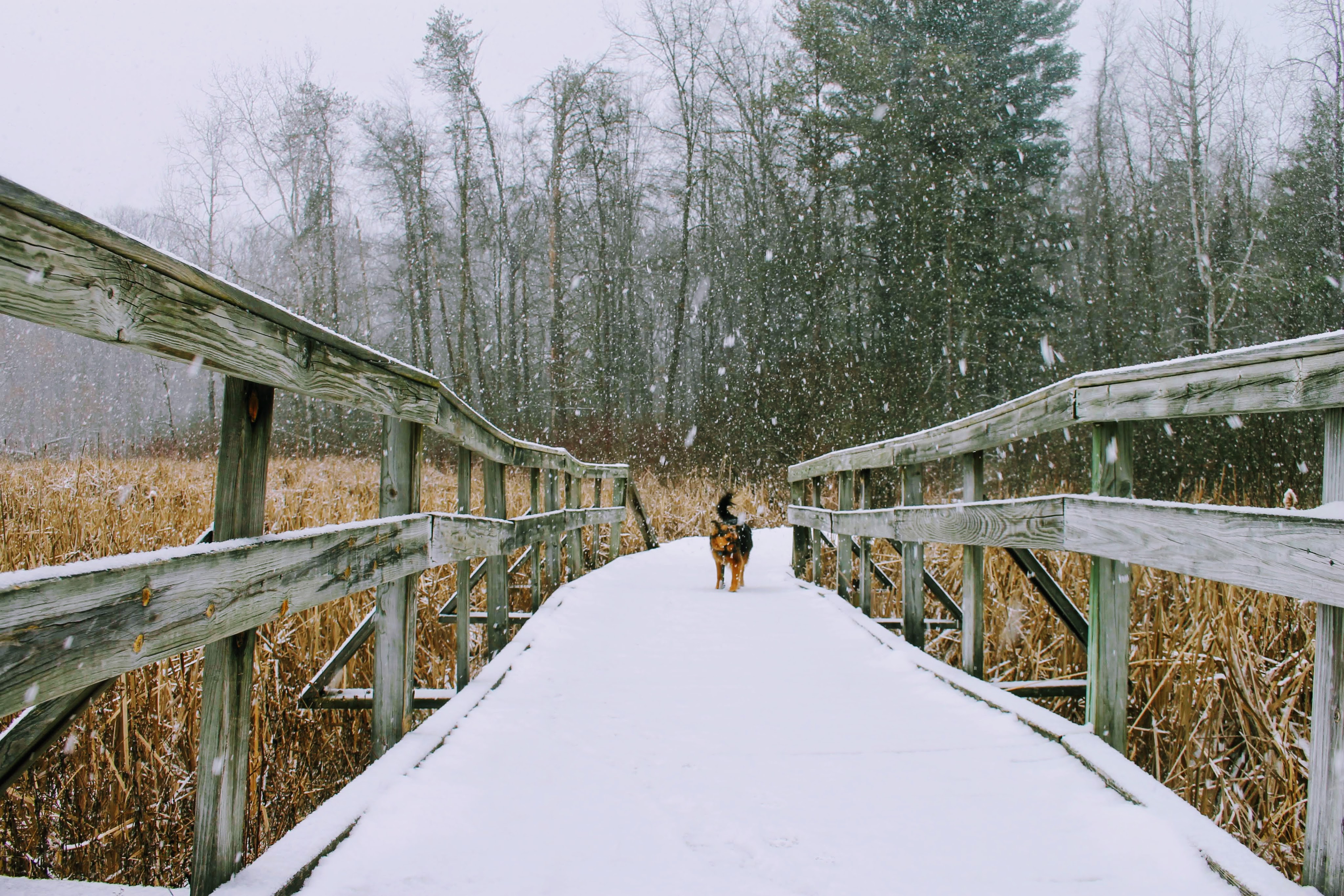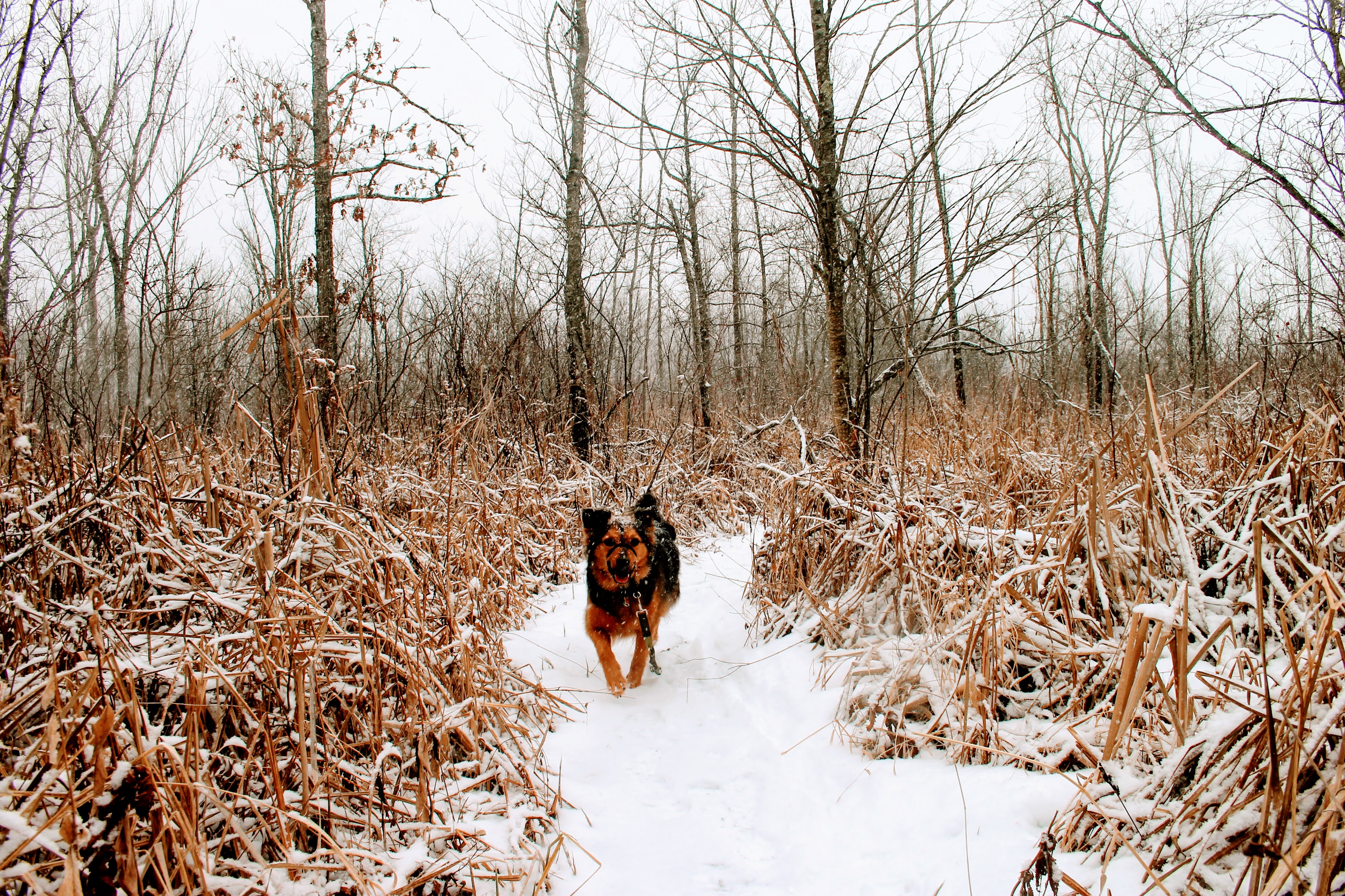 Snowflakes glitter to the ground as the sunlight hits, barely peaking through the grey clouds above. Gob hops out of the car, immune to the tiny snowballs growing between his toes. Meanwhile I am so bundled up that only the skin around my eyes is being kissed by the cold. It only takes a few steps for me to realize the layer of snow is masking a layer of ice. I slip on my Yaktrax, tie Gob to my waist, and finally we hit the trail.