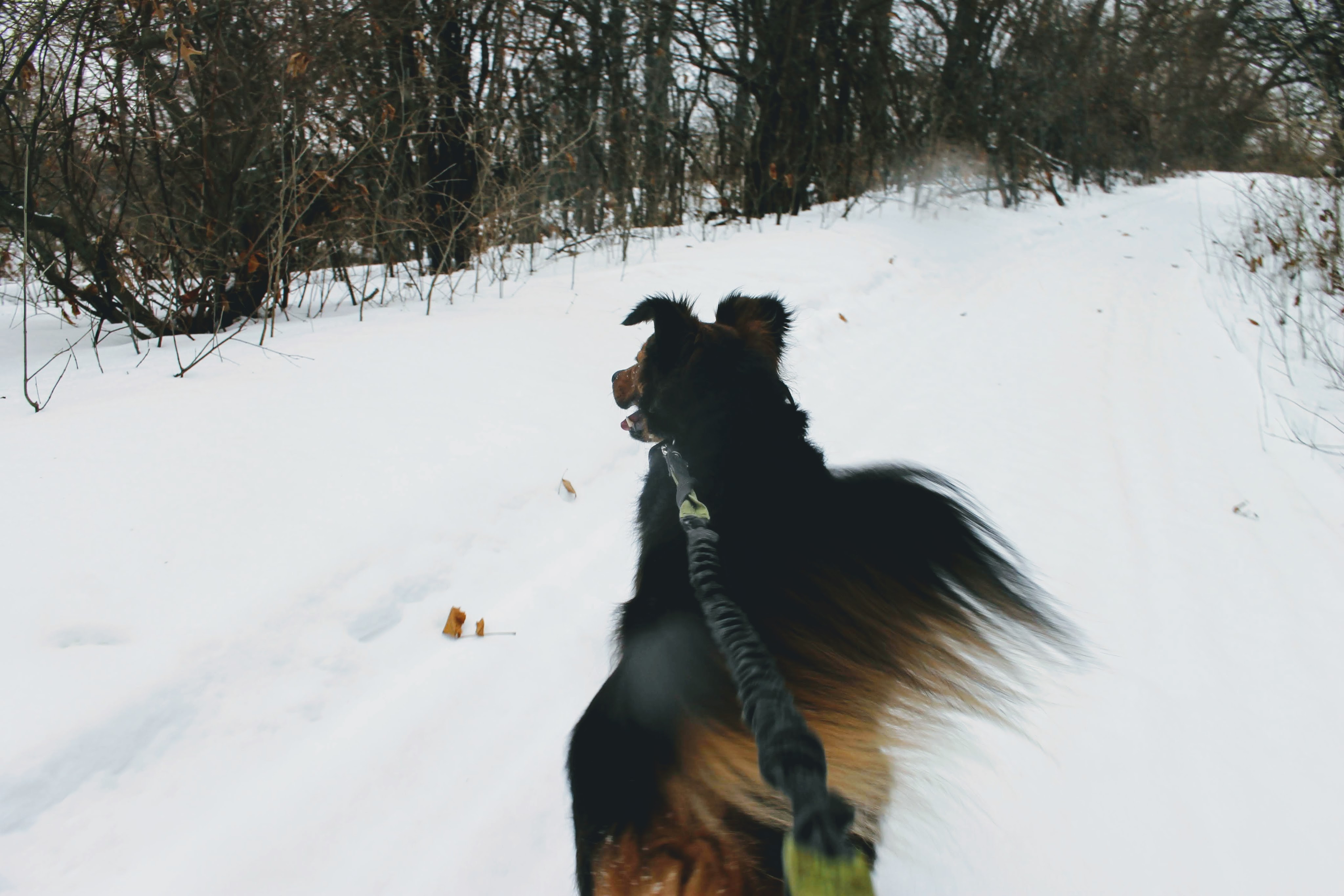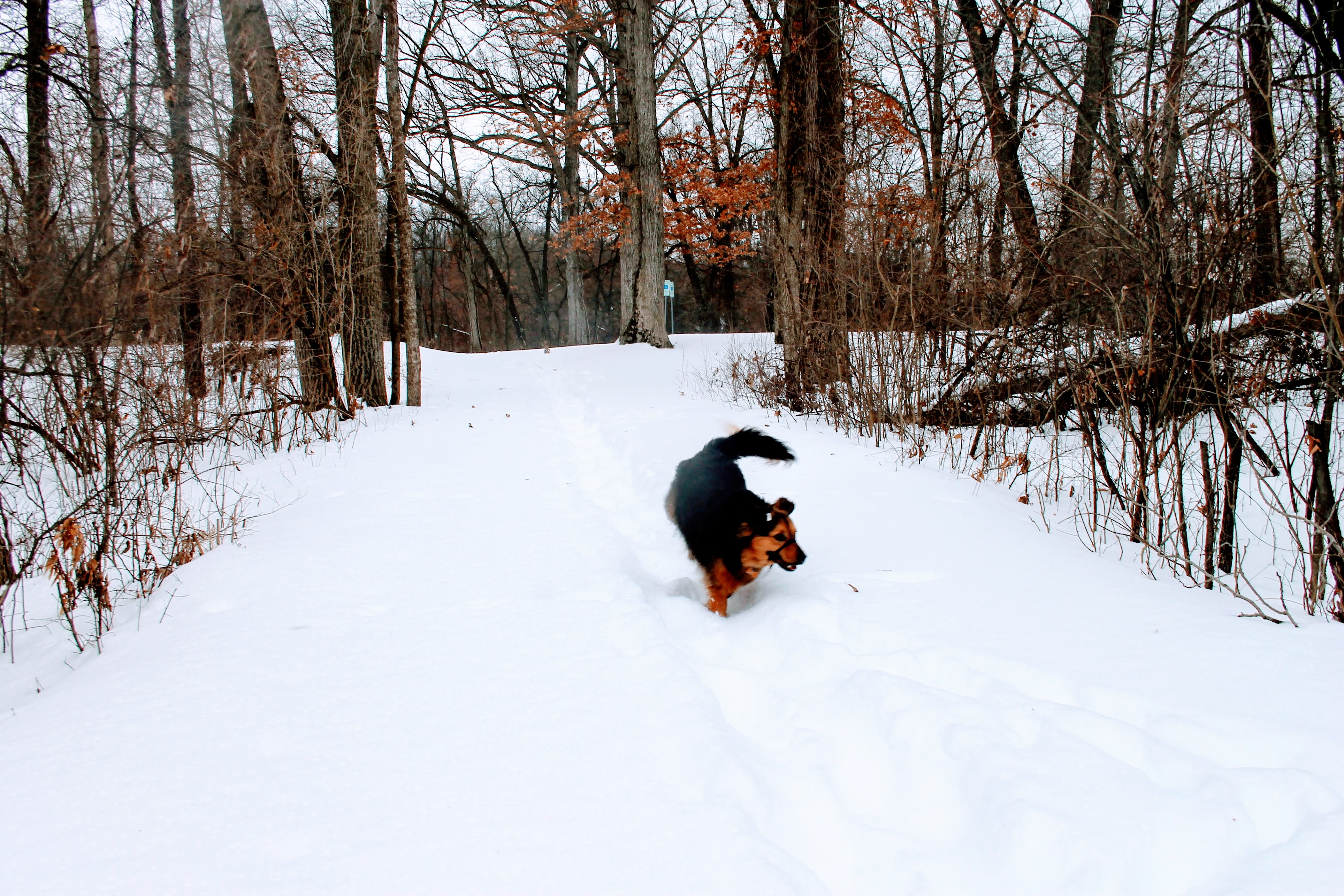 A short trail through the woods beckoned. The snow was the perfect consistency for a slow jog. With Gob securely fastened to my waist, we were off. Everything was going great until we saw the deer. At that moment, my slow jog turned into more of an all-out sprint. Gob loves a good chase. But as they disappeared around a bend, we lost track of them. Tired from our sprint, we walked the remainder of the loop.