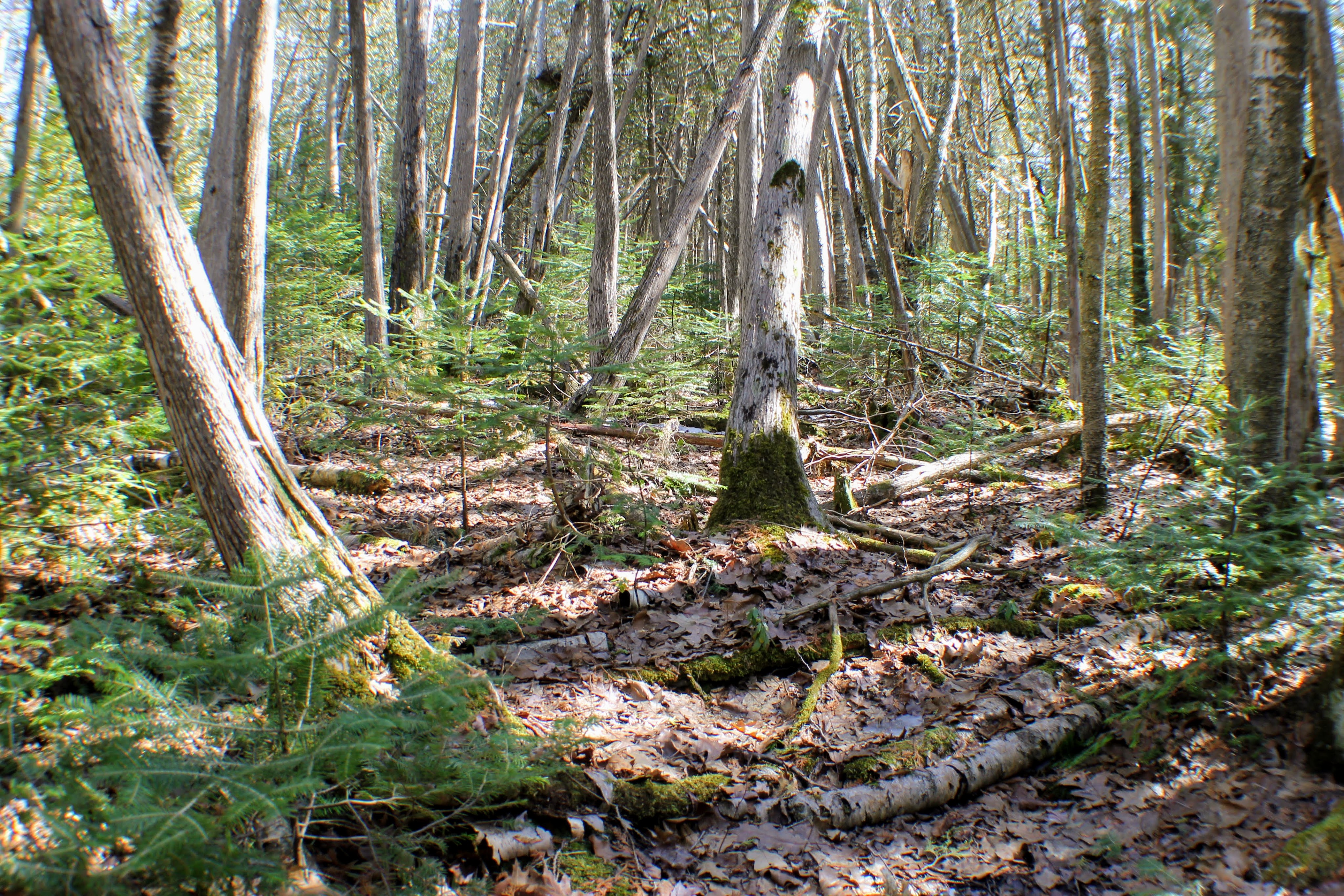 Our trail starts in the woods. Gob enjoys the cold snow on his tired paws. We take the fork towards the beach.