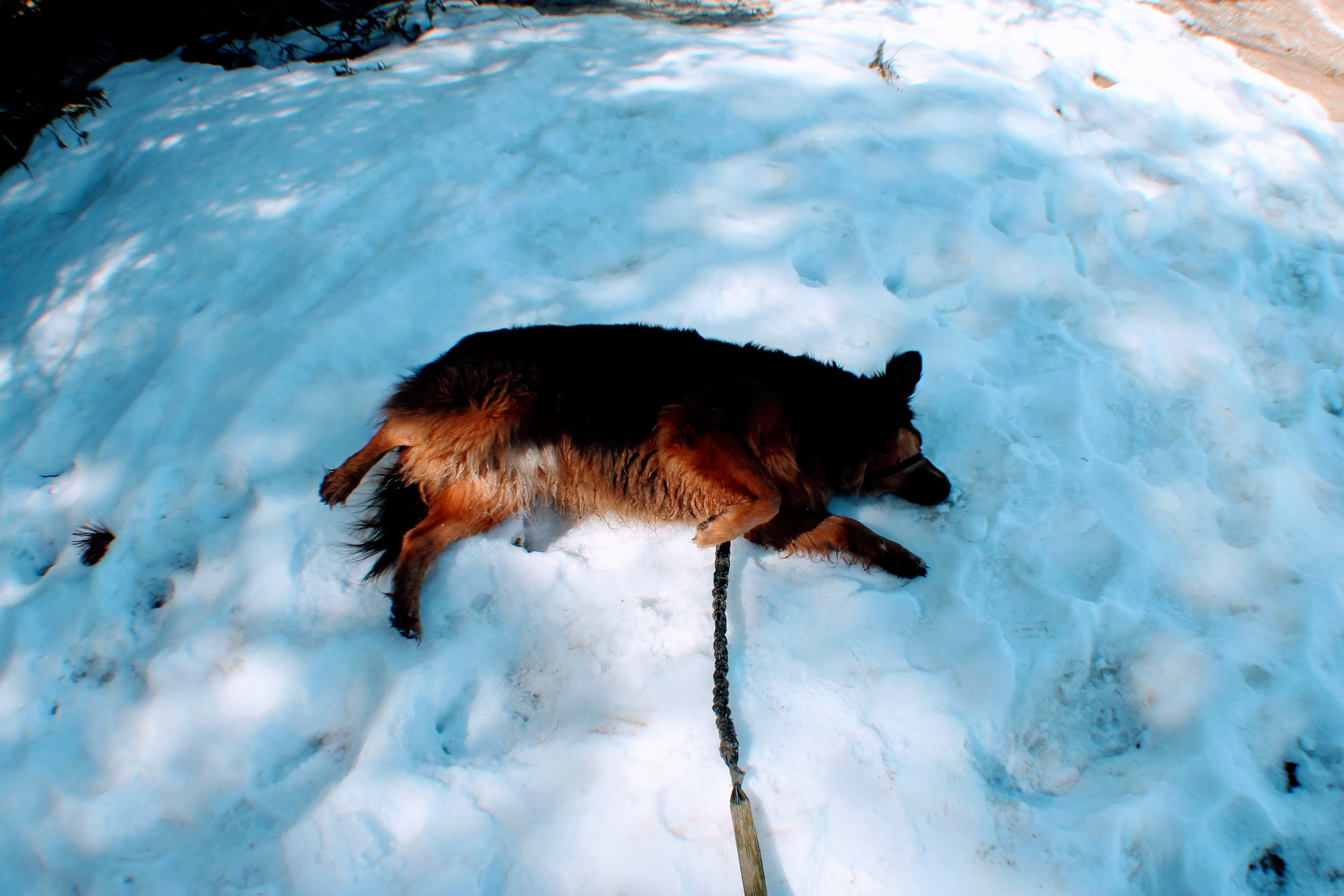 Gob immediately starts for the water, expecting an ice bath for his aching muscles. Alas, it is still frozen. He opts for a snow roll instead. I let him take his time.