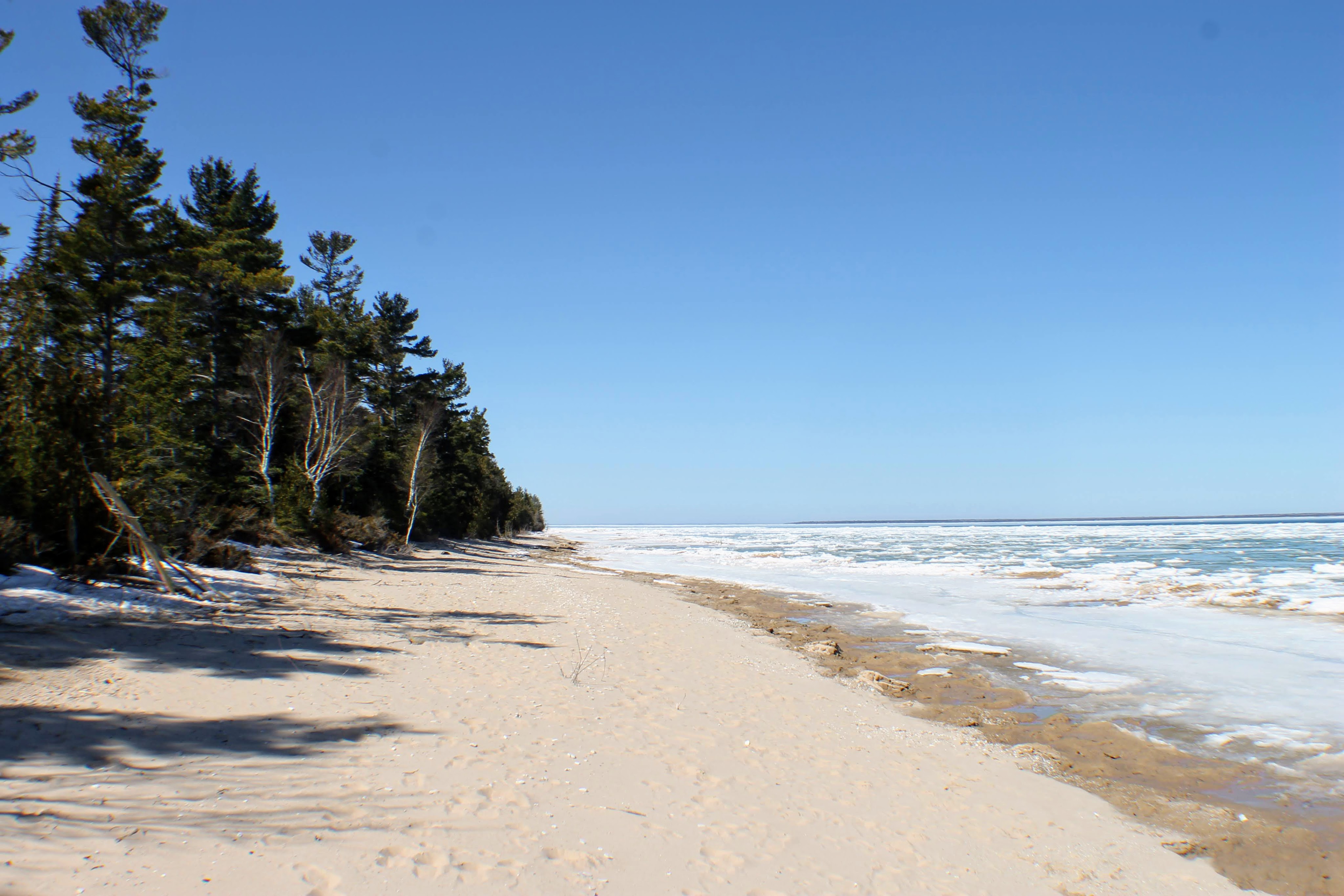A distant lighthouse dots the horizon. Behind it, we can just make out the arches of the Mackinaw bridge. I desperately try to snap a picture that shows both, but the bridge is too faint. I regret not bringing my telephoto lens.