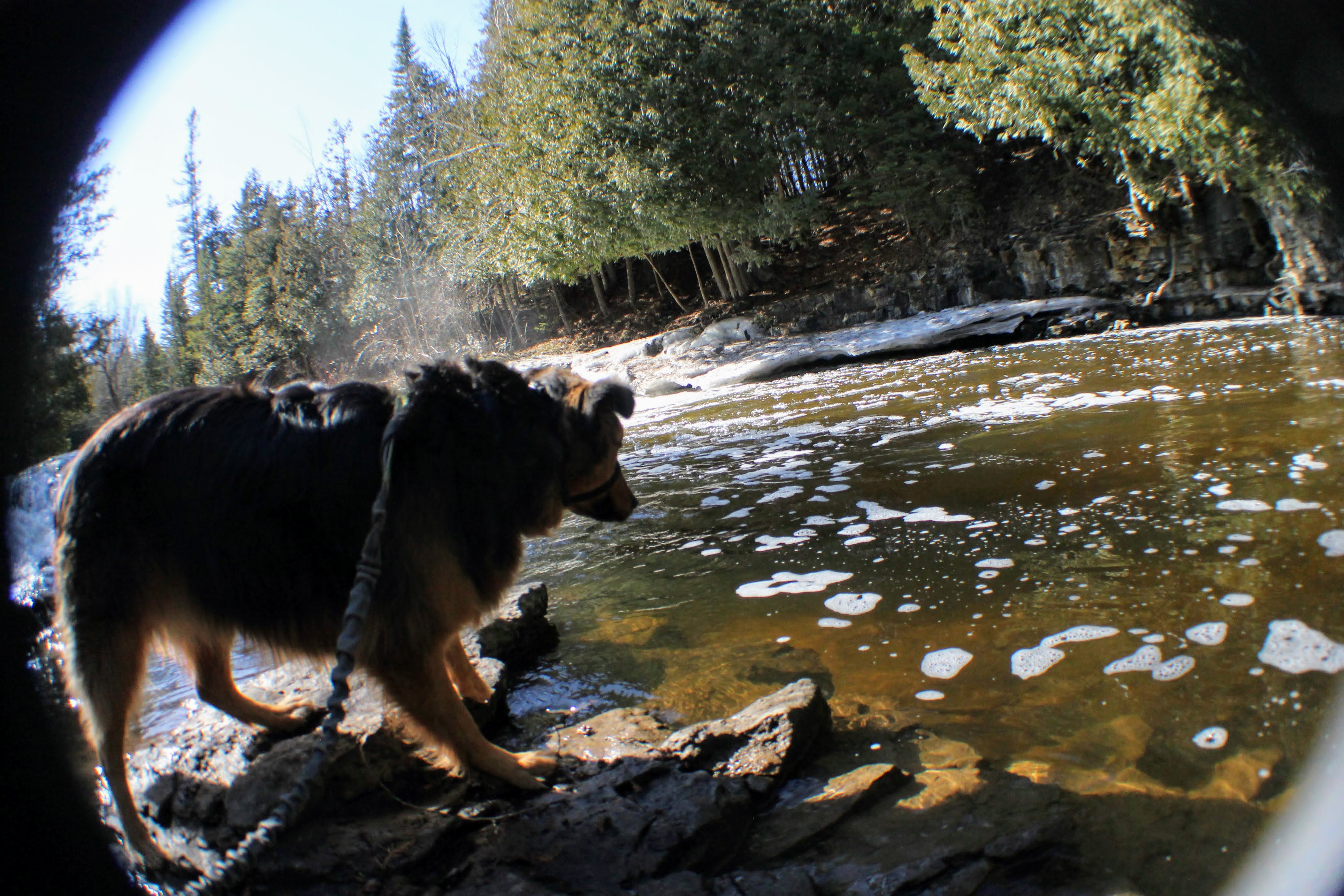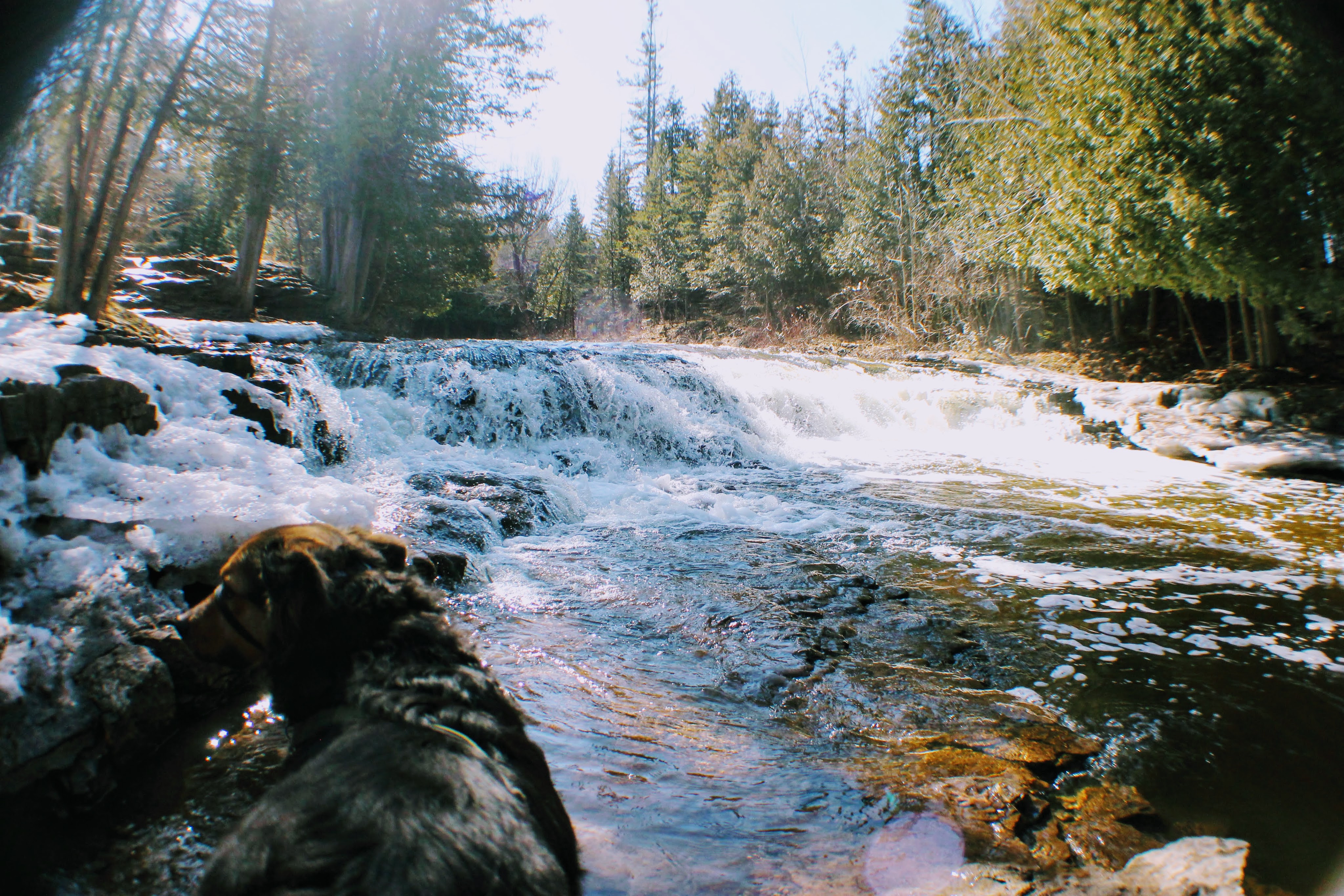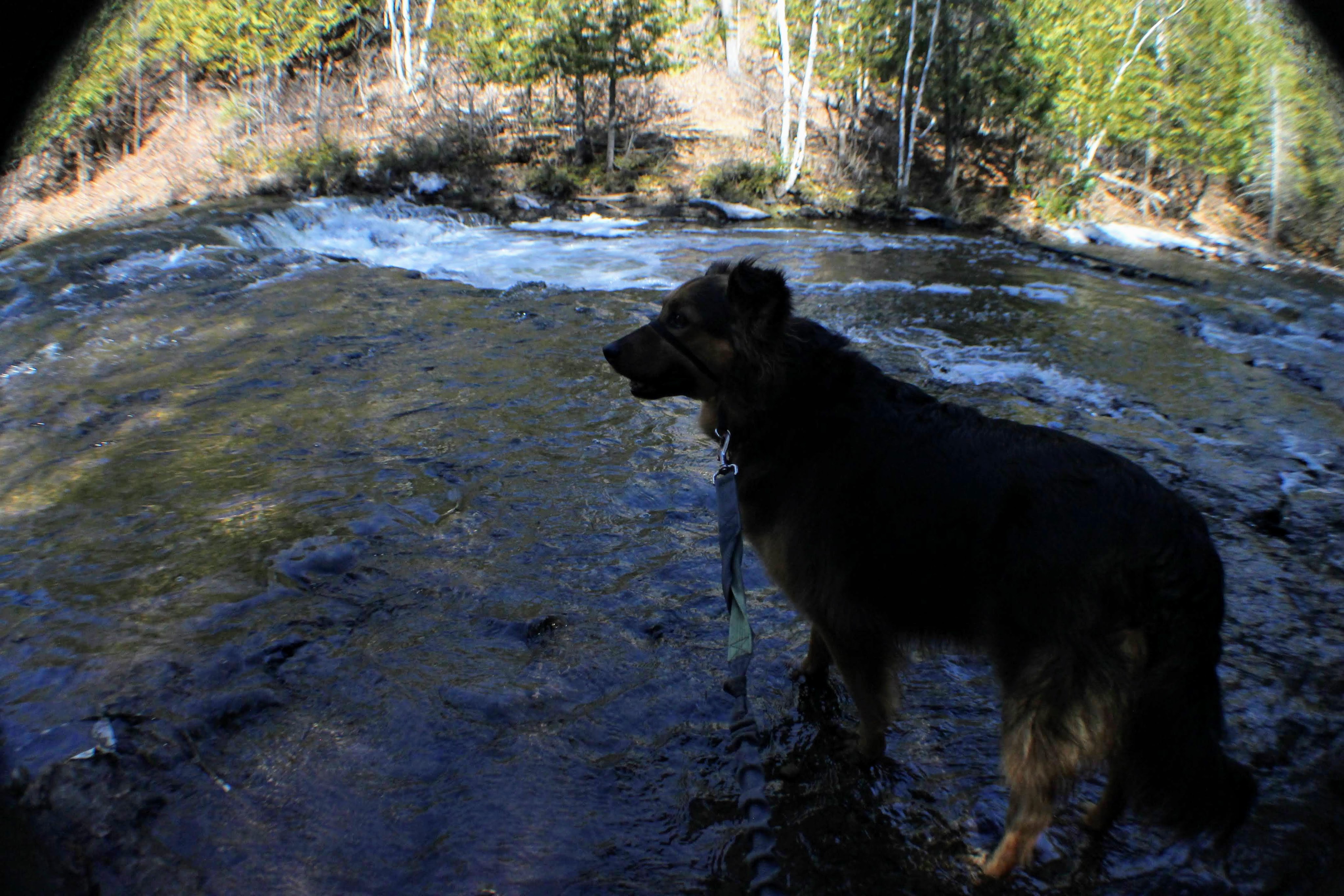 What could have been a 6 mile hike is shortened to 1 mile. With so many children and other dogs on the trail, Gobs anxiety is feeding into my anxiety and neither of us are enjoying the nature as much as we should be. We take the short paved trail to the main overlook. The falls are decent. For the largest falls in the lower peninsula, they’re pretty small. Gob is afraid to take a dip in the “rapids” beneath them.