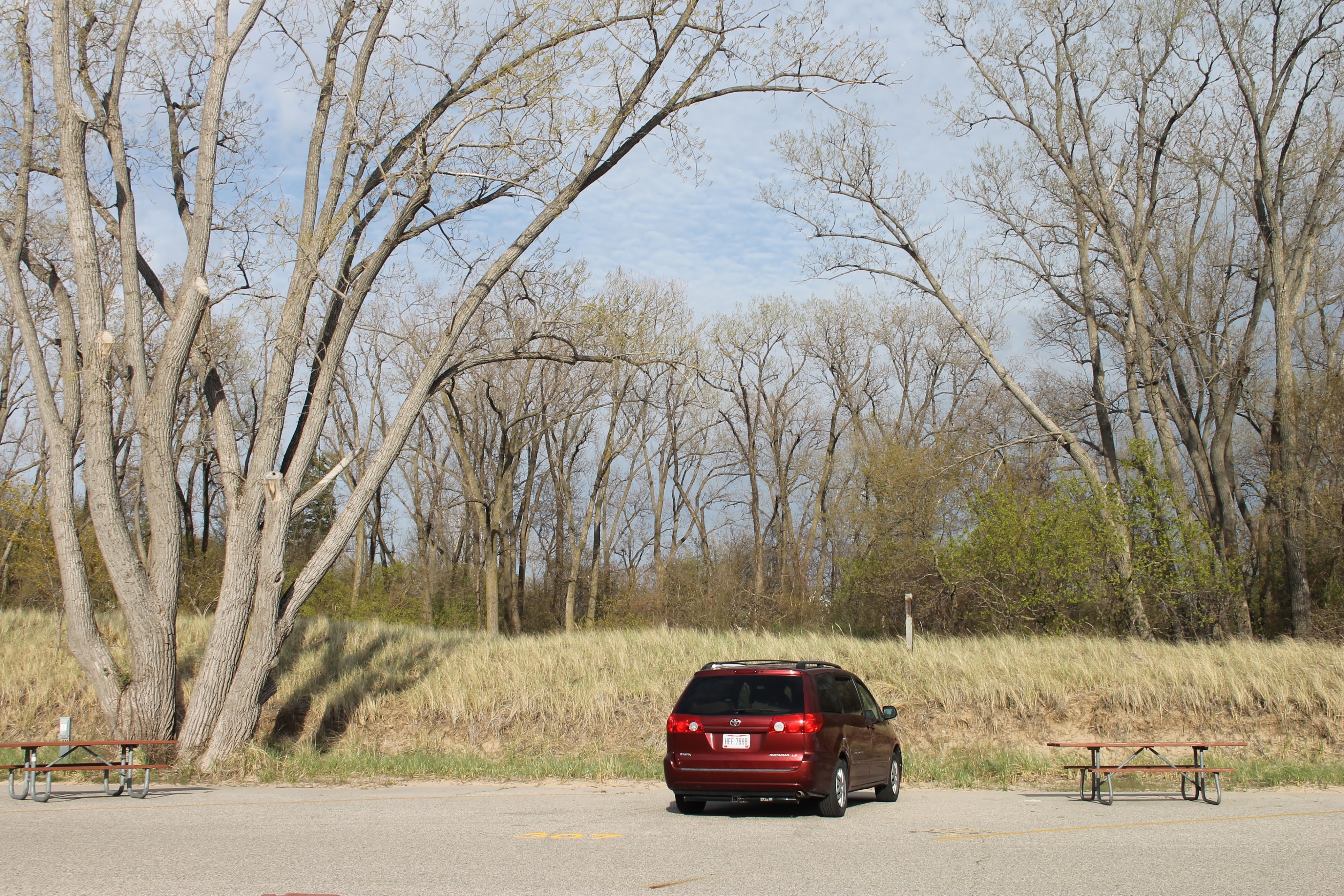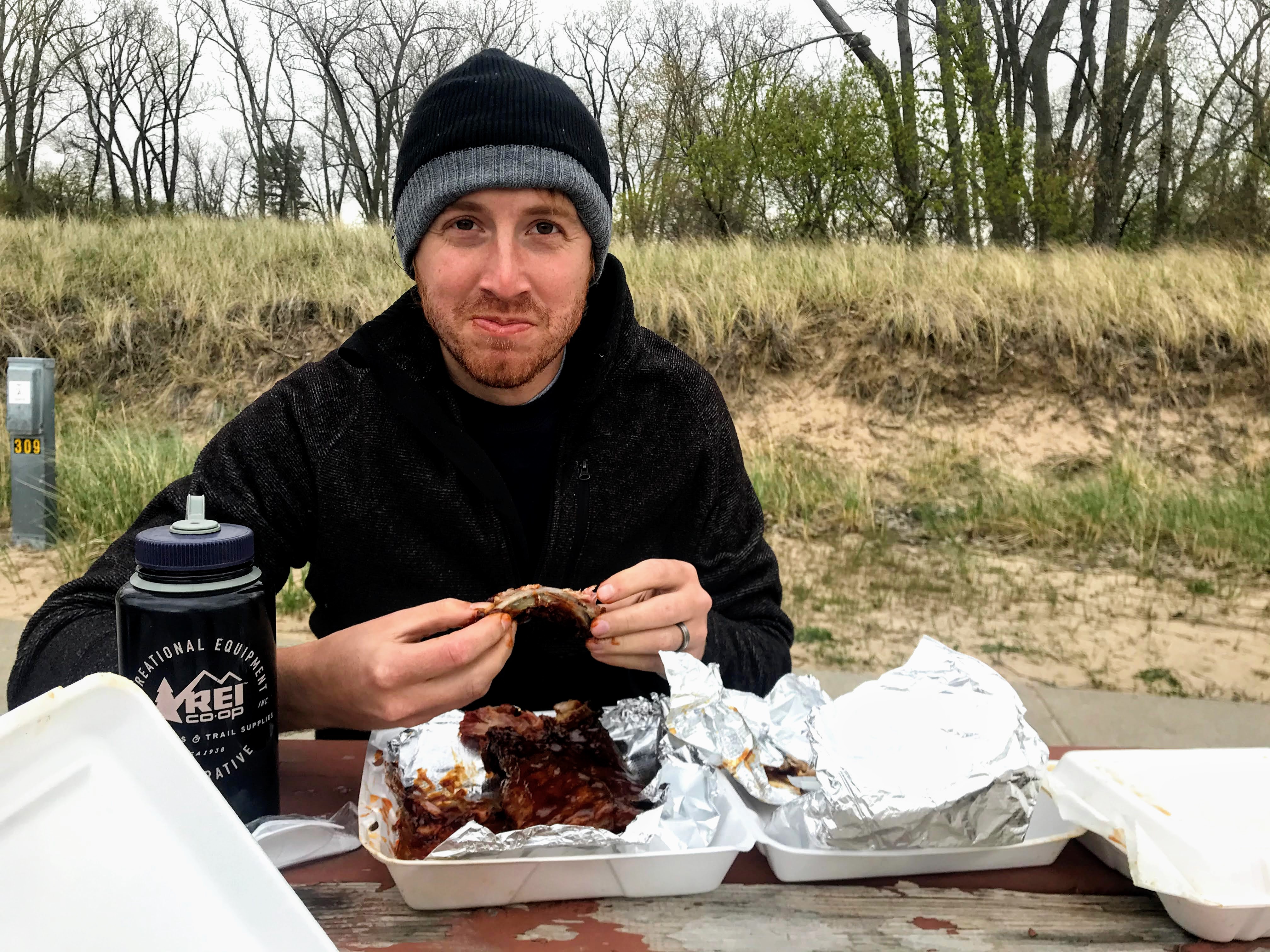 Famished, because we are always ready for our next meal, we pull into the campsite. Gob quickly scarfs his chicken and rice. Mason similarly scarfs his ribs.