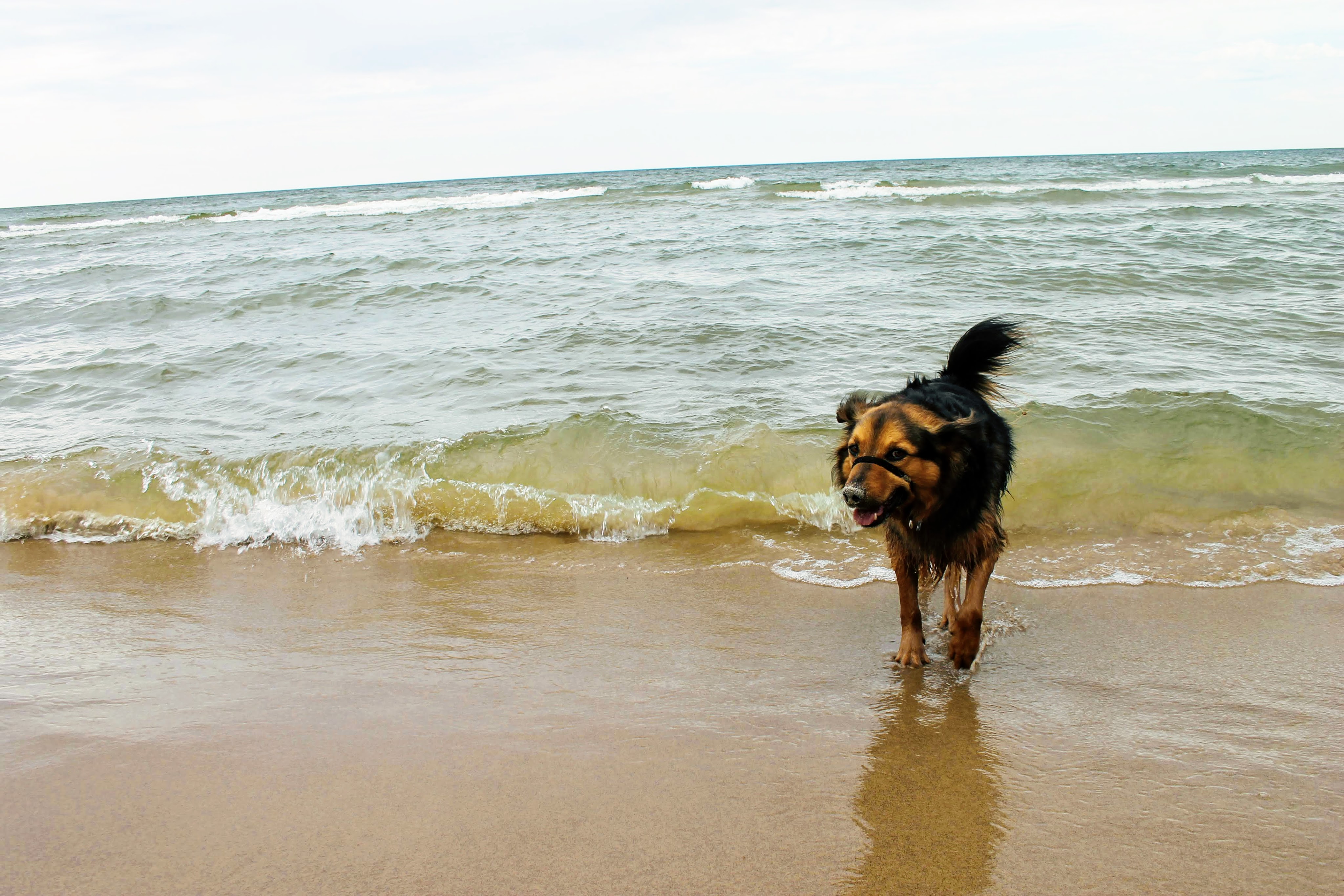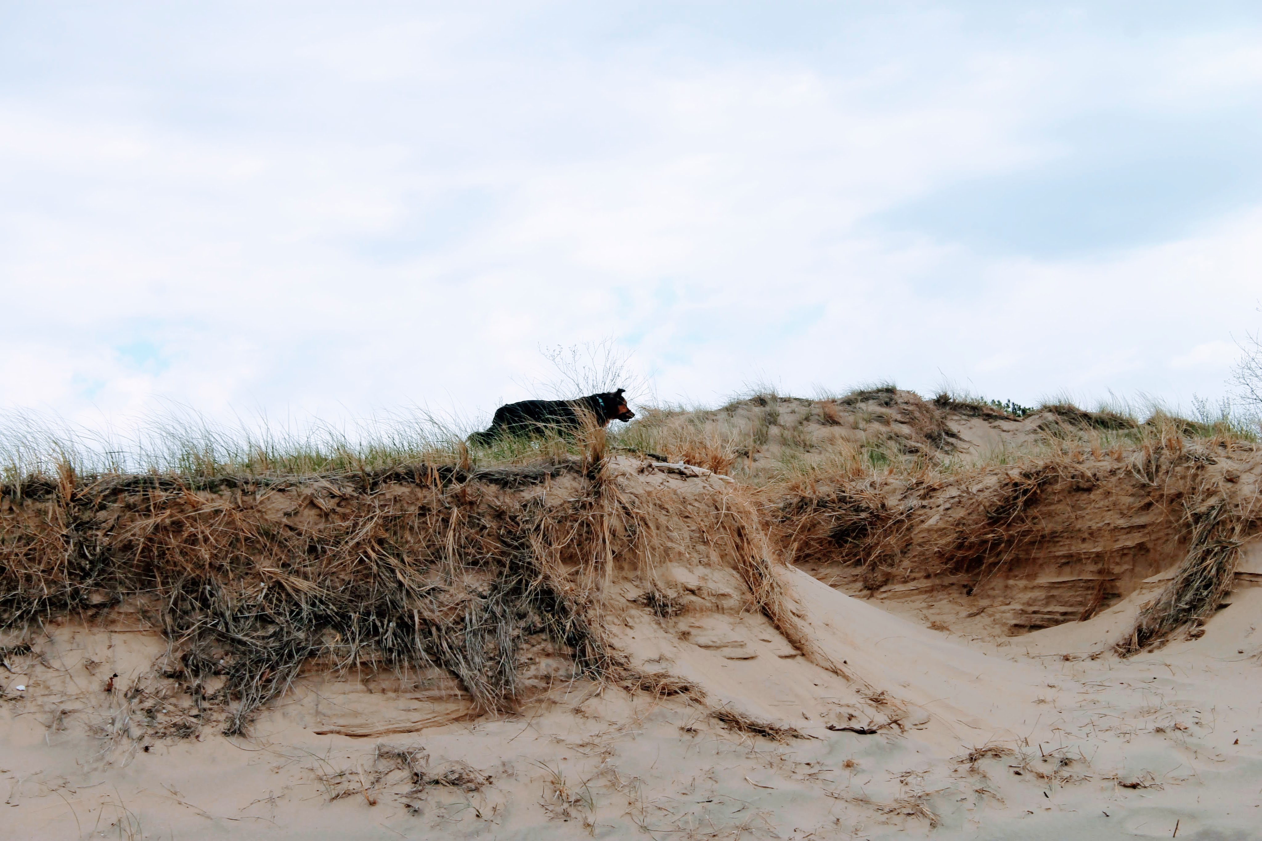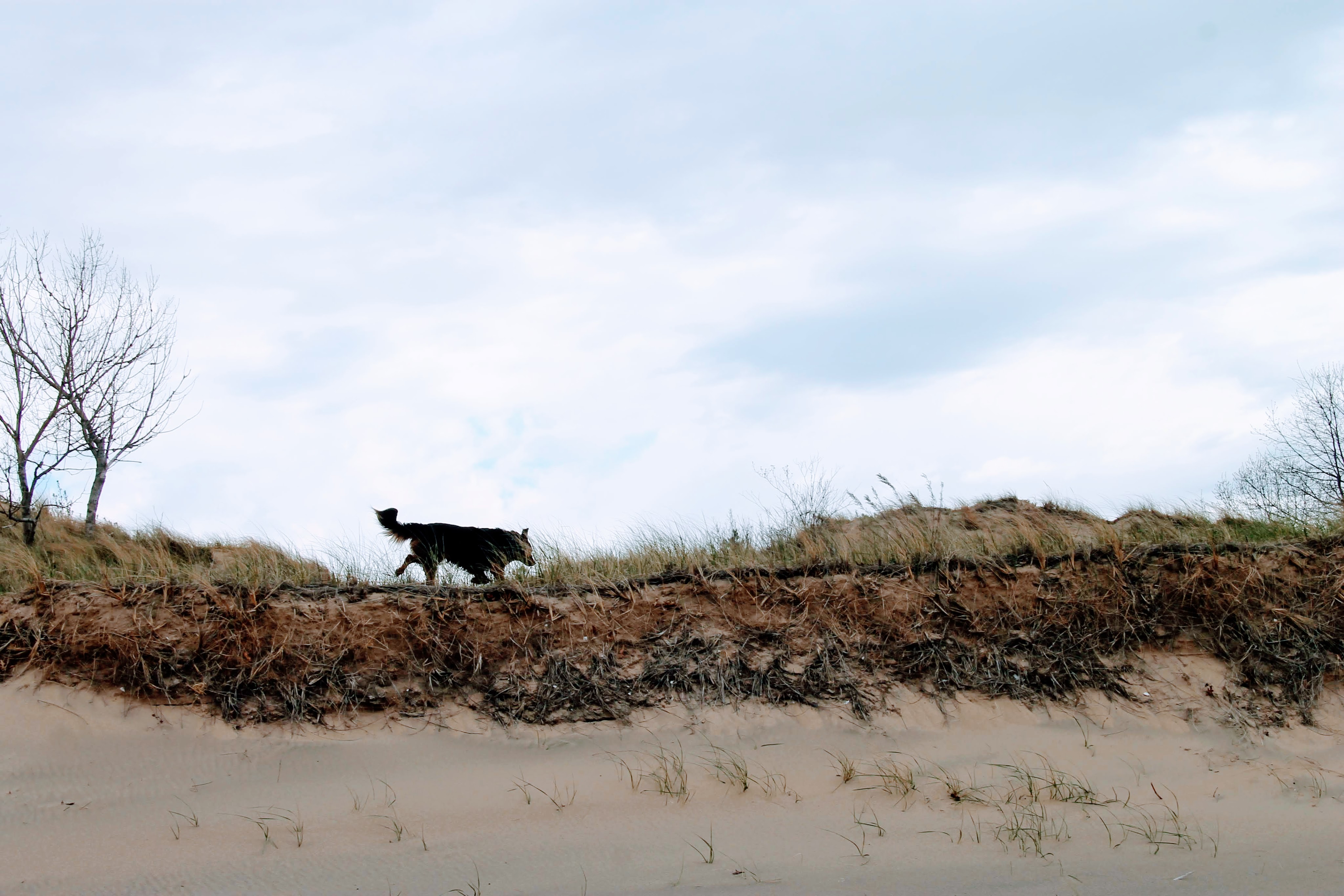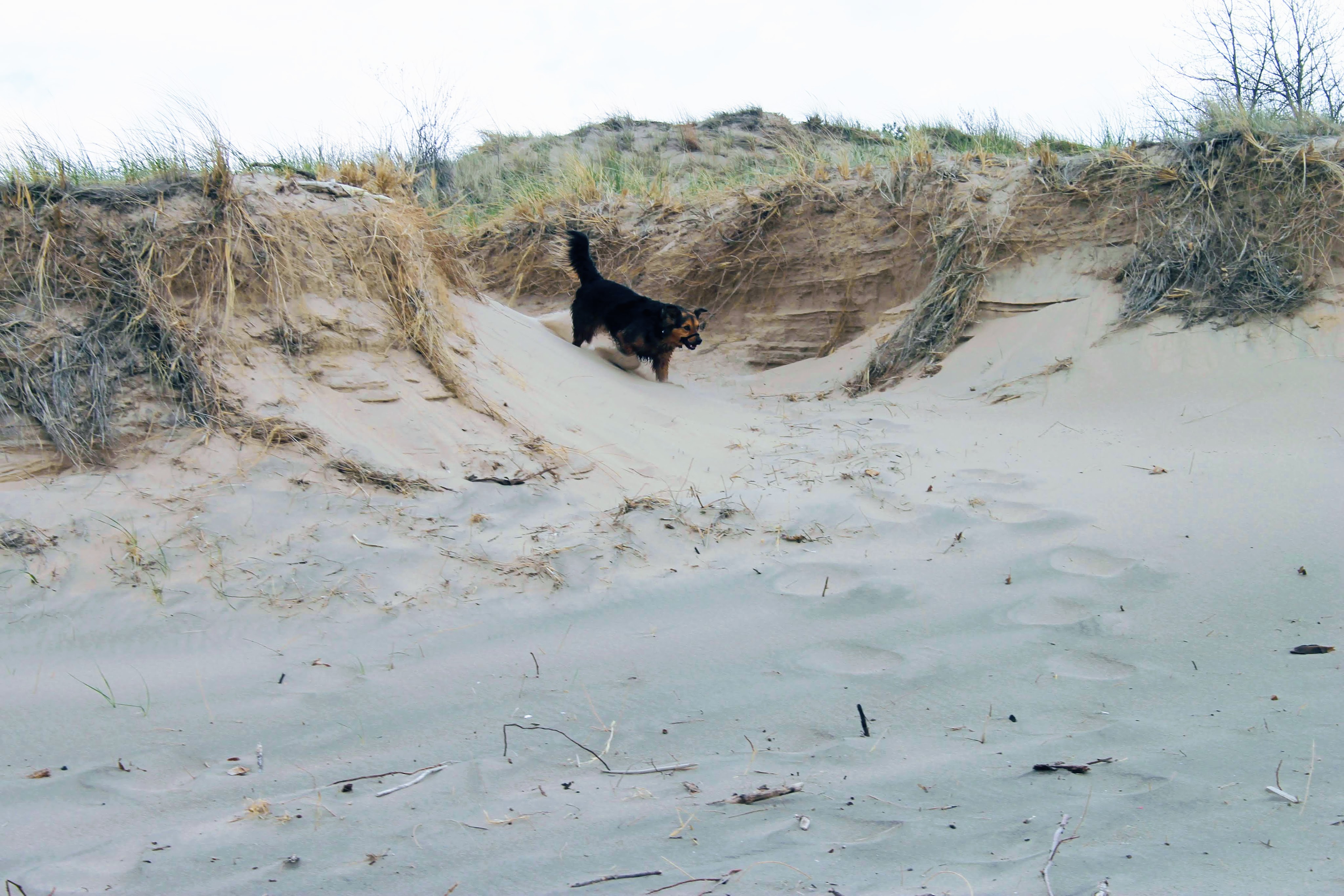 We climb to the top of a dune. Gob catches a whiff of lake and takes off.