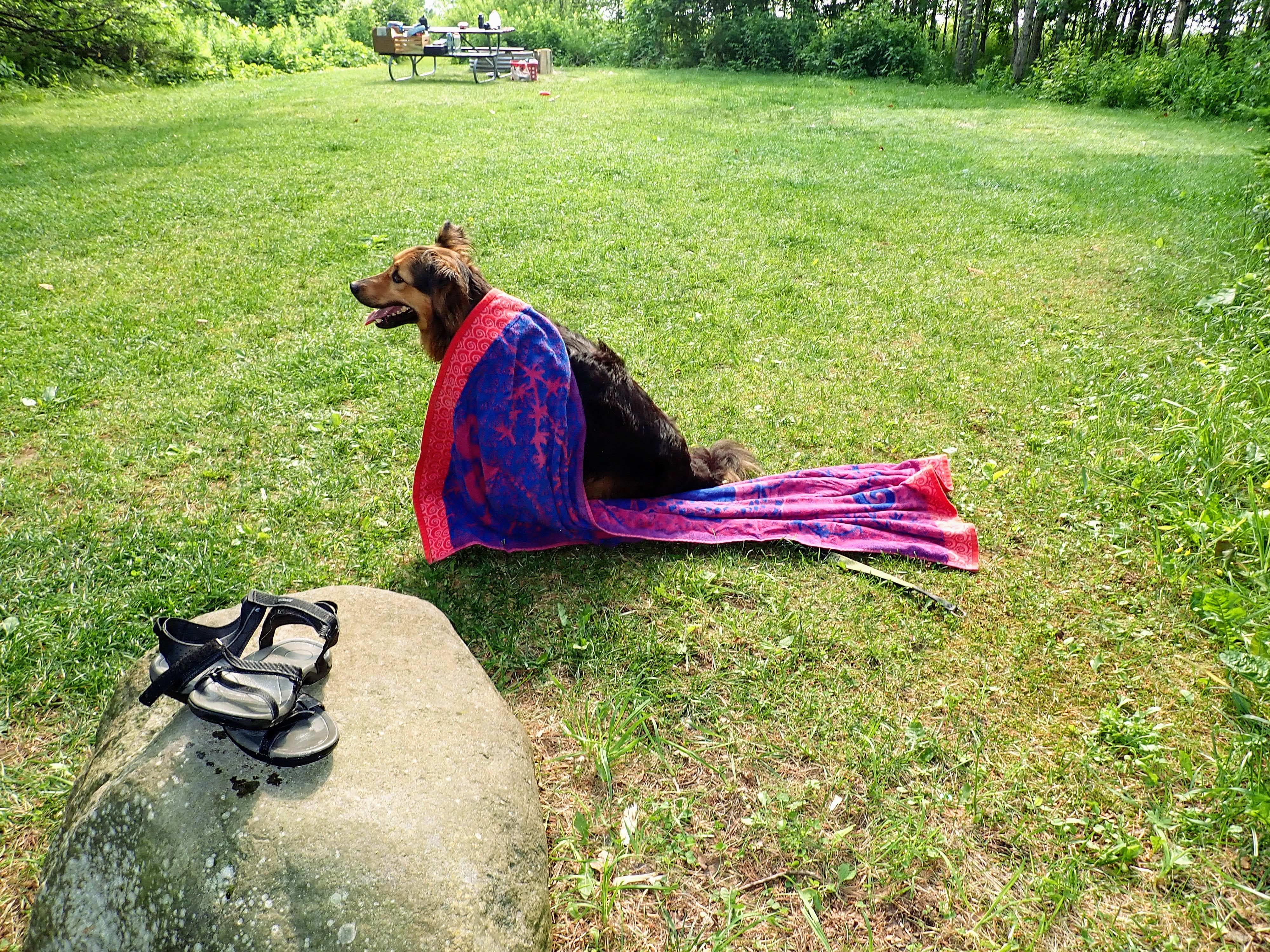 Gob once again wakes up for a morning swim at the crack of dawn. He knows there is a lake just a short path away from the camp. He is very unsure about a suspicious rock out in the lake and spends a few minutes barking at it before bravely walking out to sniff it. He ultimately decides it is ok.