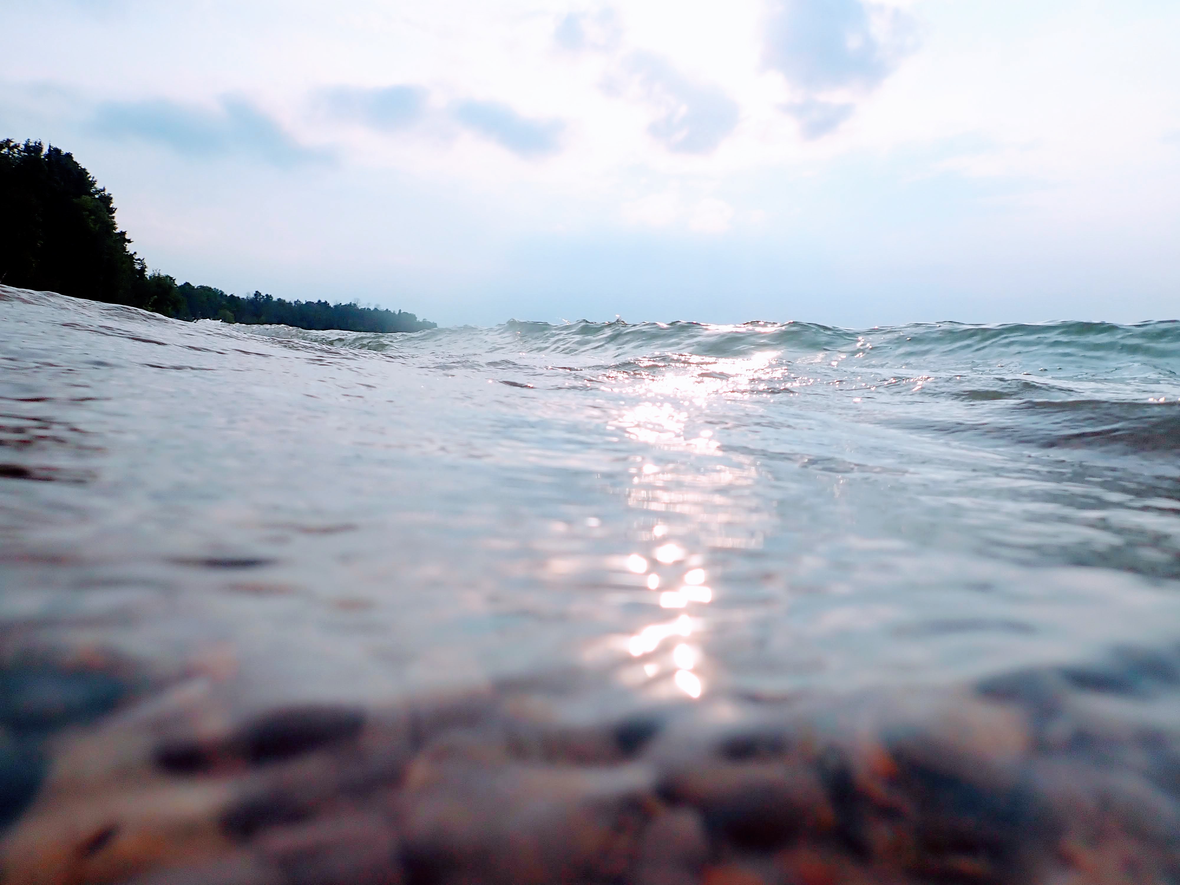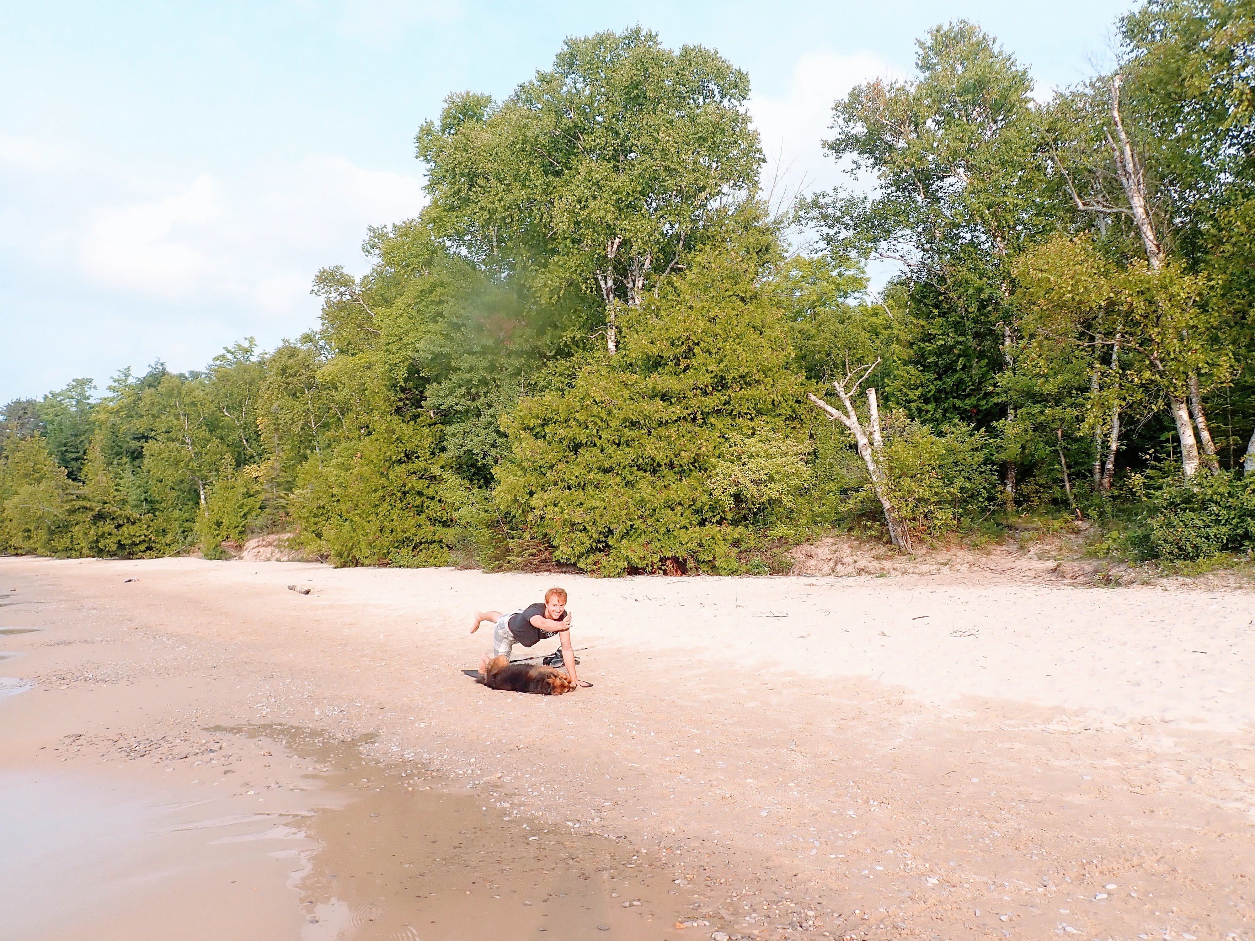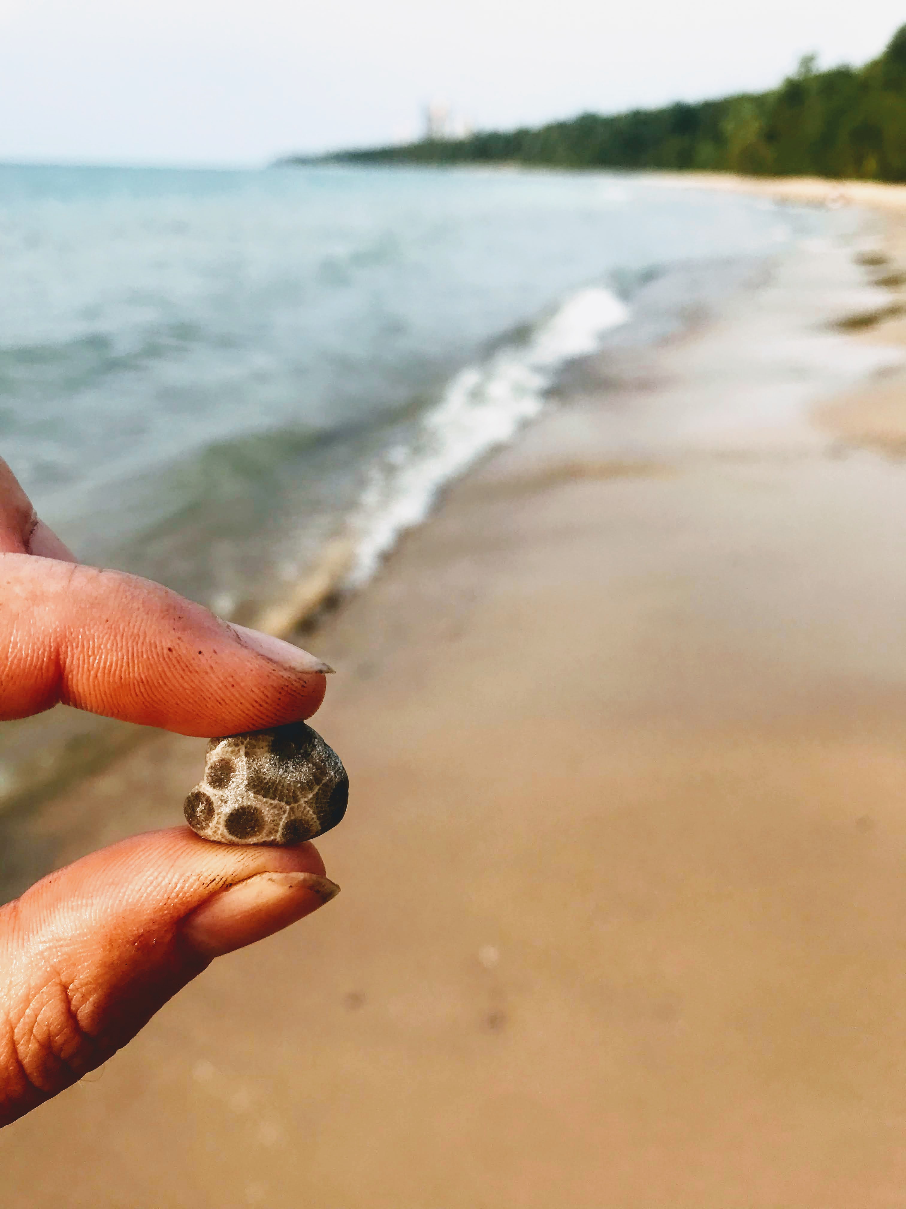 I walked south on the beach for a bit, but about halfway to my predetermined turn around point, I could hear Gob barking in the distance. He doesn’t like it when either one of us is too far away. I turned around. Every few steps, I would glance at the pebbles, keeping an eye out for the elusive “petoskey stone“. And believe it or not, I found one! And a few “charlevoix stones” as well.