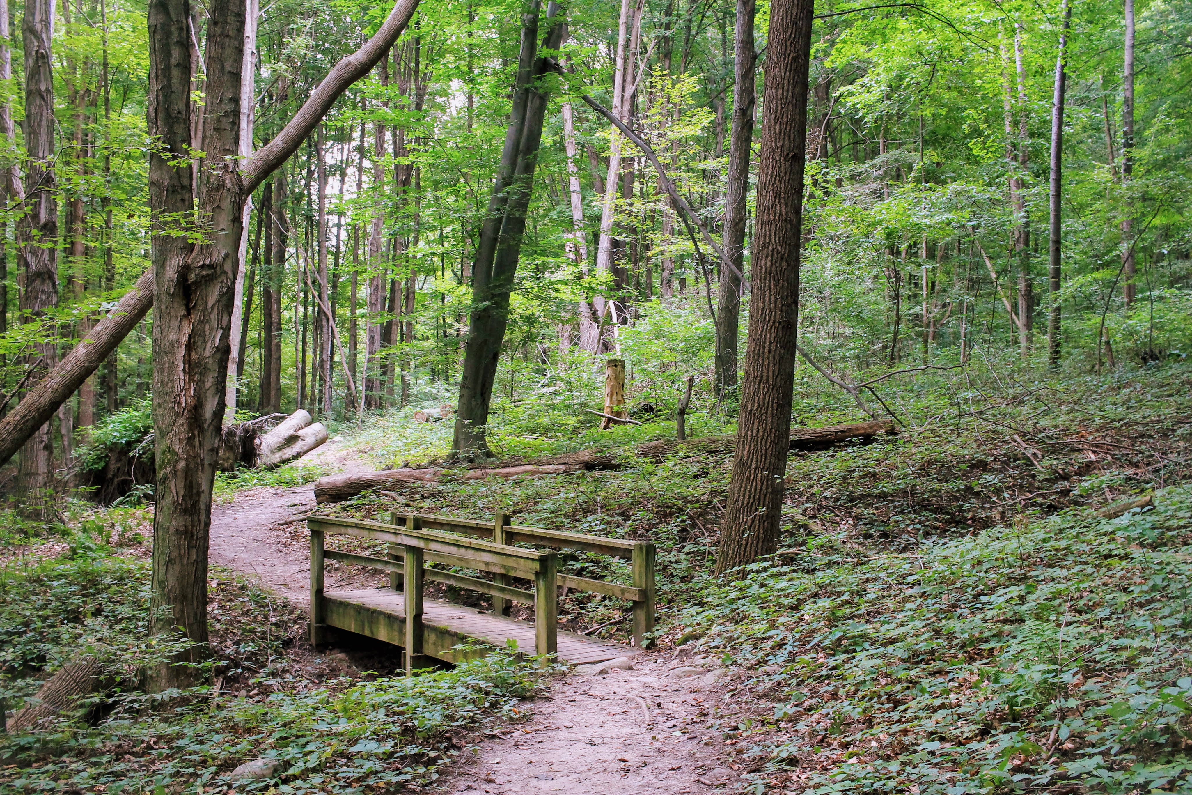 The roughly 3 miles of trail winds through a prairie still dotted with yellow blooms of goldenrod and the occasional purple cone flower. Then the woods welcome us back in. And within the woods I find a treasure trove of bridges.
