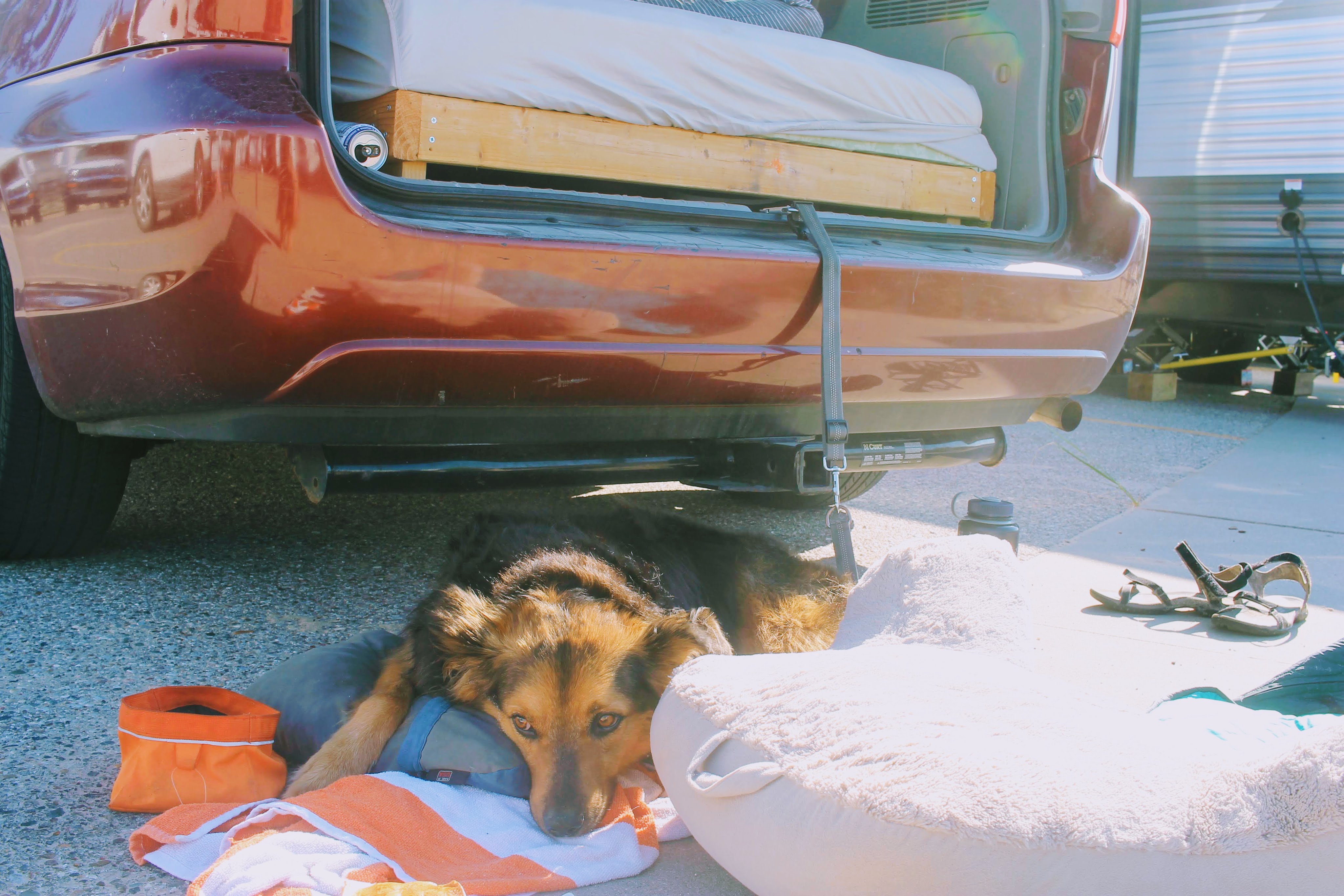 I can once again thank Labor Day weekend for a packed park. We pull into our campsite, which once again seems to be one of only a few empty ones. It’s truly just a parking spot with a small stretch of sand behind. Gob doesn’t care. As soon as I open the door, he is in the shade of the car, fast asleep on the asphalt. I lay a blanket and pillow out for him, but he ignores the gesture.