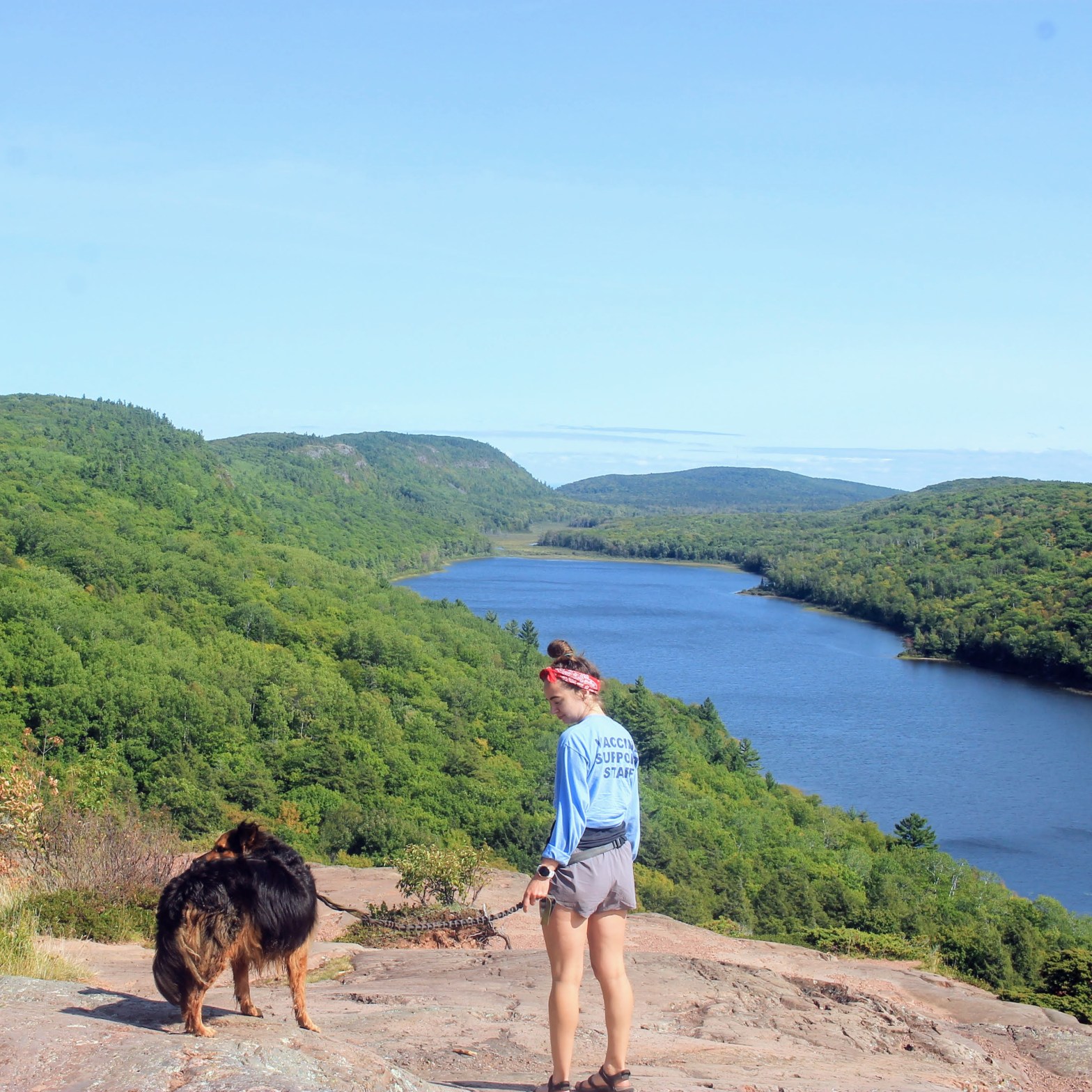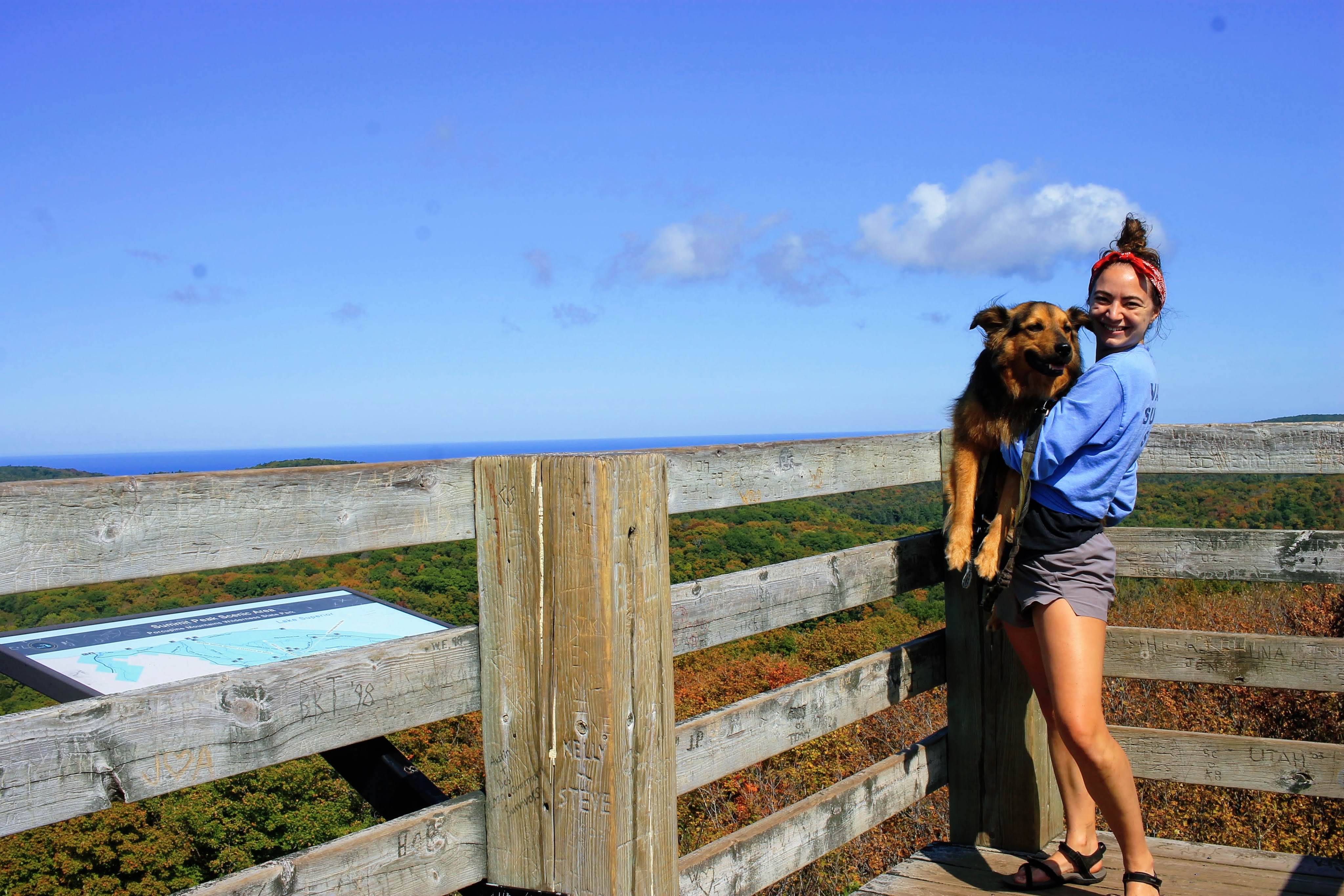 Finally back on the trail, Gob is a trooper climbing up the observation tower. I think he feels guilty, because he even semi-tolerates being picked up for a selfie. He does not appreciate the view as much as I do.