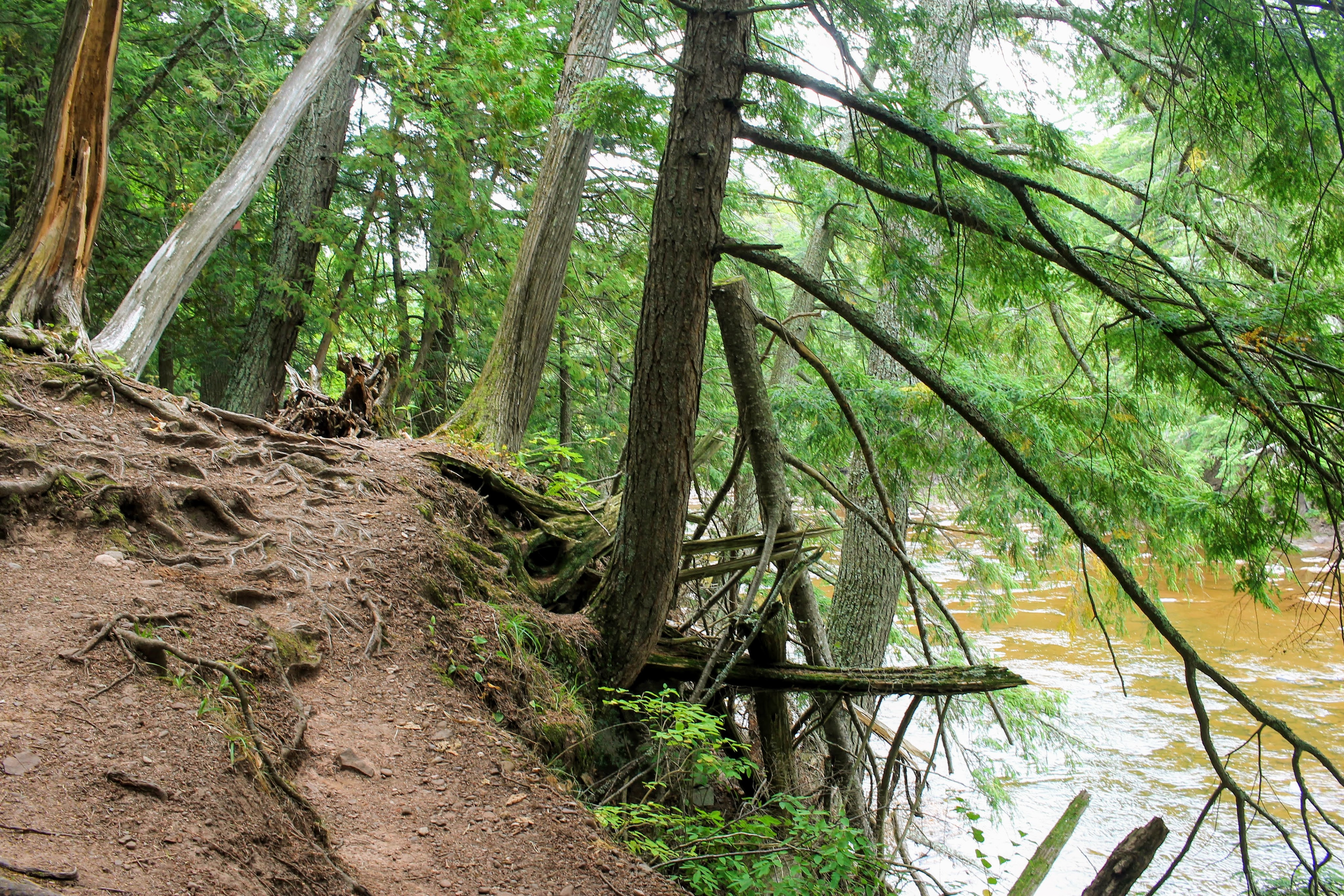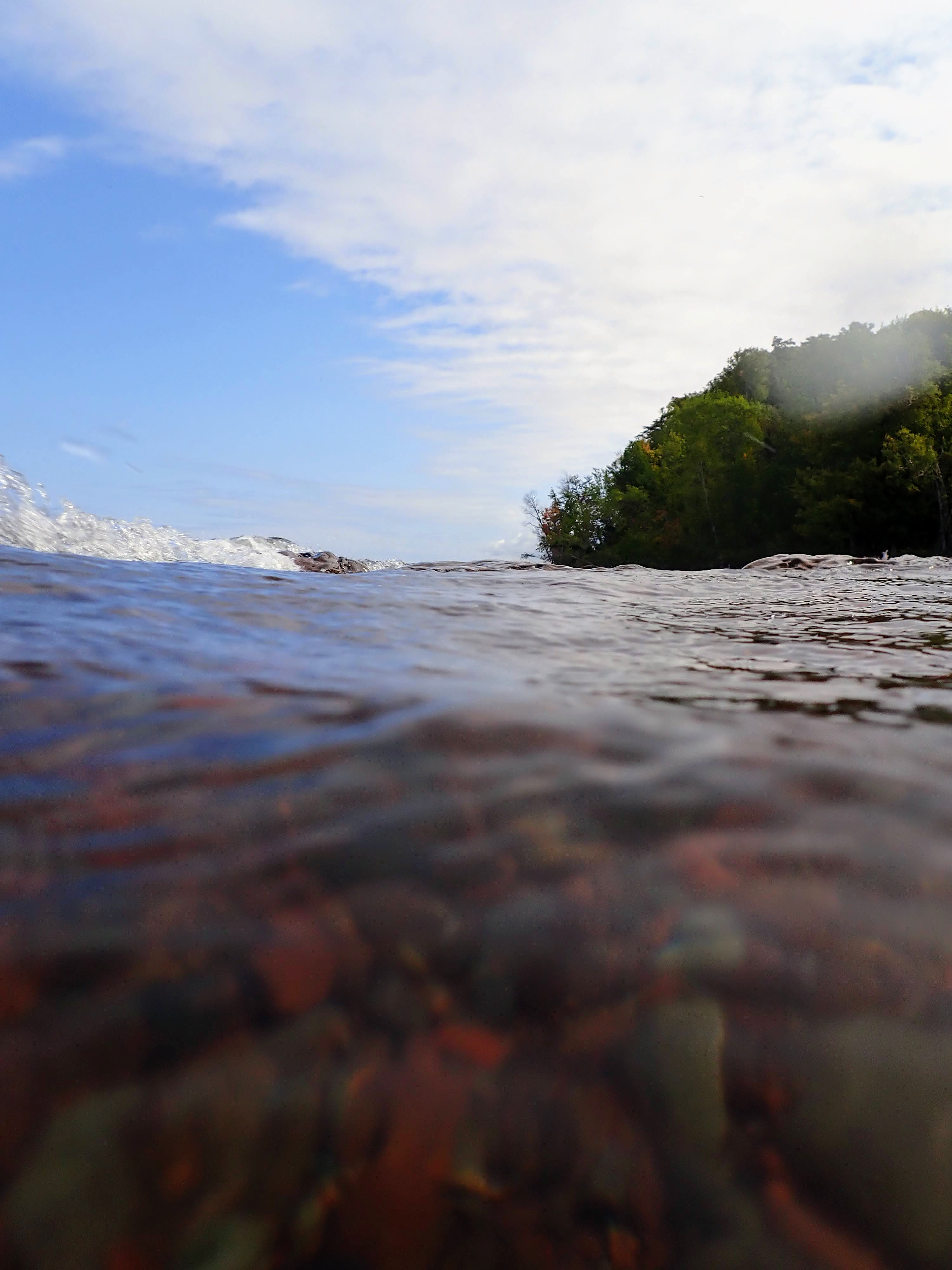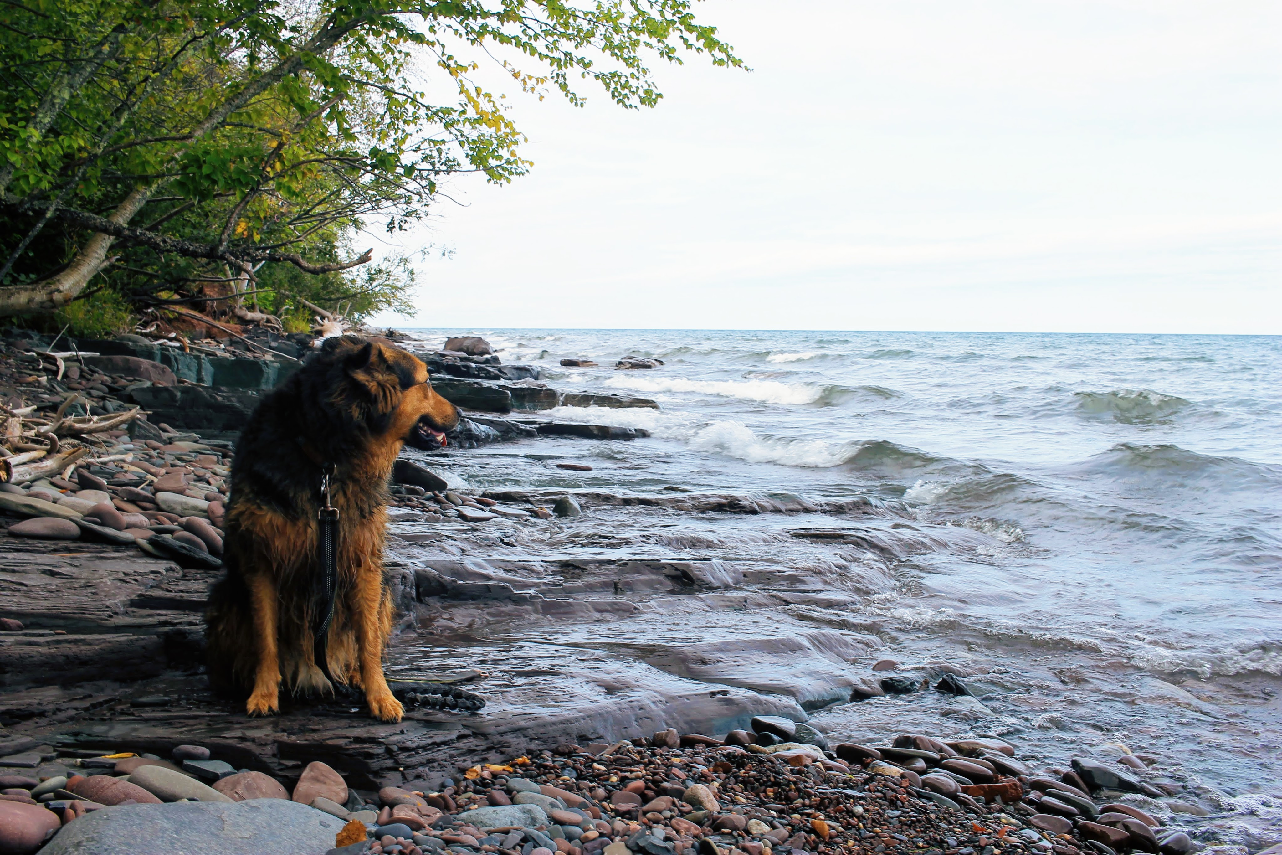 Eventually the dirt path turns to a boardwalk, then the boardwalk turns into a bridge leading across the river to form a loop. A small trail splits away from the bridge, seducing us towards Lake Superior. We follow as though we had a choice. A father and two sons are fishing at the mouth of the river. Gob hops along the shore with abandon. I caution him that he needs to watch his footing. These rocks are slippery after all. No sooner are the words out of my mouth than I find myself suspended in midair having banana-peel-slipped. I land with a thud and already a bruise is forming. A reminder that I will surely break a hip if I continue these explorations much beyond my youth. Gob comes to check on me with a big puppy smile on his face. His way of laughing at me I’m sure.