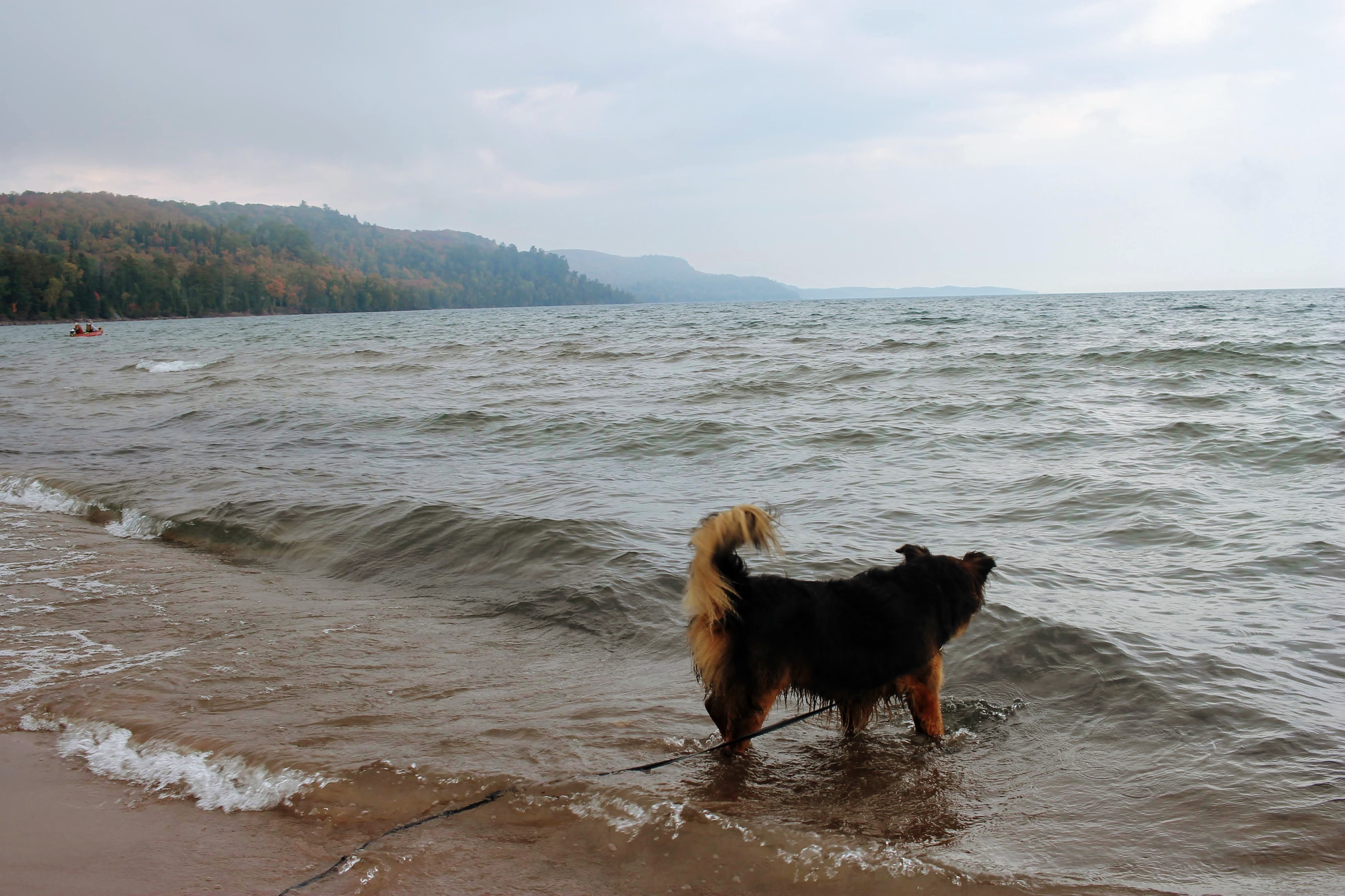 Gob takes a quick splash and chases the waves before we continue our trip.