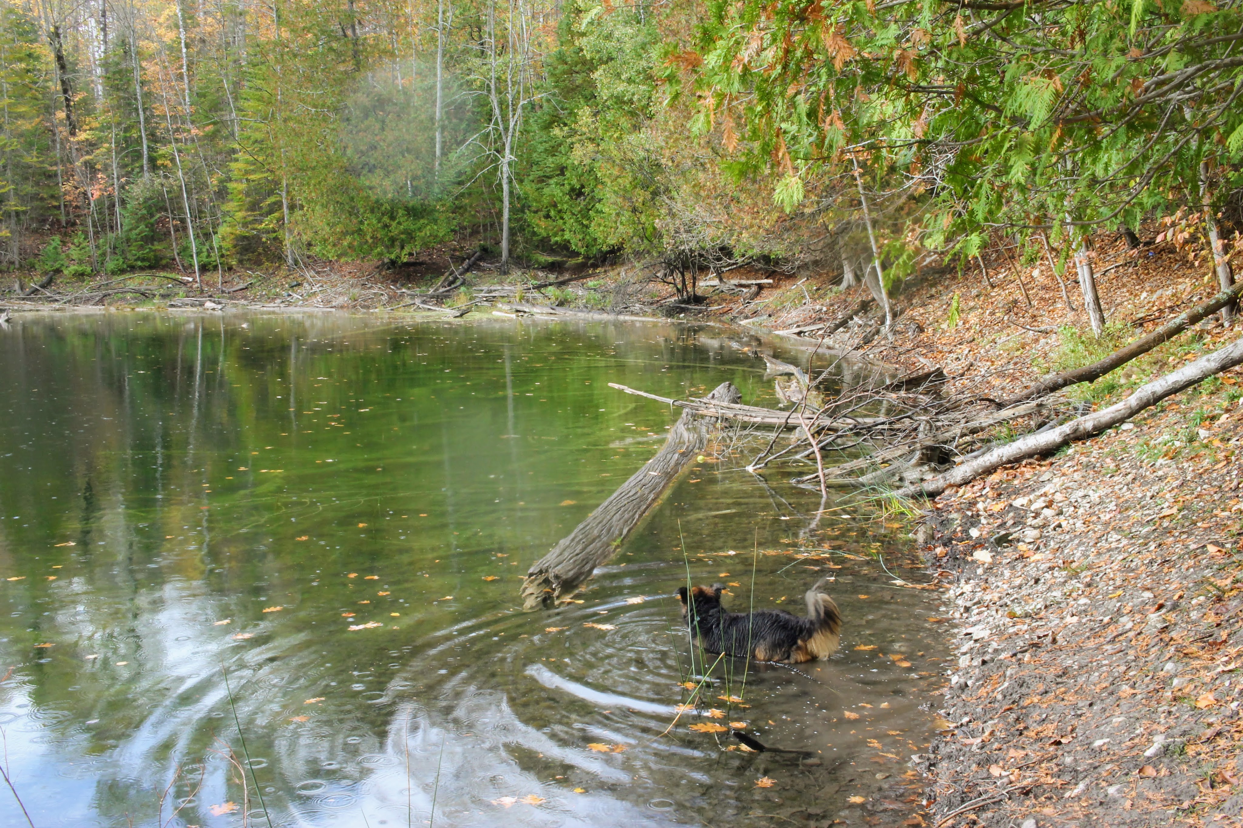 As we near the sinkhole, the rain lets up again. The sun warms us. Enough so that Gob is ready for a dip in the sinkhole when we finally arrive.