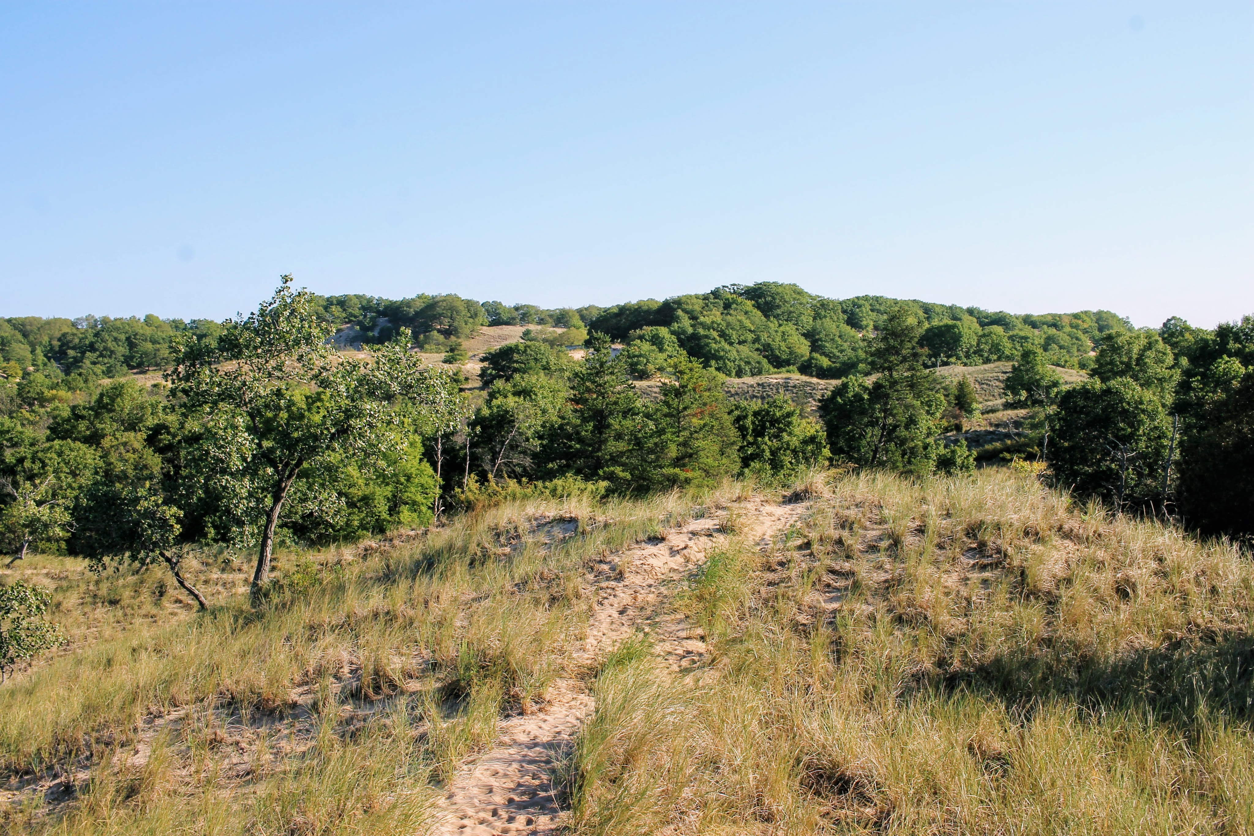 But as we reach the midway point of our loop and turn back towards the car, we also depart from the water. The dunes are immediately taller. And I am thankful we are doing this at 9:30 AM and not later in the day. Already the sun is beaming down without a cloud in sight, and I am sweating. Gob is drying quickly from his dips, but so far seems unbothered by the heat. My calves burn as we scale the dunes to reach the ridge. The views are worth it though.
