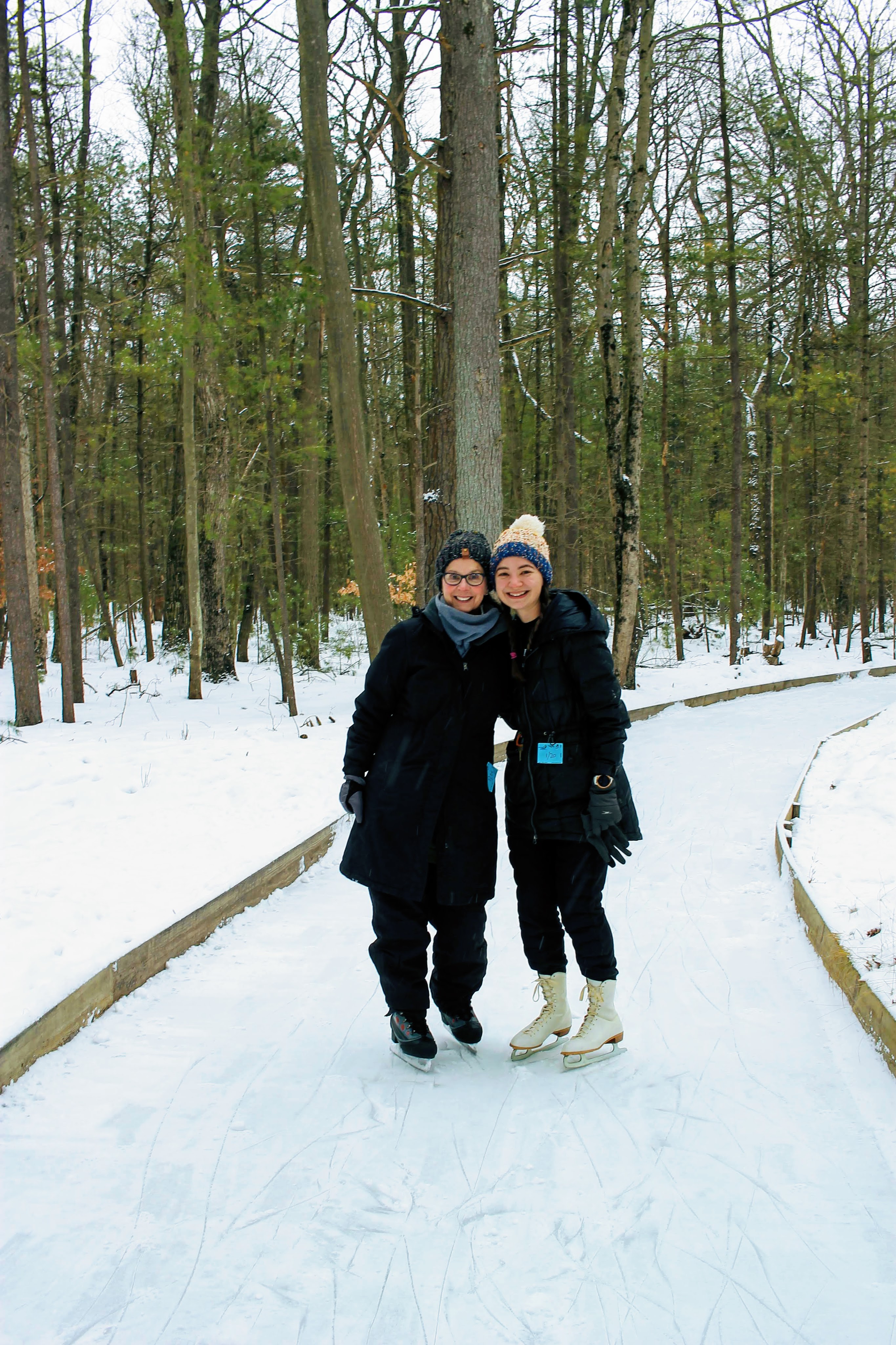 We hop out of the car and straight into a winter-wonderland-snow-globe scene. Layers of puffy snow pants are added in preparation for the numerous falls we fully expect to occur. And finally, the skates are laced up. On shaky legs, we make our way out of the warming tent and onto the trail.
