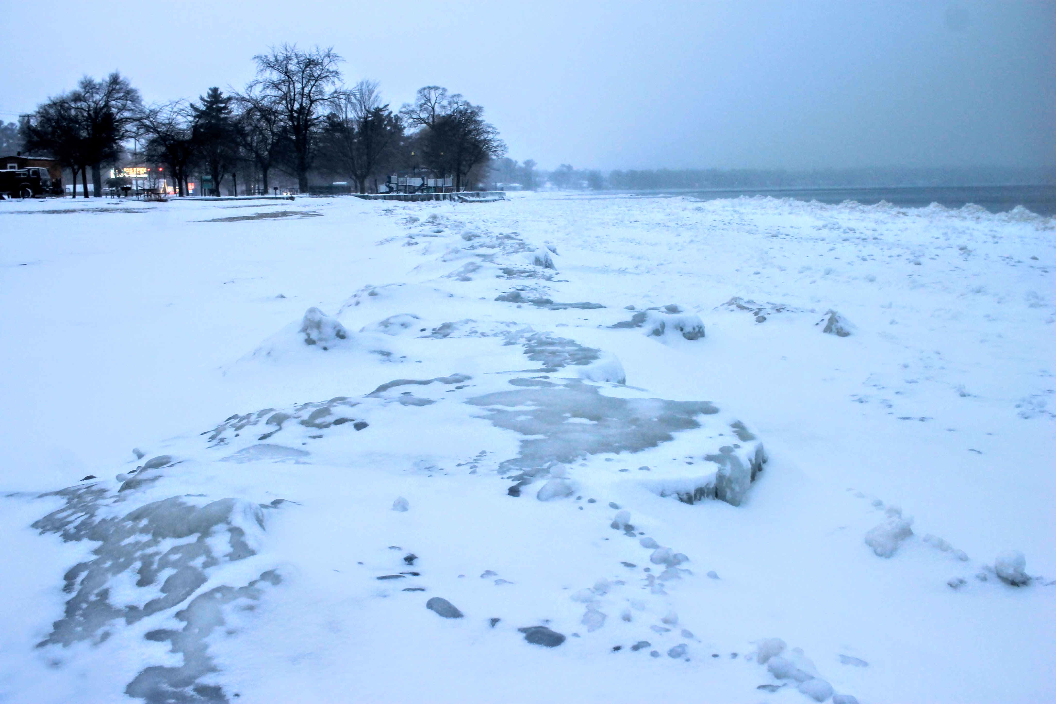 In the true spirit of a Michigan winter, we wake up in a winter weather advisory. Falling snow fogs out any hope for a sunrise. And as should come as no surprise, we are the only ones taking a morning walk on the beach. Or, maybe morning walk on the water would be a better descriptor because I’m fairly certain there was no sand beneath that snow.