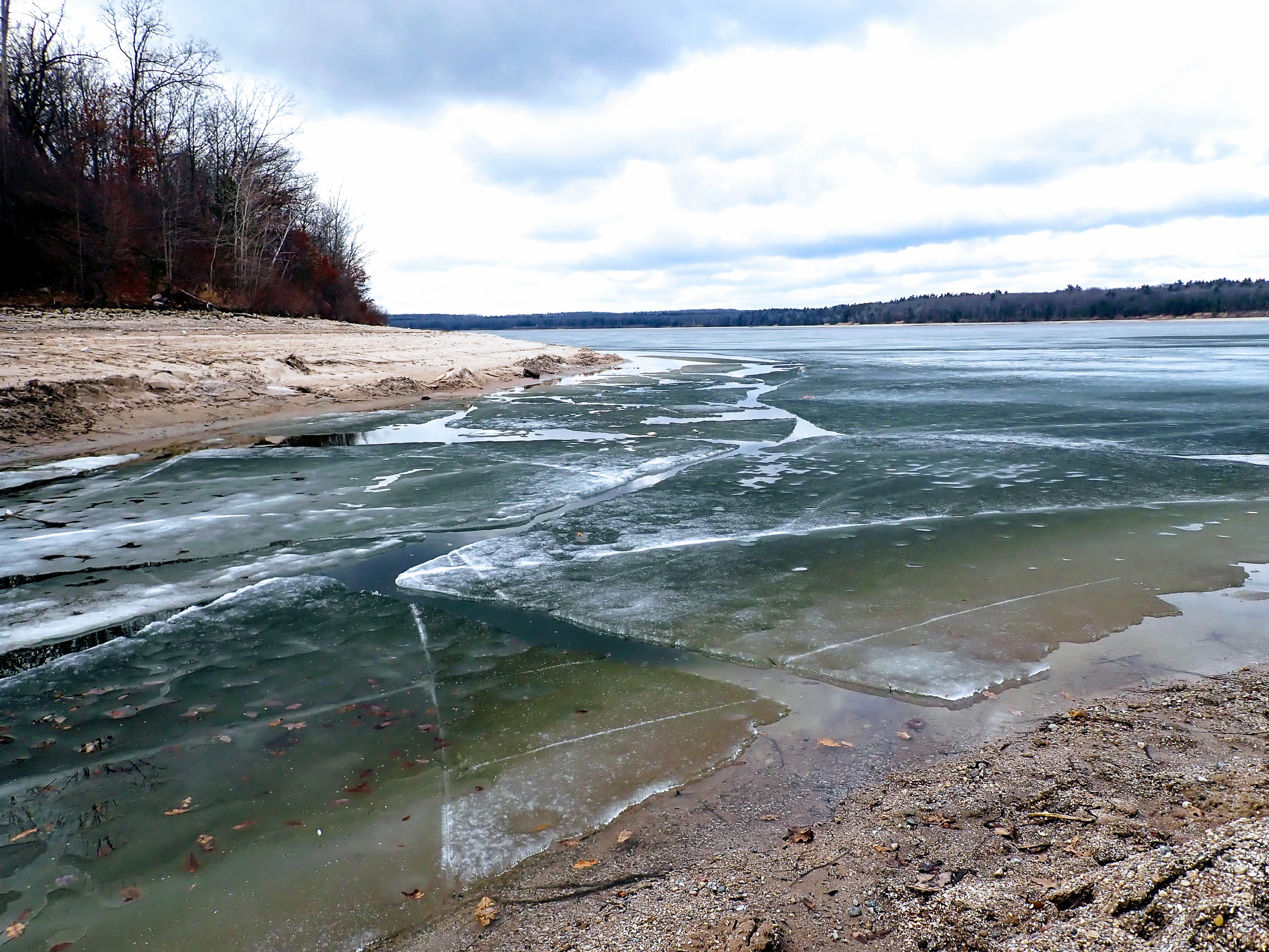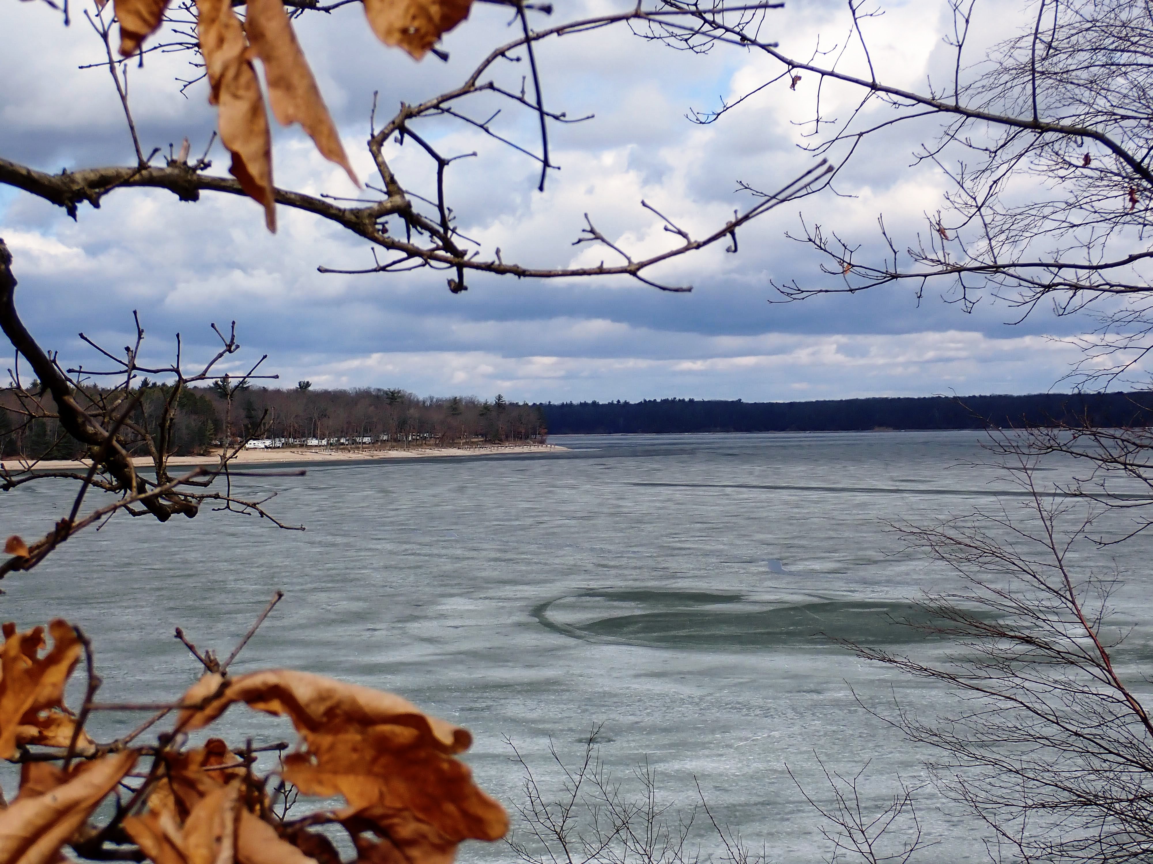 We emerge from the woods and decide to take a walk on the sandy beach. Sure there is still lots of ice on the water. And it is barely above freezing. But the sun is out, and I can see some blue amidst the clouds, so I will pretend.