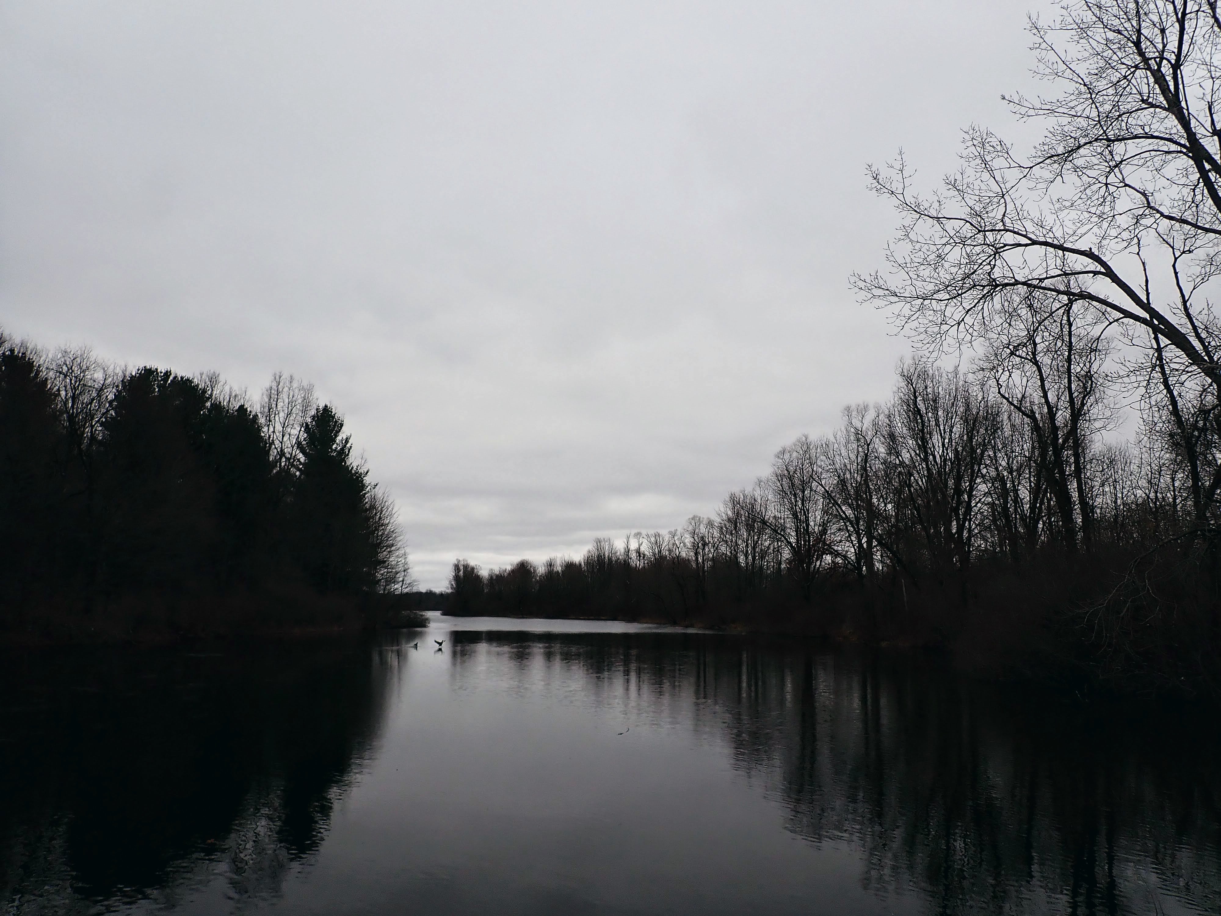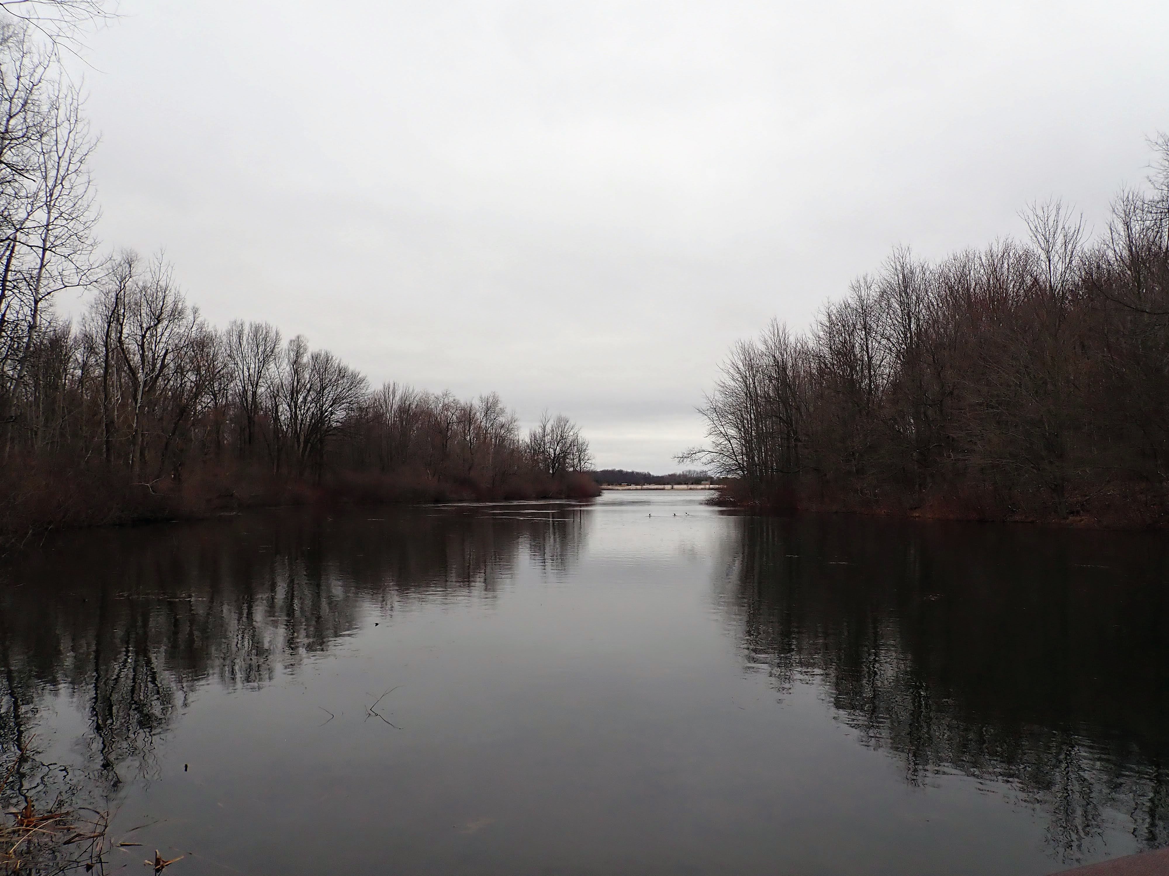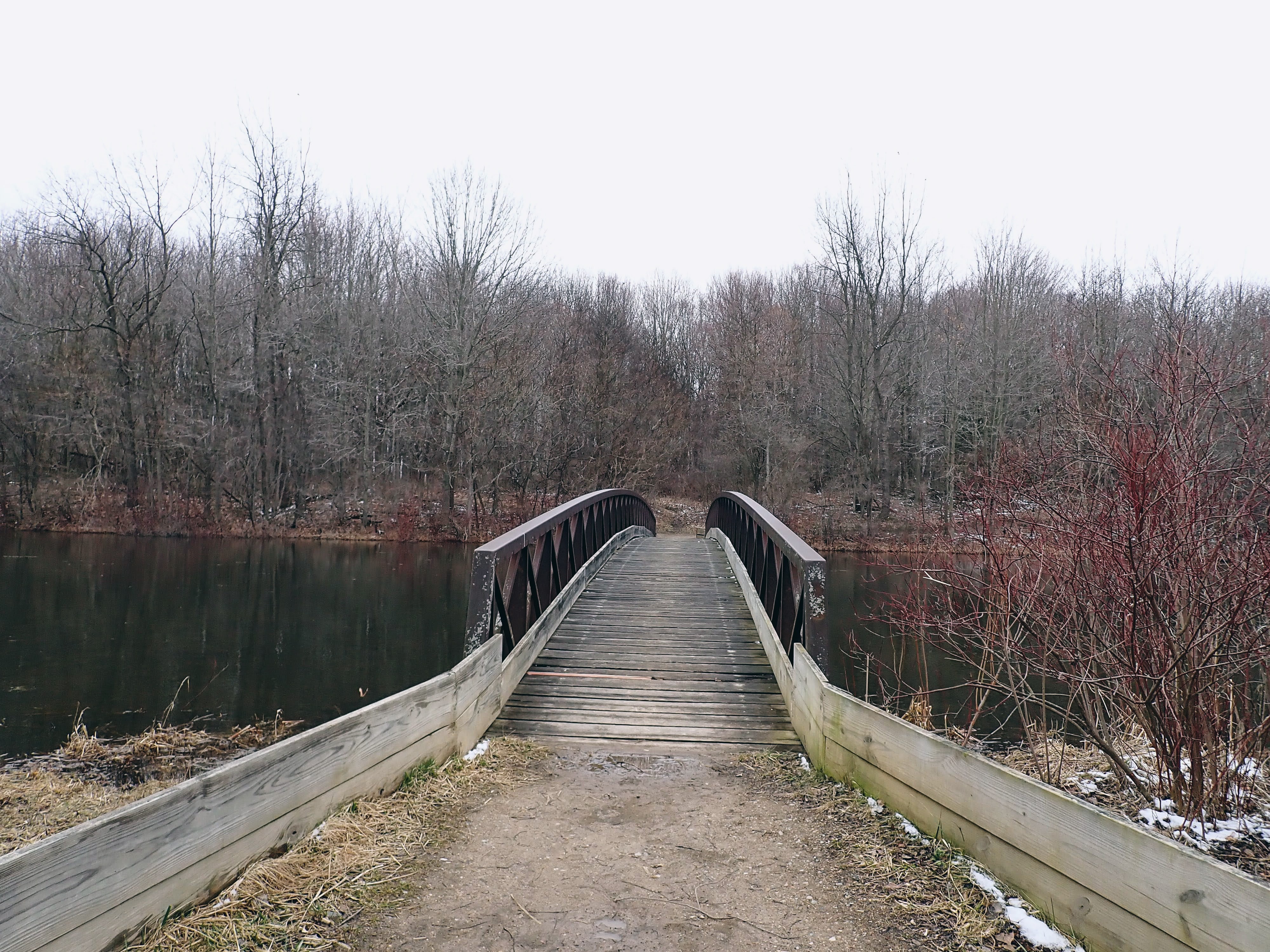 Feet/paws soaked, we reach the bridge to the island. In warmer weather, Gob would have tried to swim the gap. But he happily plods along beside me to the other side.