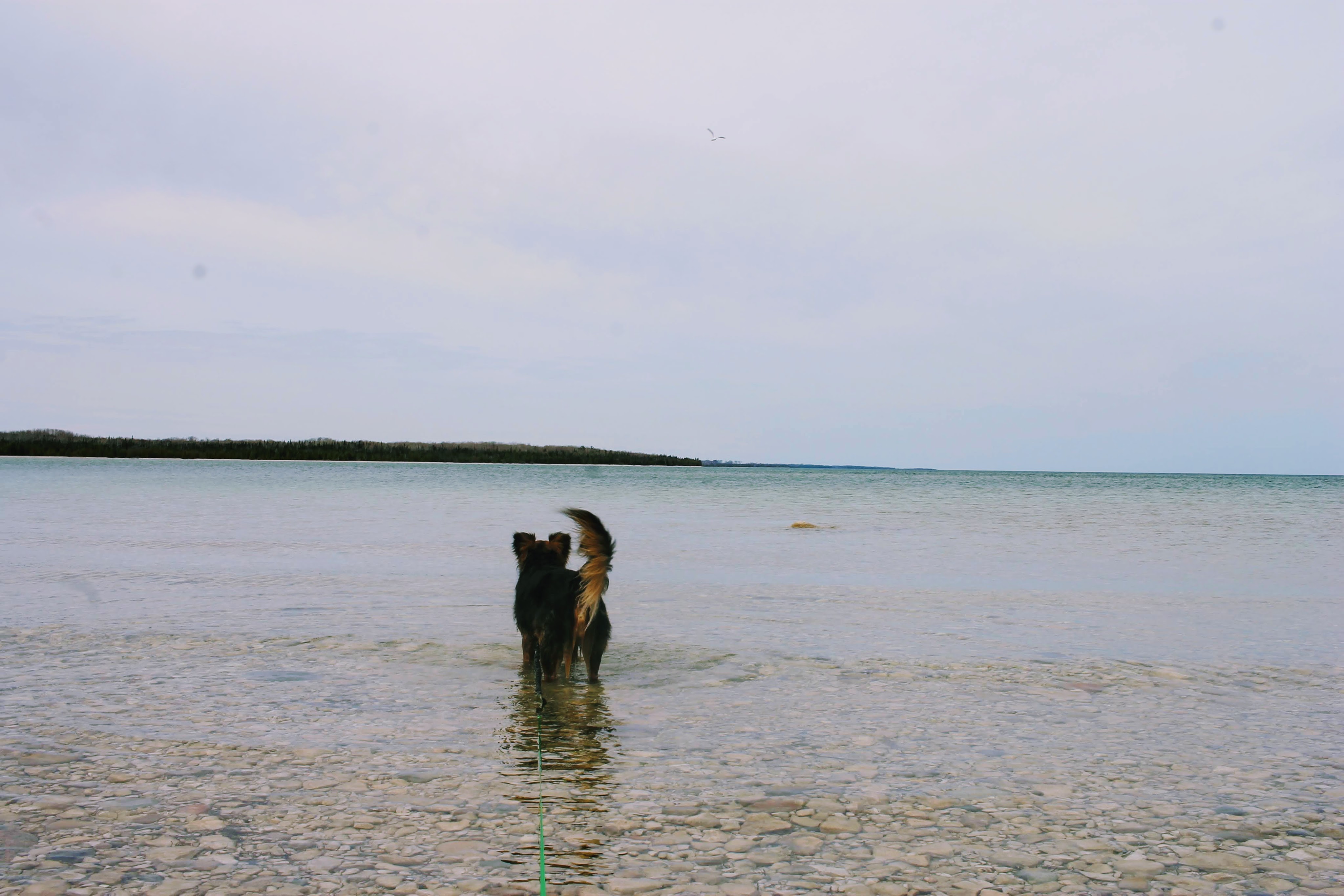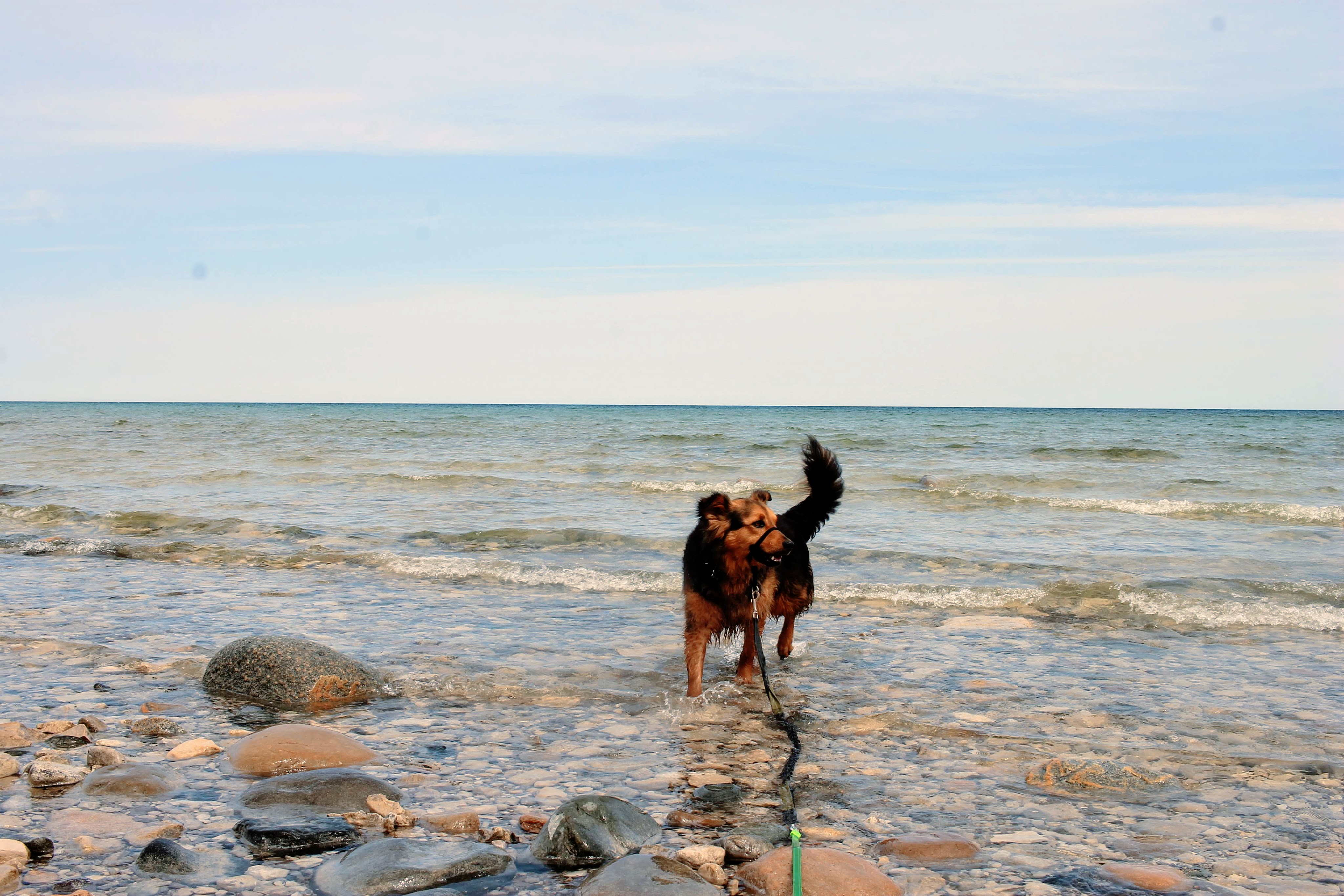 A mere 30 minutes down the coast and this beach is devoid of sand, instead covered in smooth stones. Gob is not a fan. He dips his toes and belly in the water, but otherwise sticks close. No charging the waves.