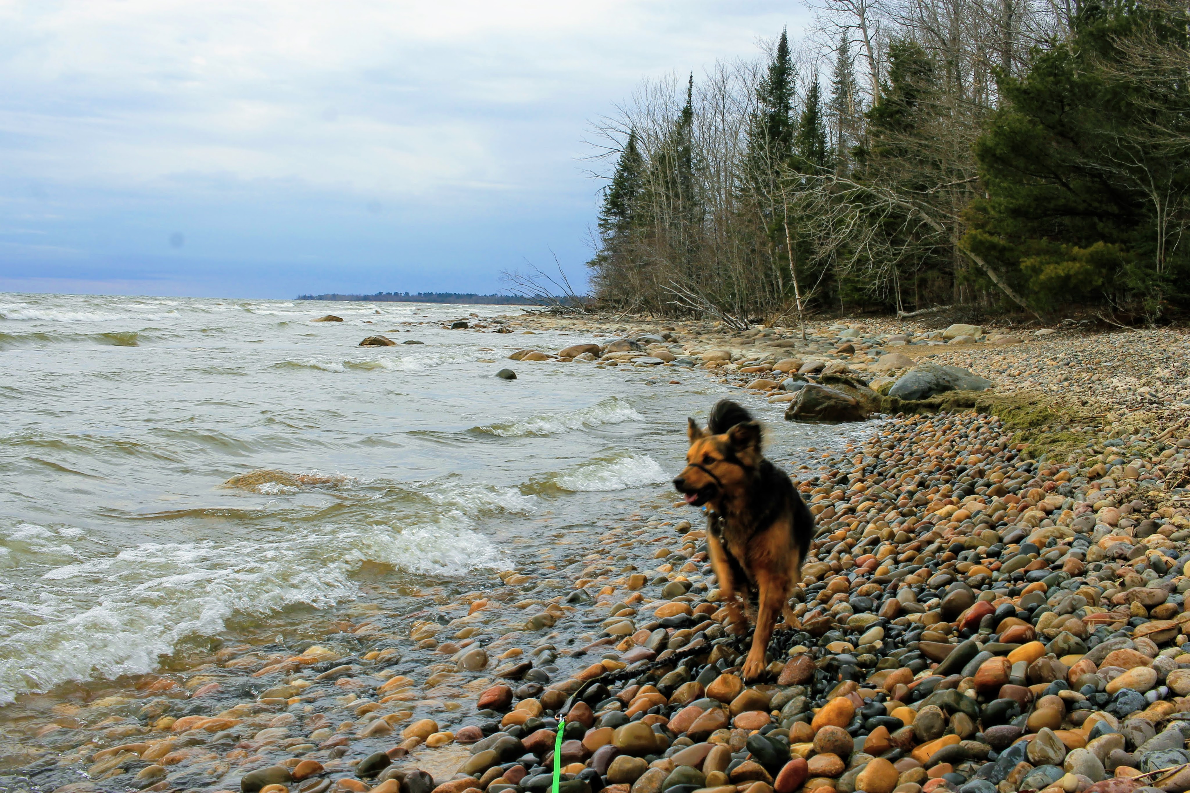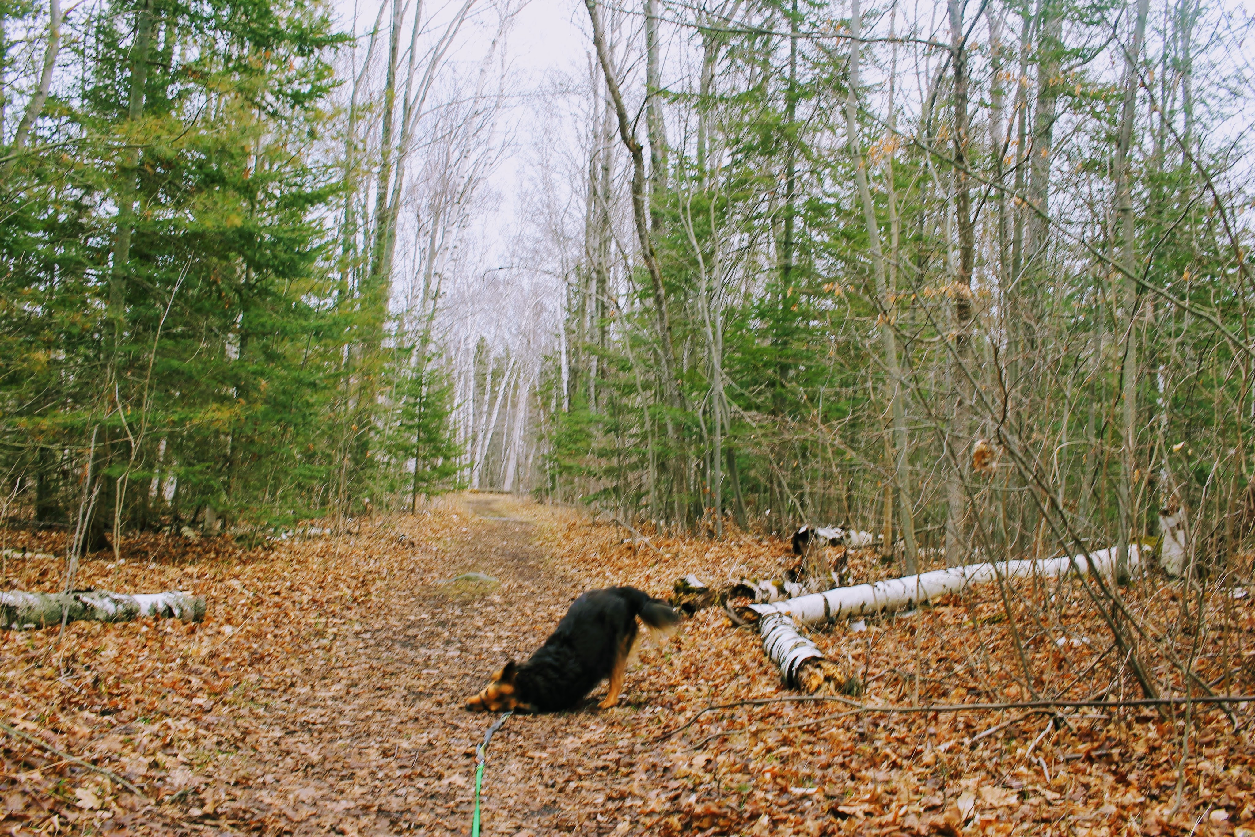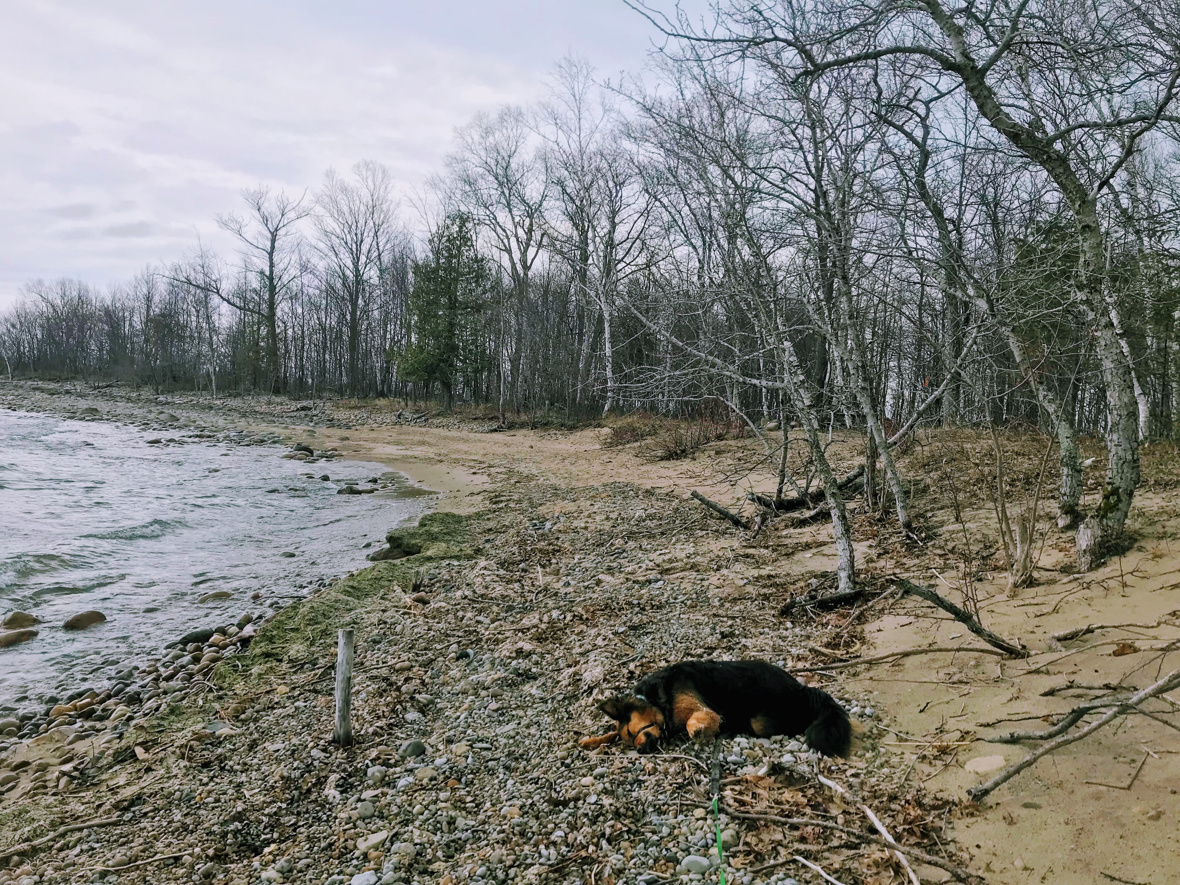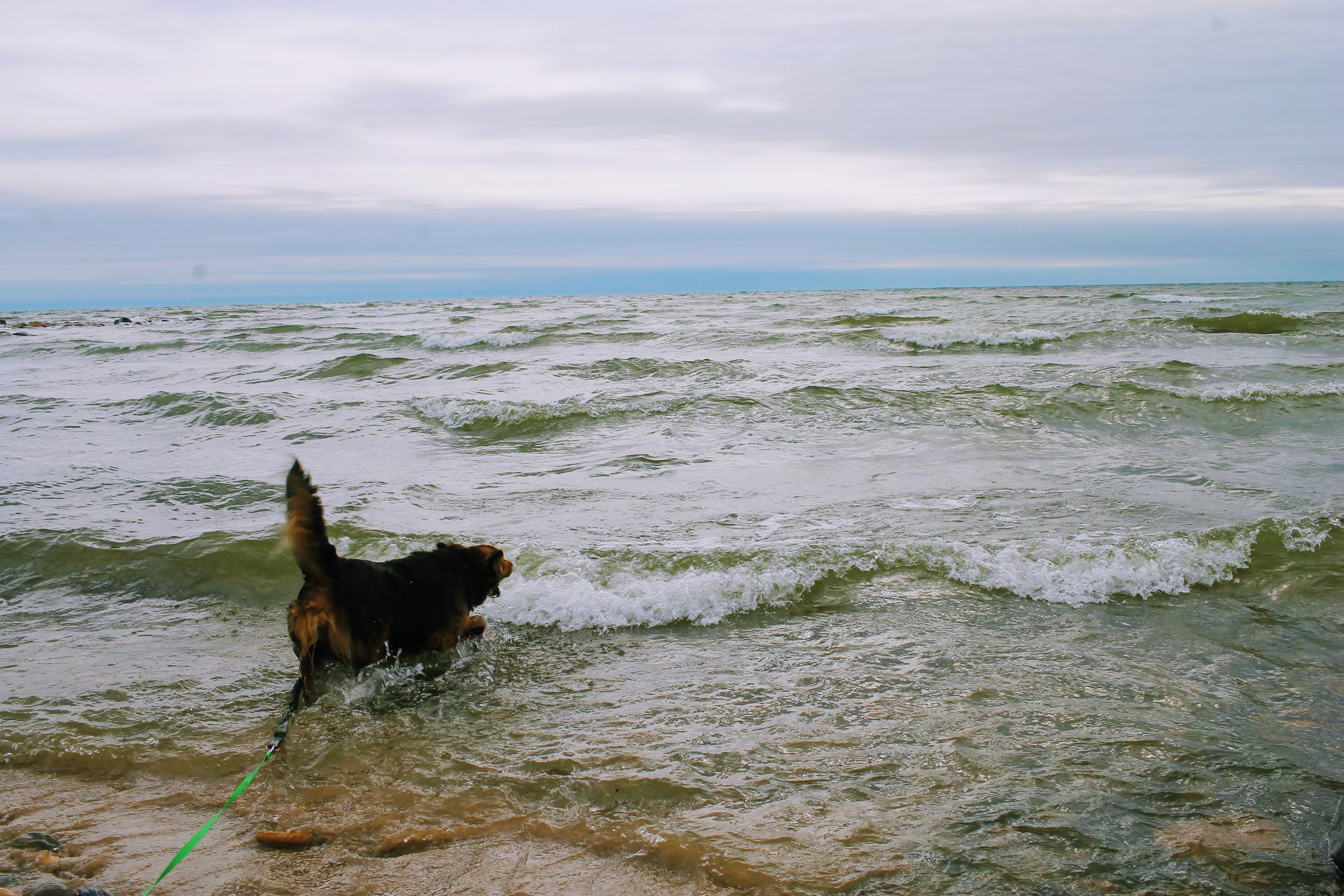 Into the woods we go. But not for long before we take a pitstop at the shoreline. The water is choppy. Gob hesitates, but only for a minute, before diving in to chomp at the waves. I don’t let him play long though. We have many miles ahead of us, and I want to beat the rain.