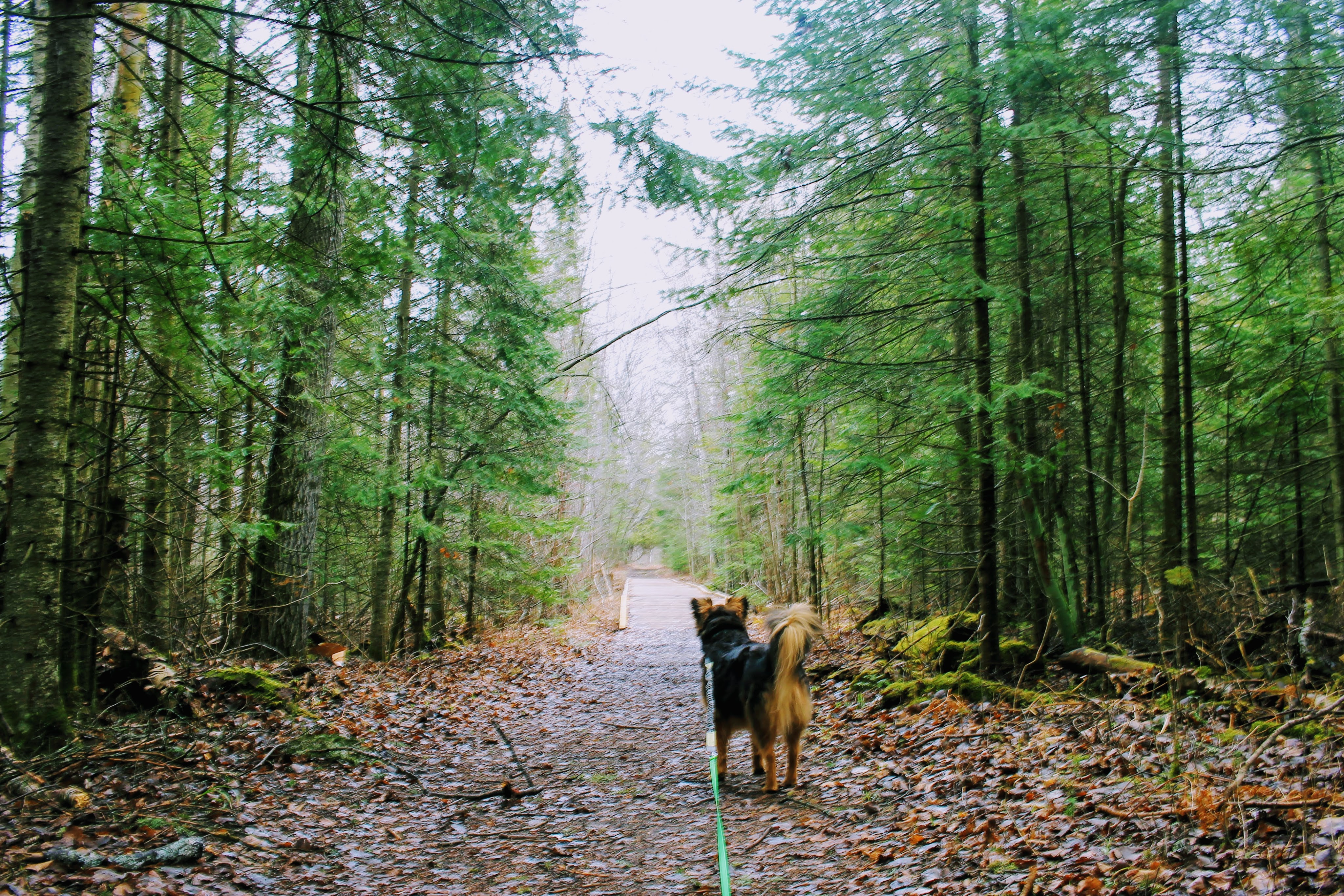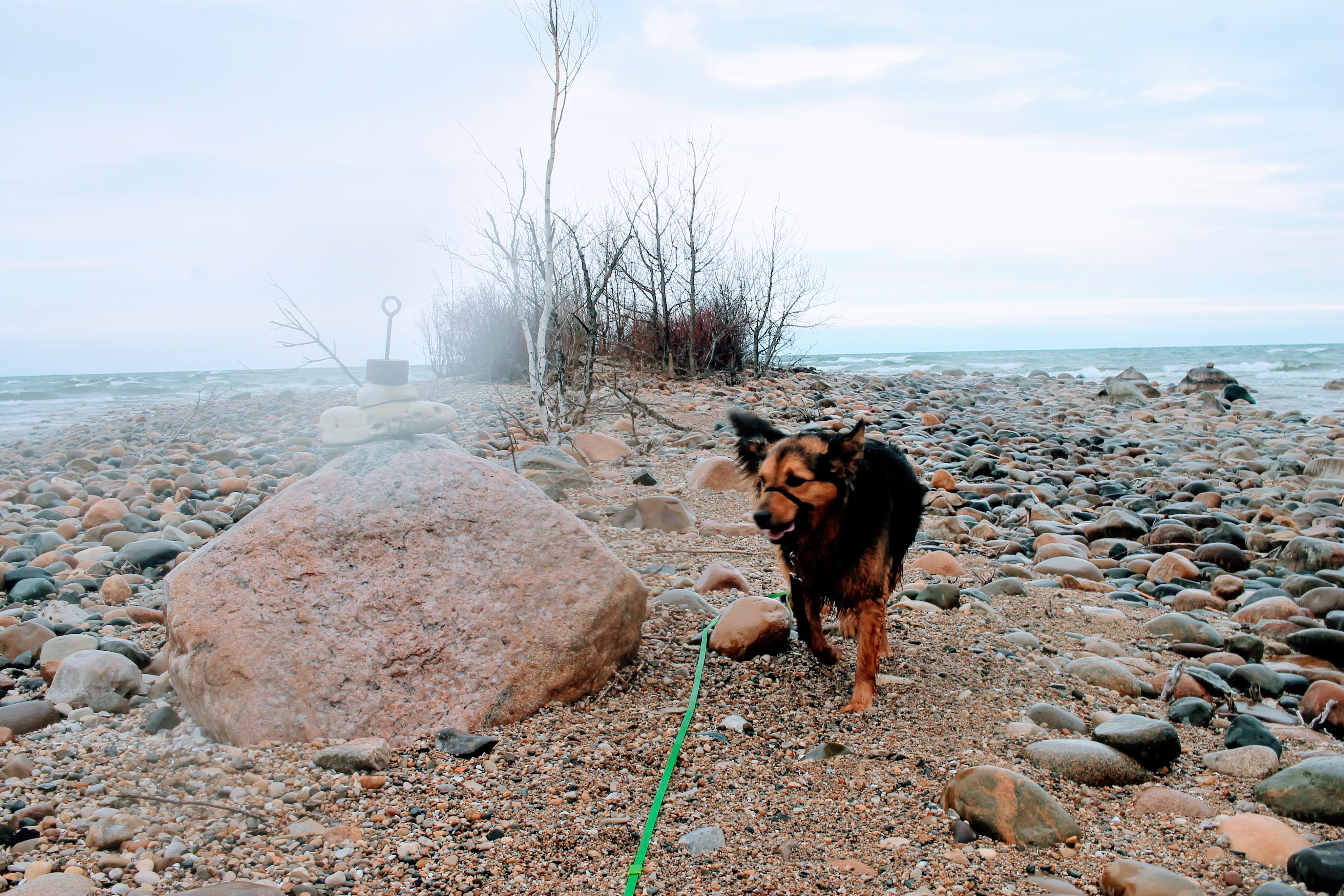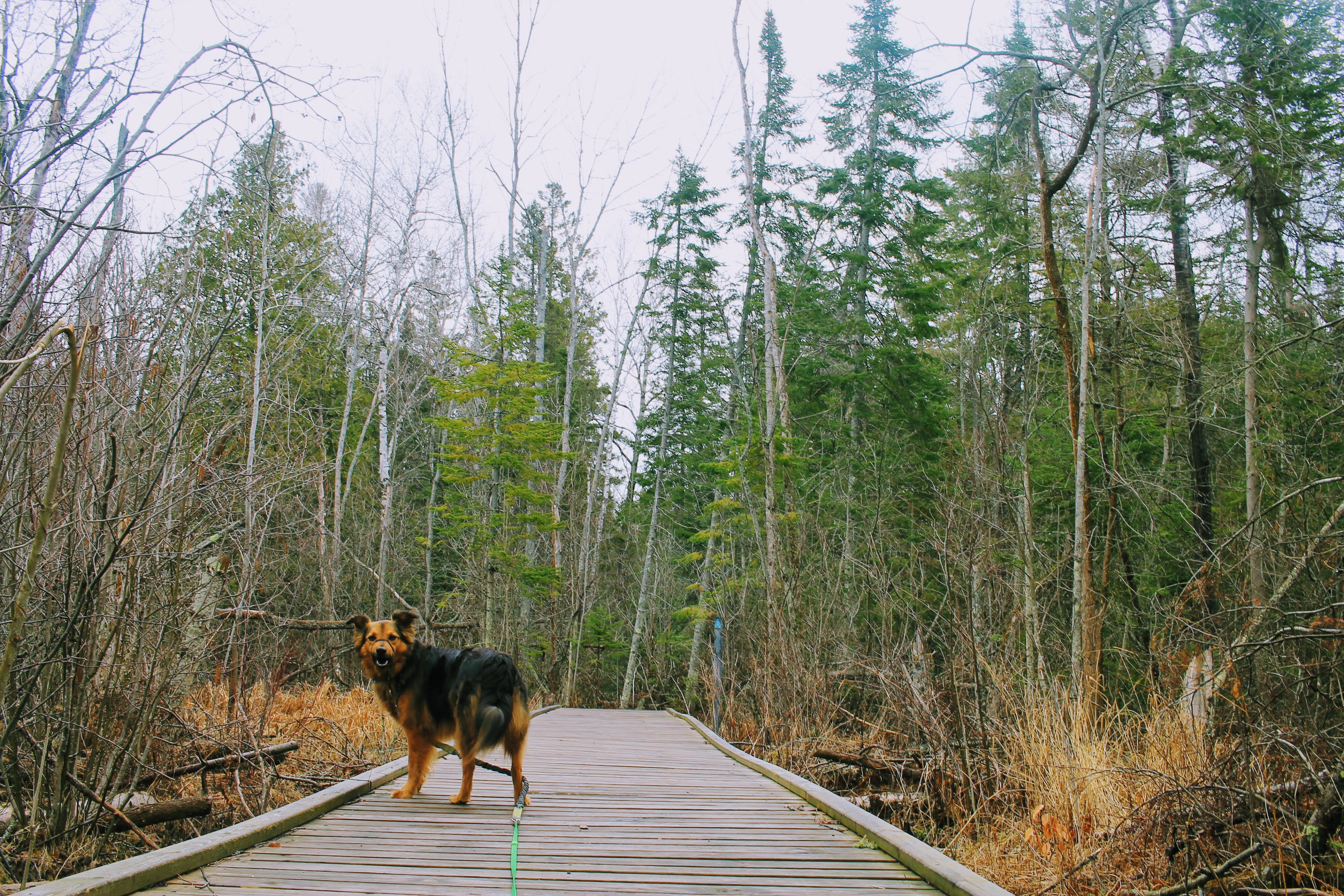 Into the woods we go. But not for long before we take a pitstop at the shoreline. The water is choppy. Gob hesitates, but only for a minute, before diving in to chomp at the waves. I don’t let him play long though. We have many miles ahead of us, and I want to beat the rain.