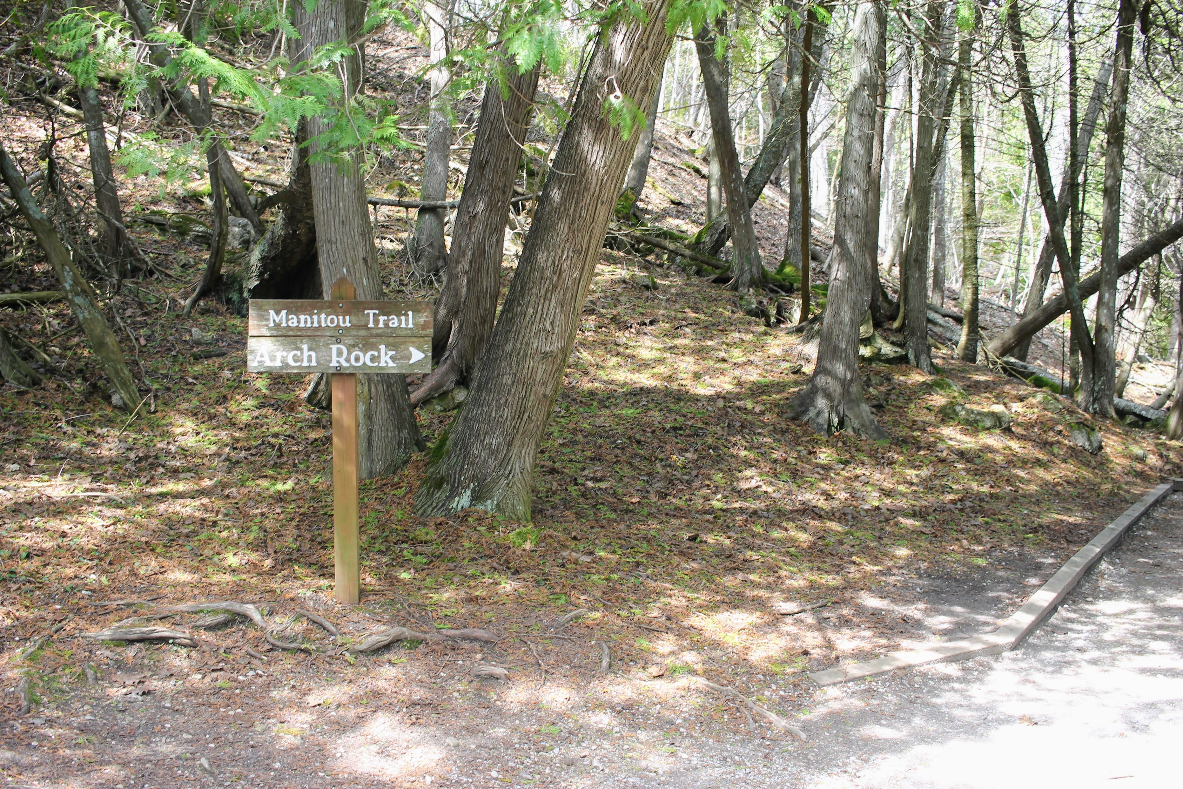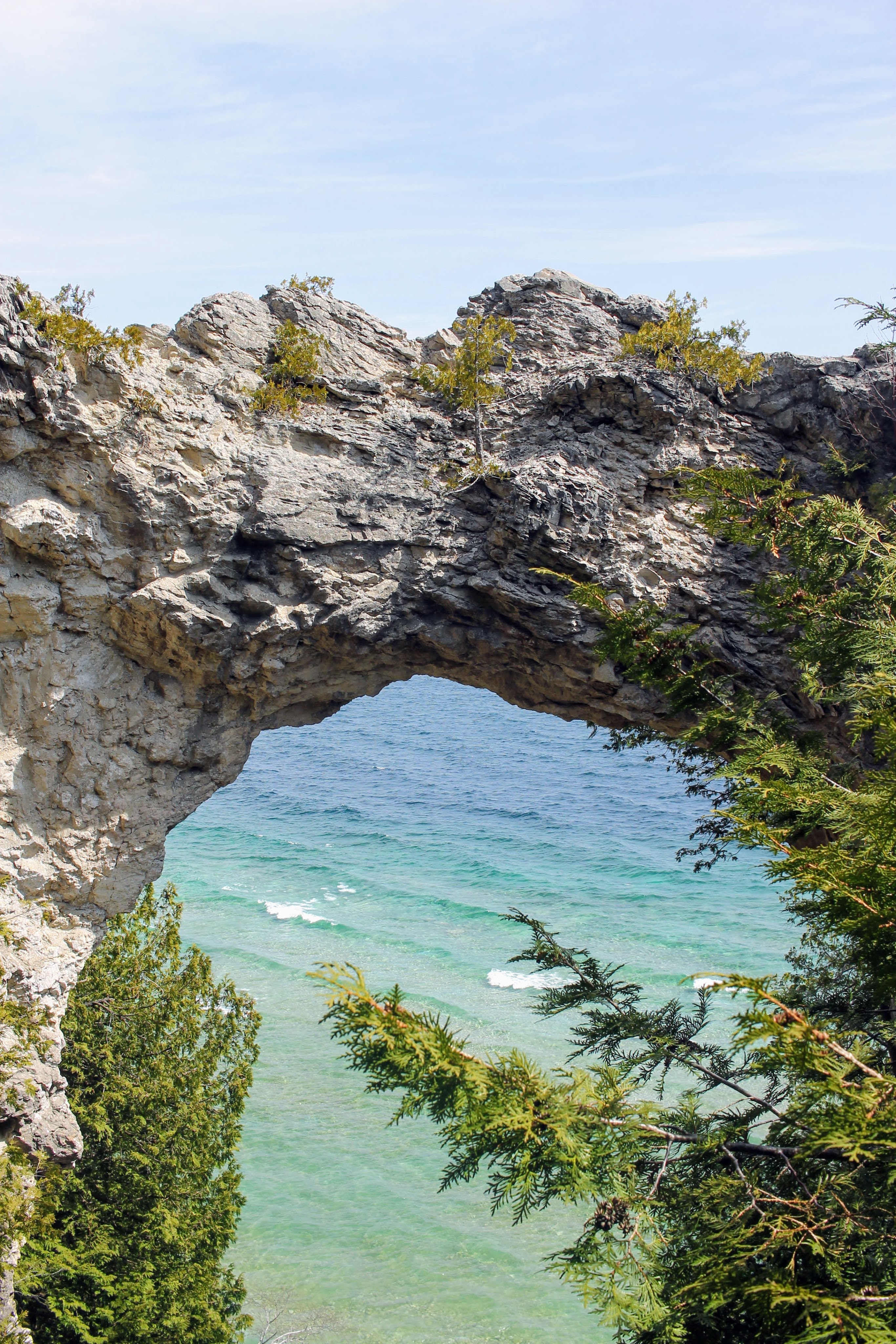 Bellies full and caffeinated, we embark on our first hike. The first of many because motorized vehicles are not allowed, and Gob is not willing to ride in a horse drawn carriage or a bicycle basket. We stroll a mile or so along the outer island loop before we are forced to climb 207 stairs to see a rock formation. And by forced I mean that I really wanted to see it. And by rock formation I mean a geological marvel where water eroded the limestone to form a giant arch. You guessed it – it’s called Arch Rock.