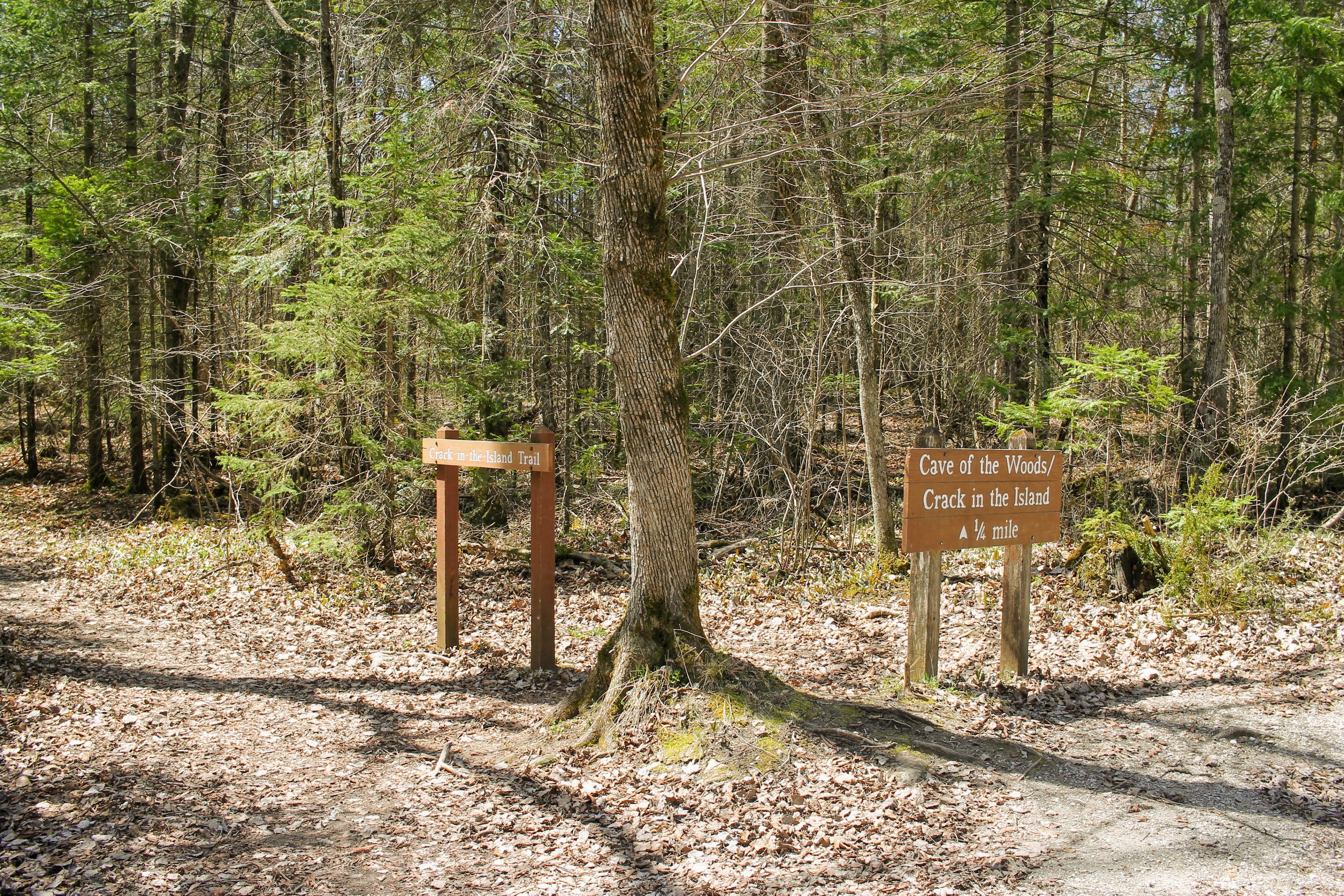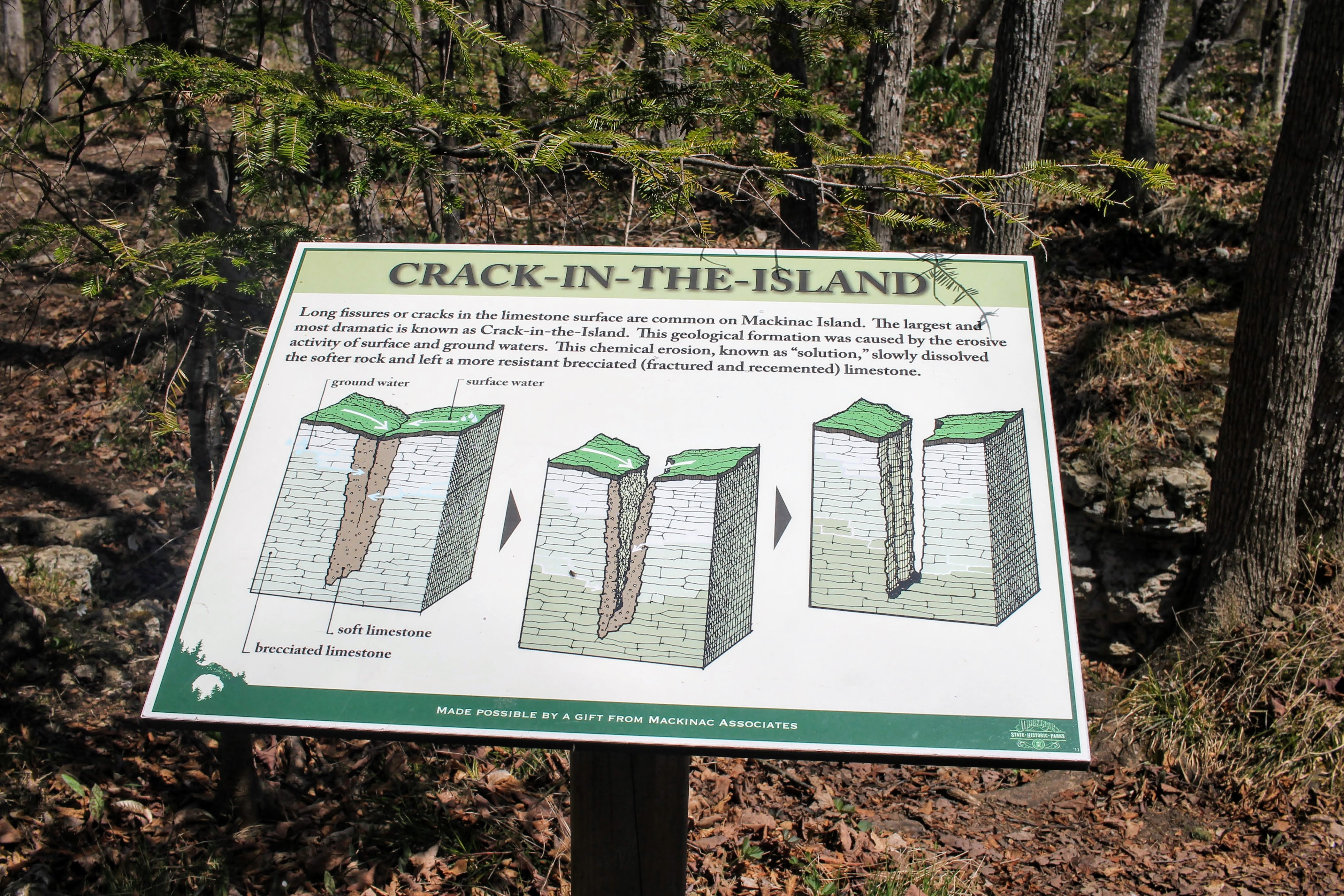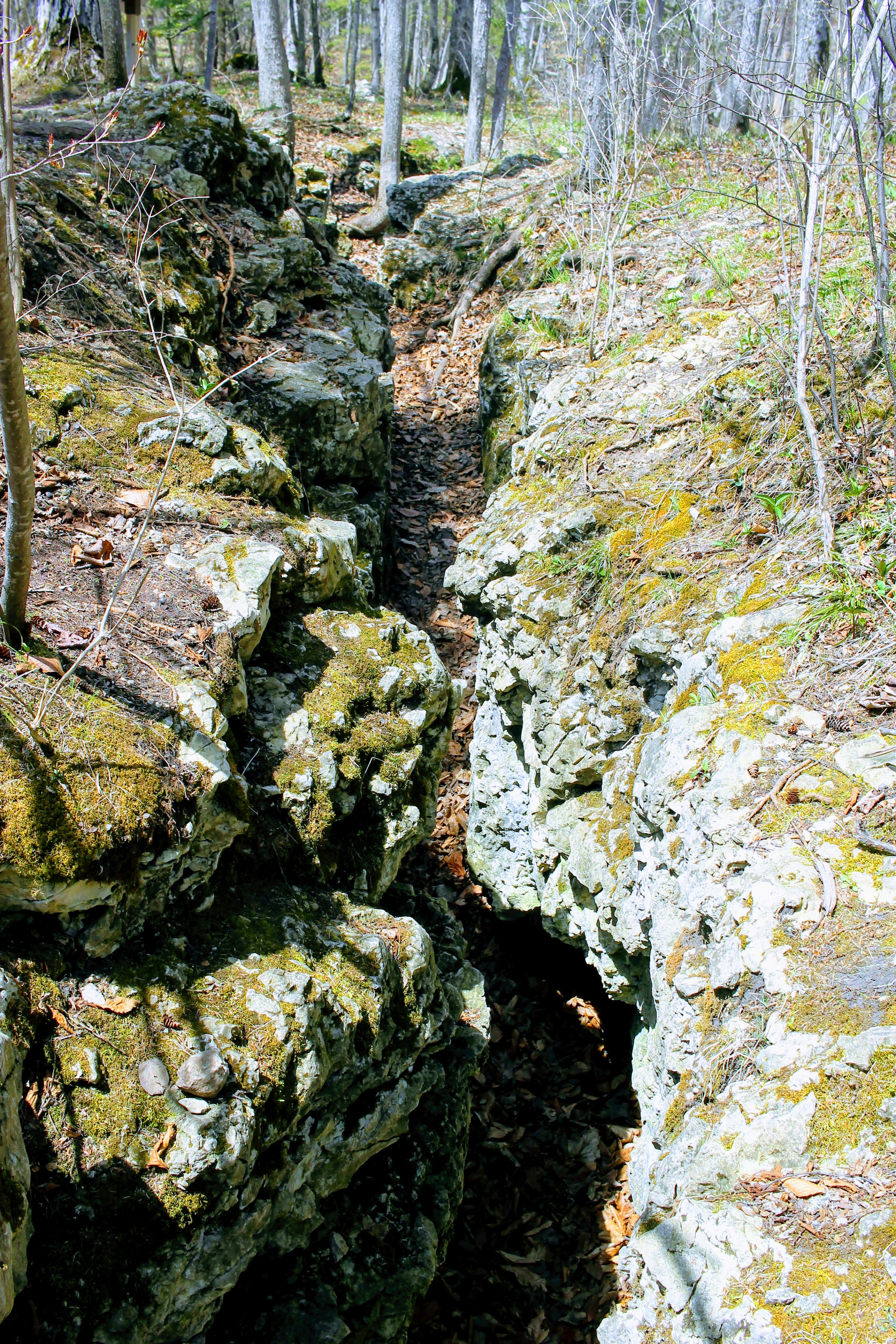 Our trail takes us past the airport, then “cave-in-the-woods”, and finally “crack-in-the-island”. Another geological feature of elemental decay.