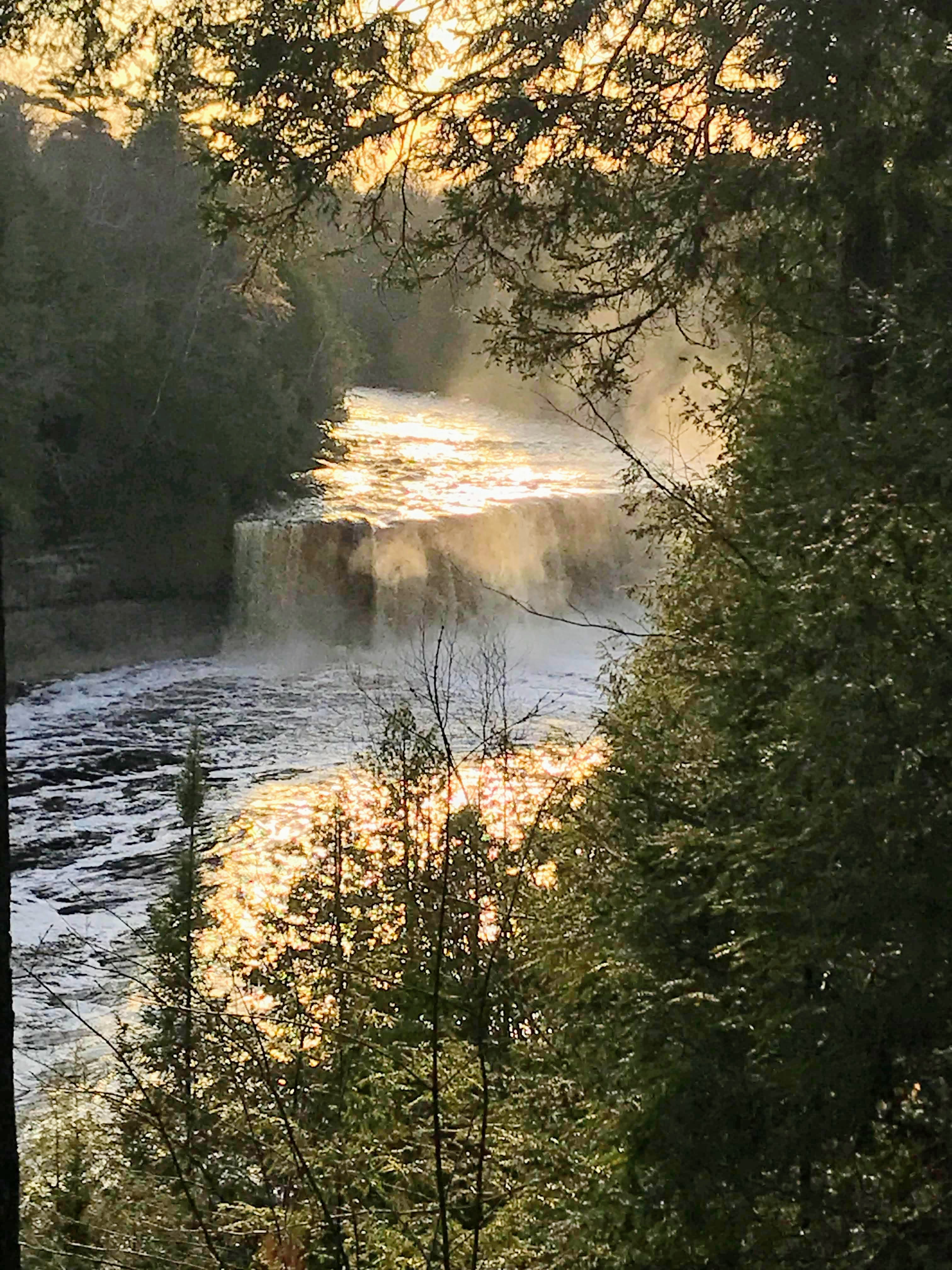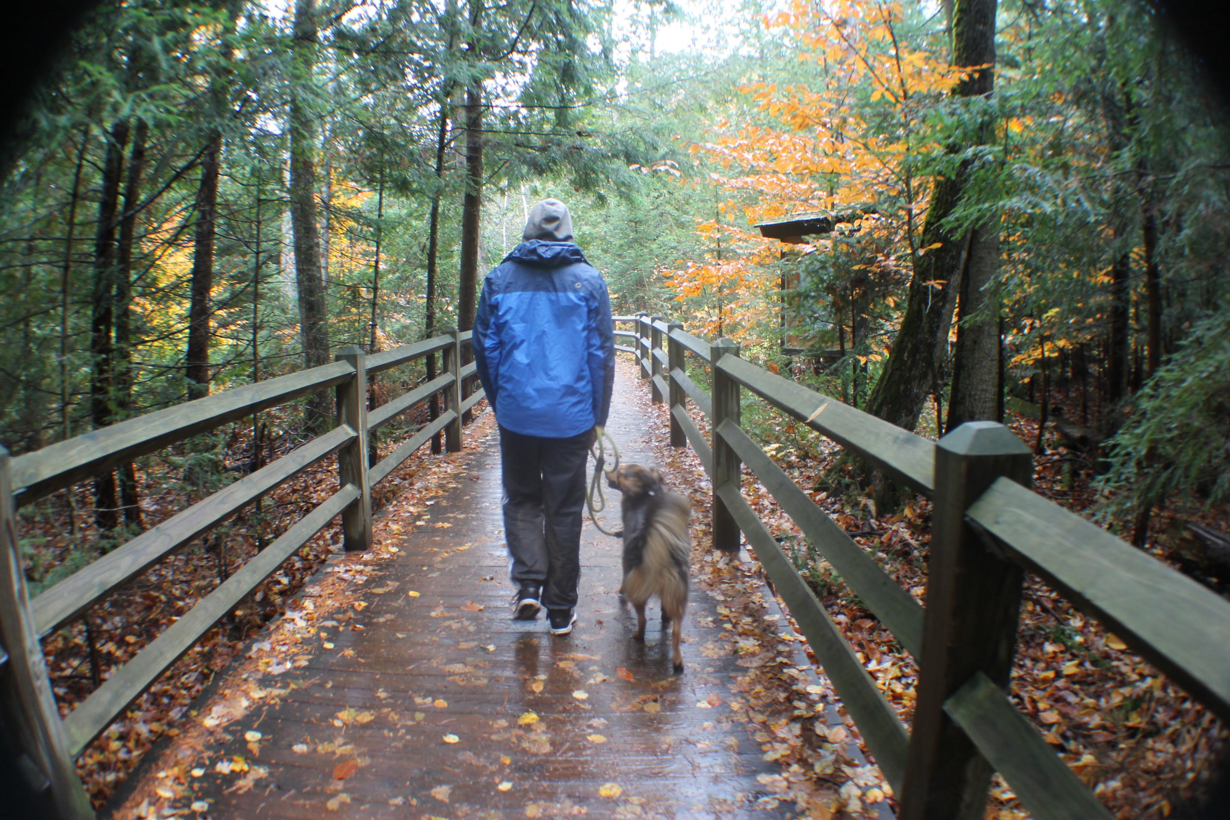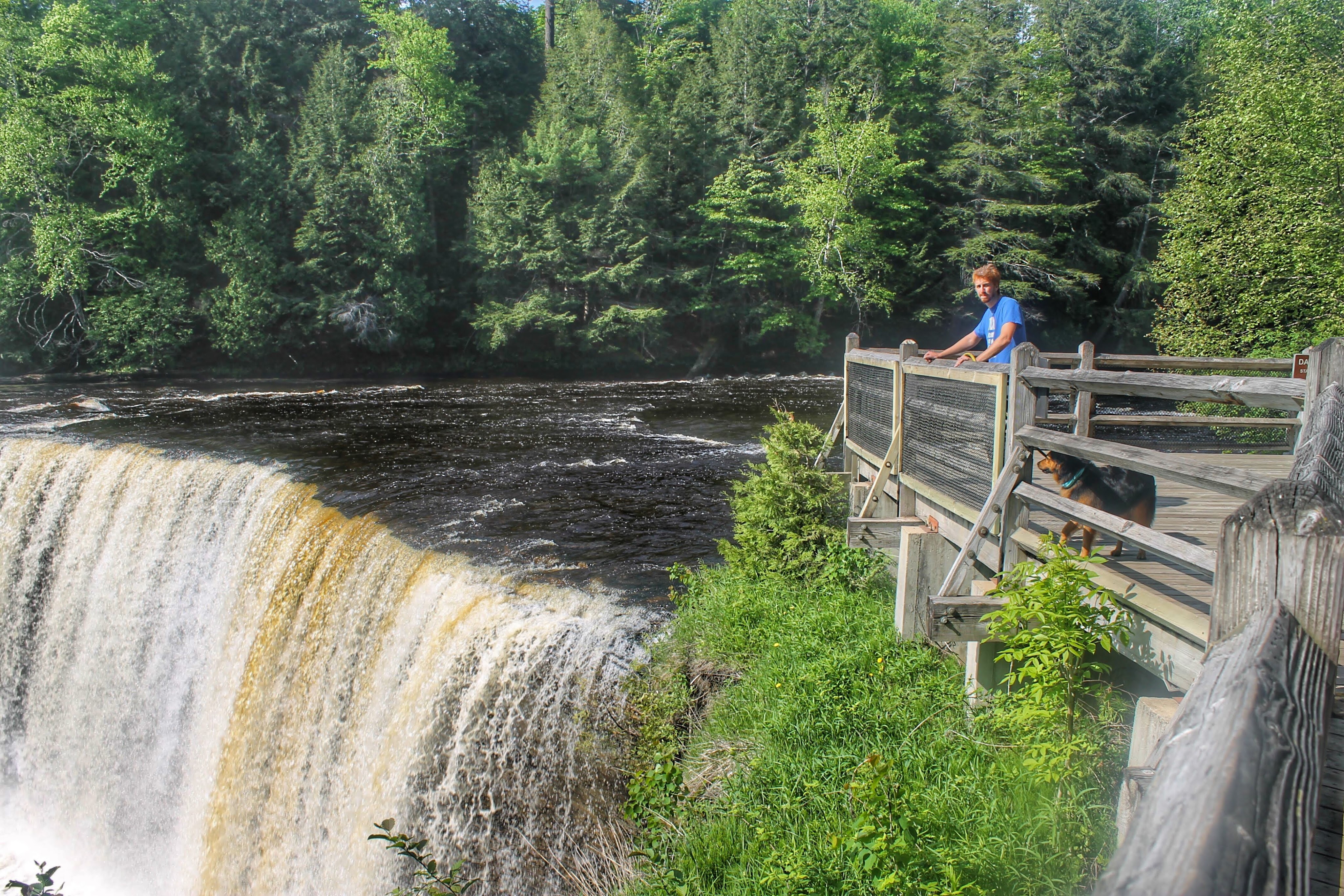 As we cross into the UP, there is snow on the ground. I am not mentally prepared for this. The park is teaming with cars. We can see Gob’s anxiety growing. We decide to take him on a big hike before attempting to see the falls. A tired pup is much more manageable around crowds.