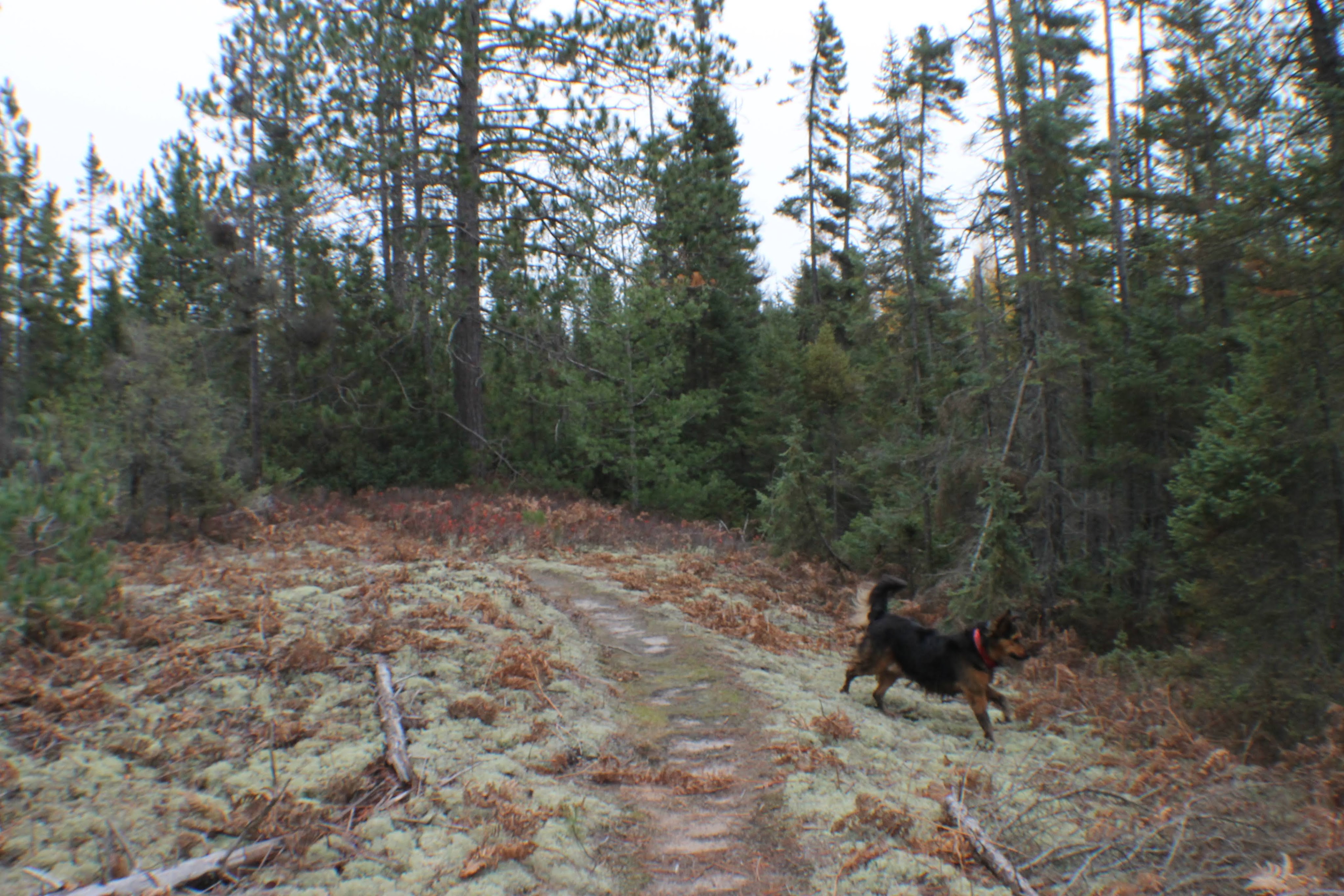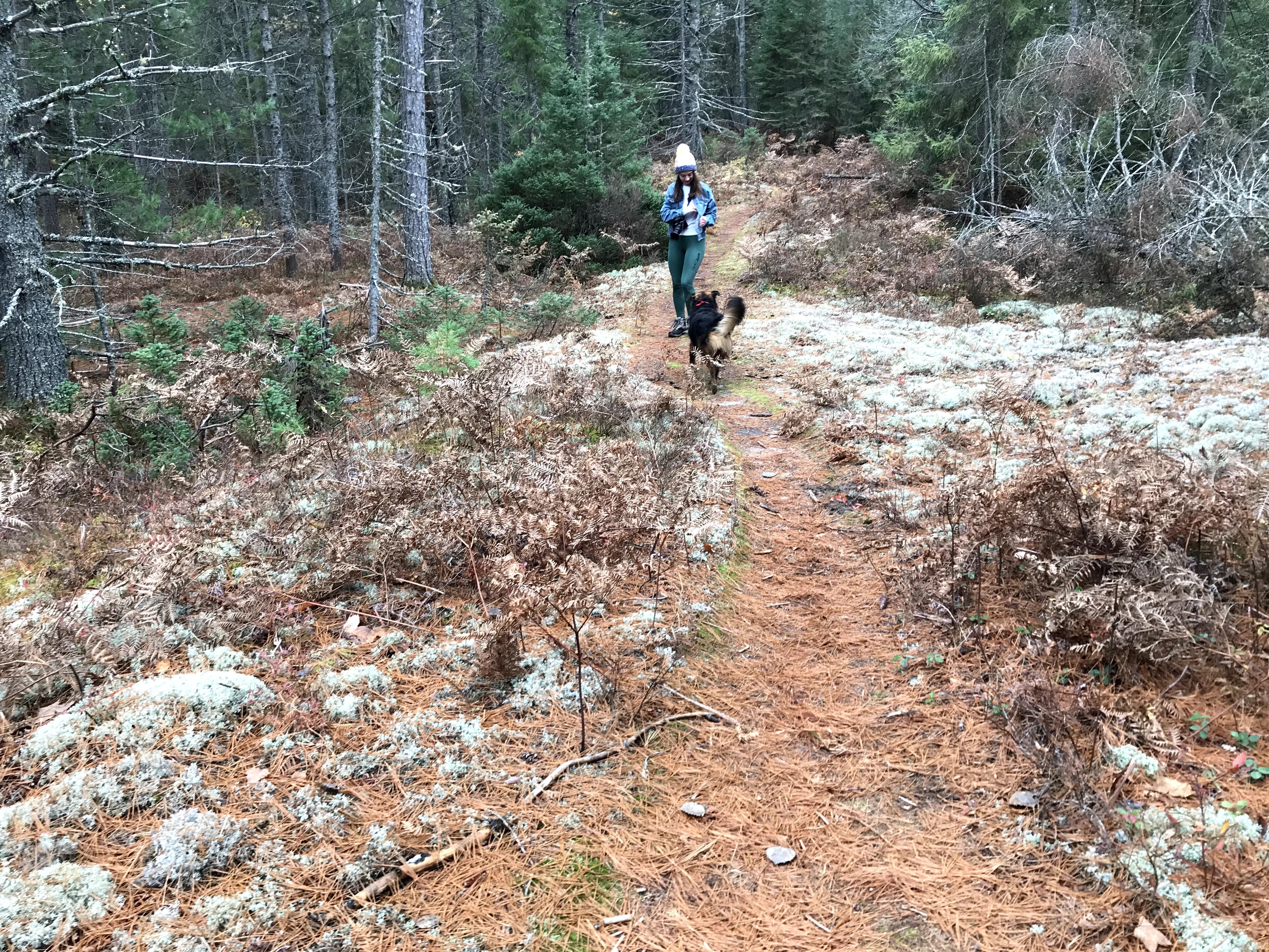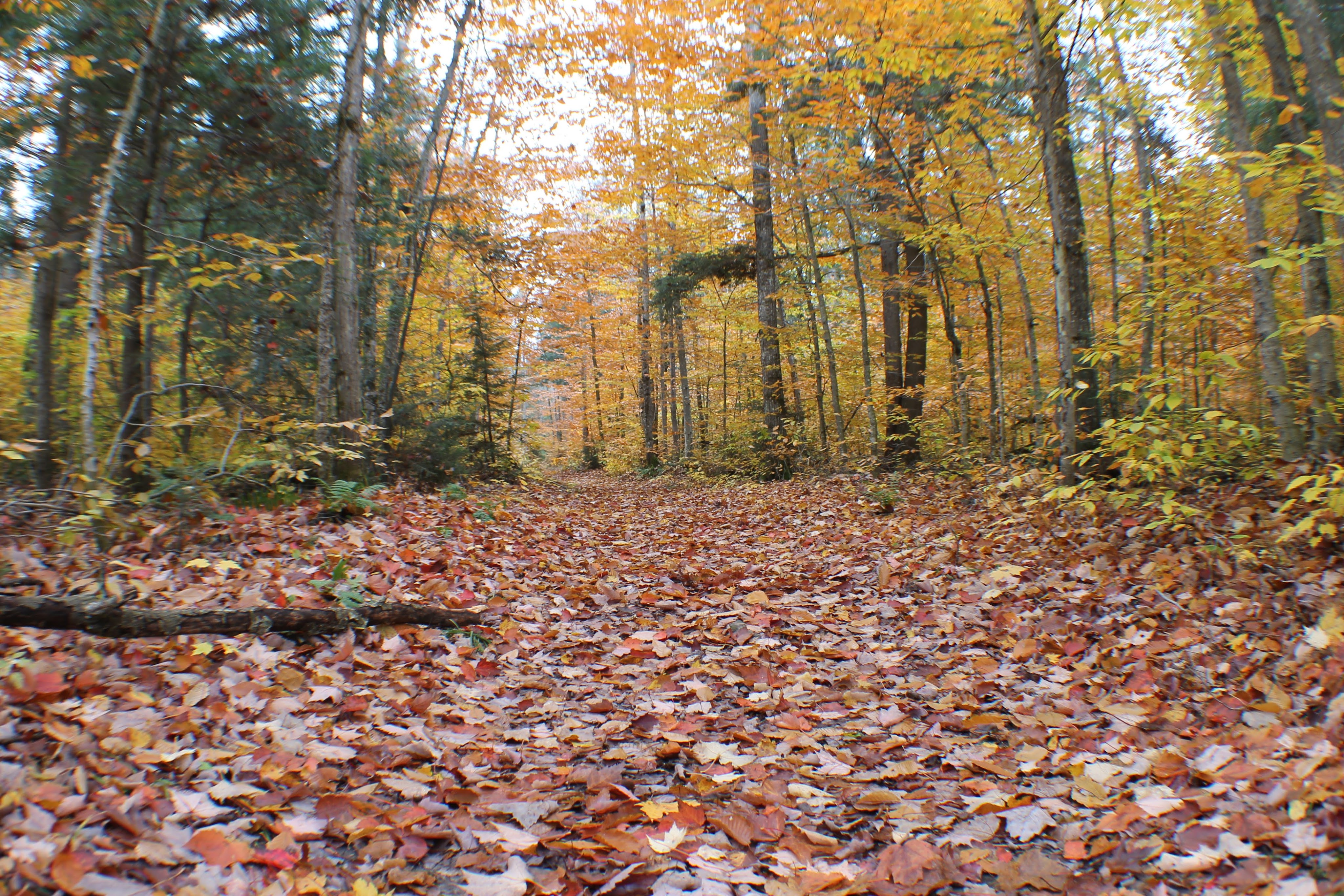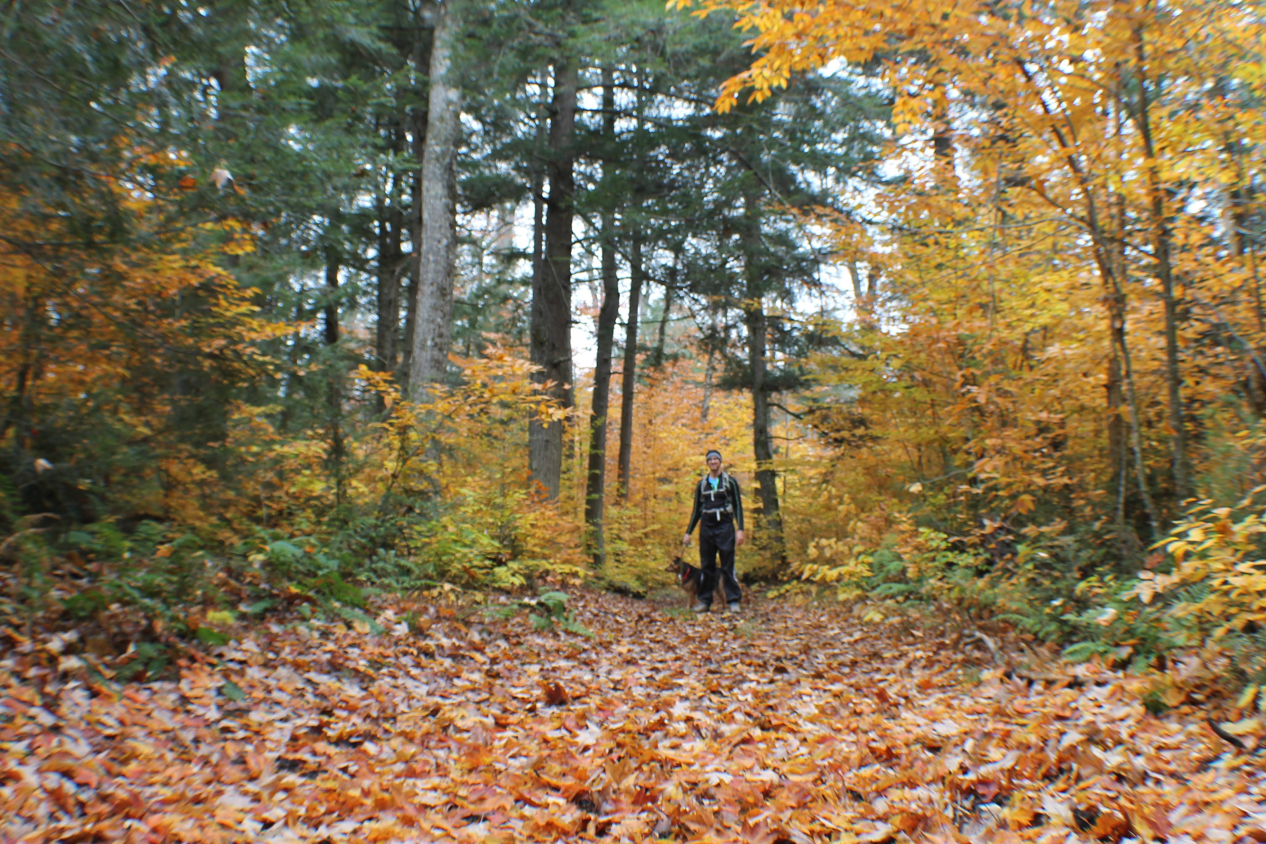 The golden leaves surround us. Half are still hanging onto their branches, the others littering the ground. But quickly the forest changes and leaves turn to needles.