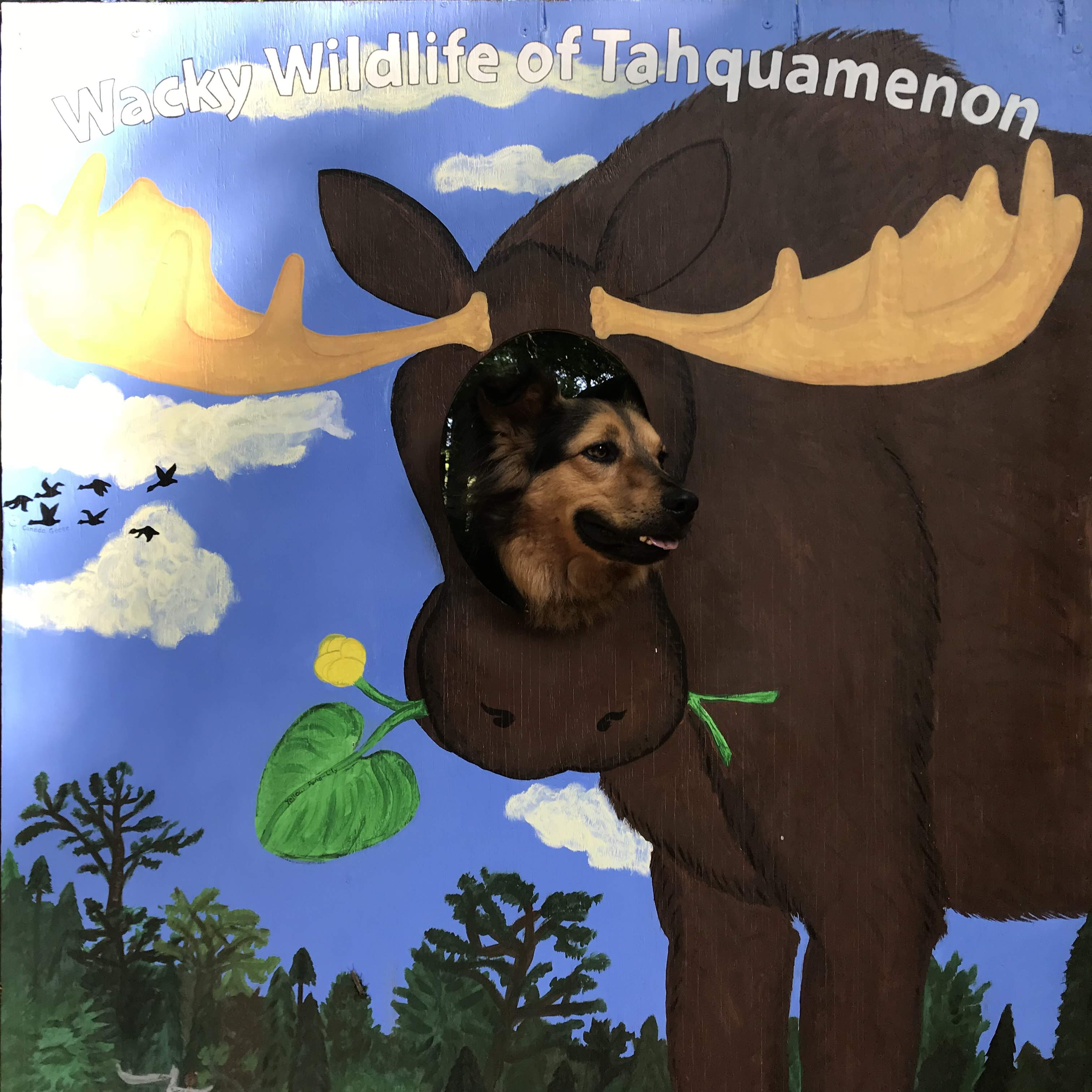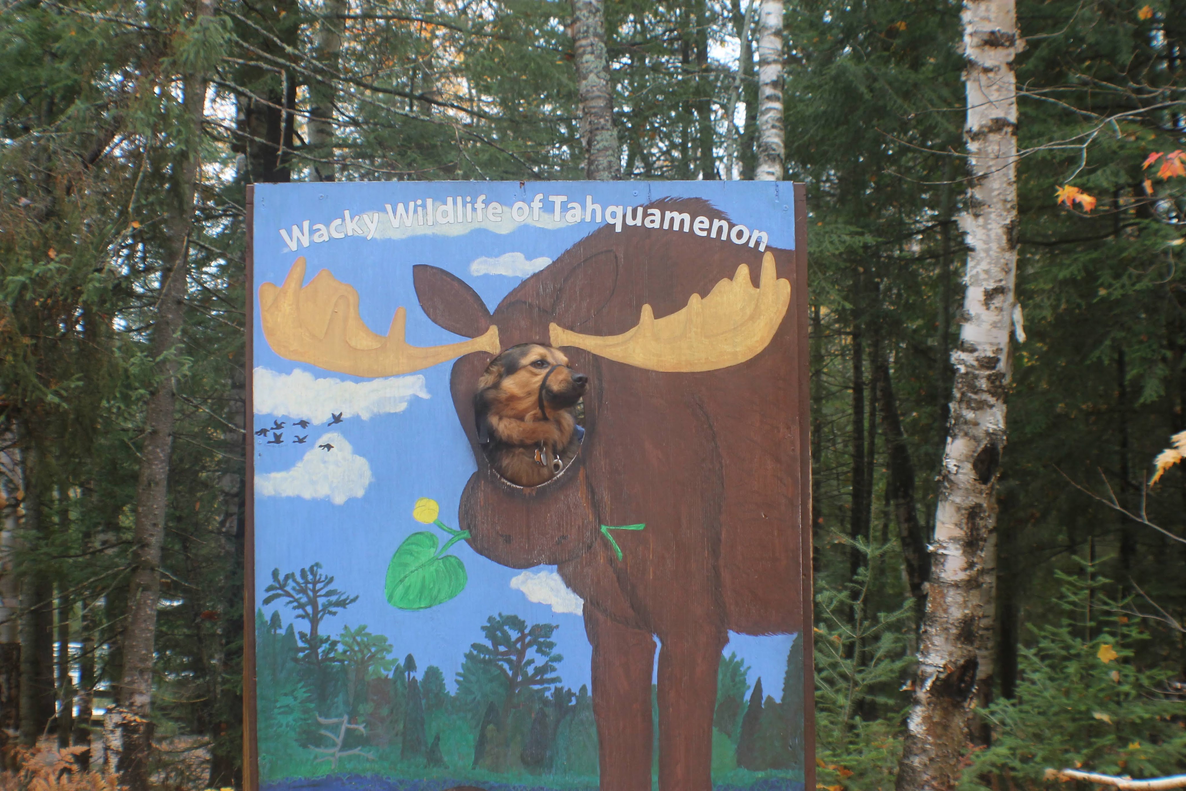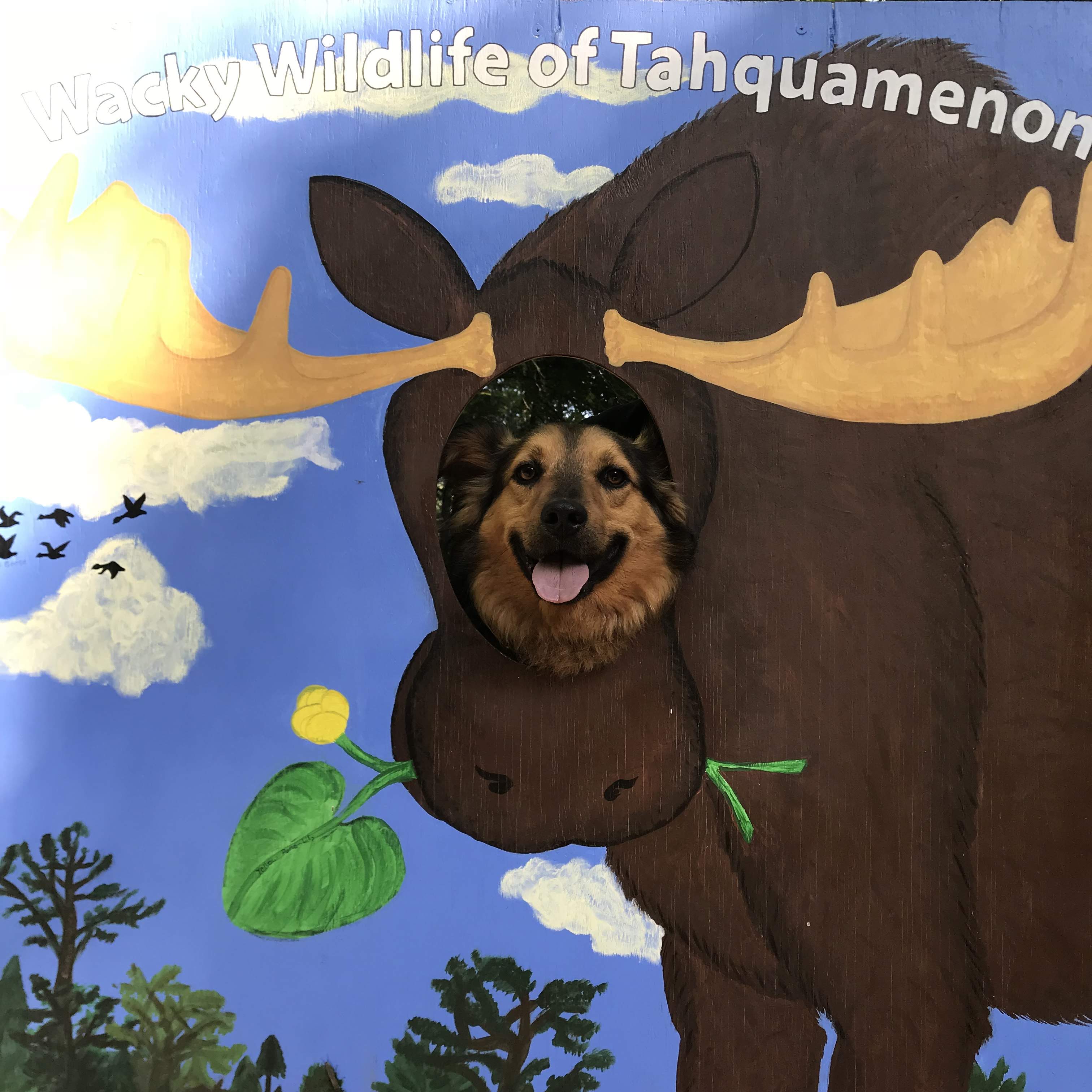9:30 am – We get back to the ranger station at the lower falls. There’s one of those painted wooden boards with the face hole cut outs for photo-ops. I have no idea what they’re actually called, but you know what I mean. I get Mason to put Gob’s head through one of them. Gob is such a good moose.