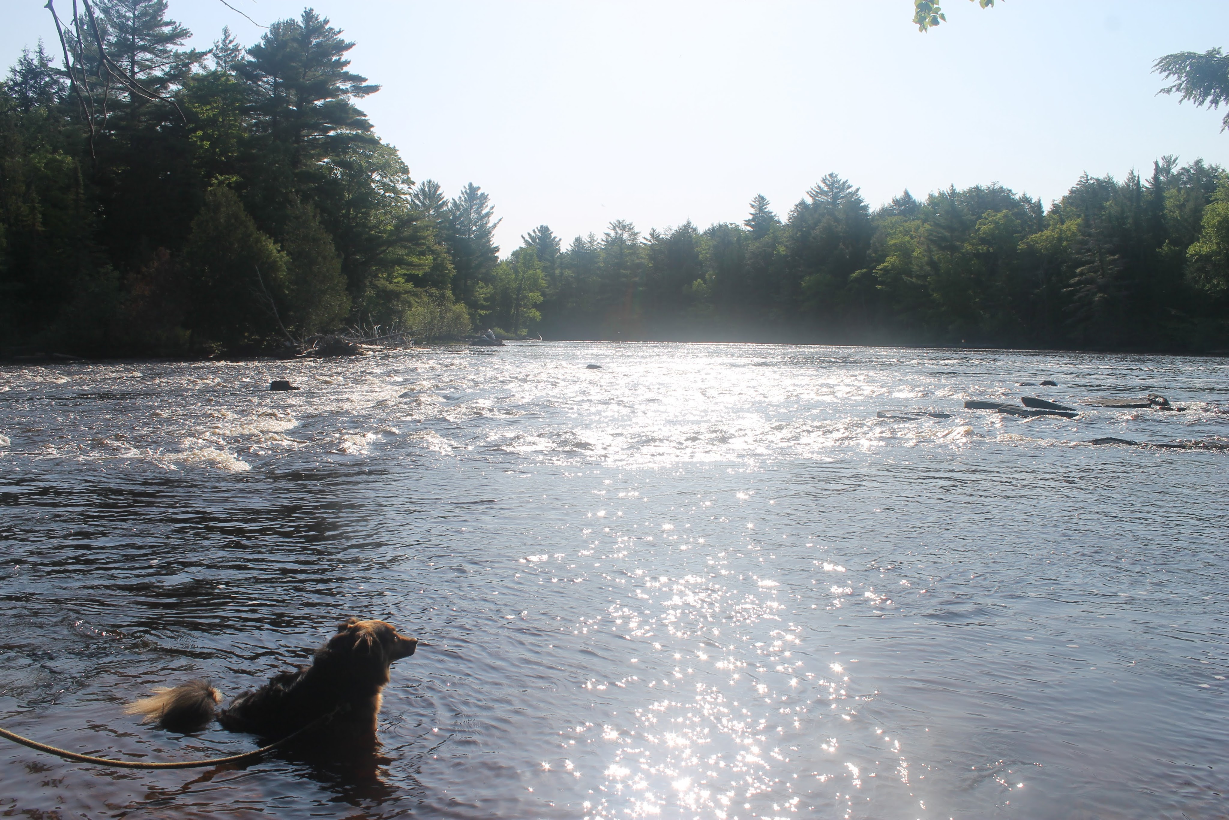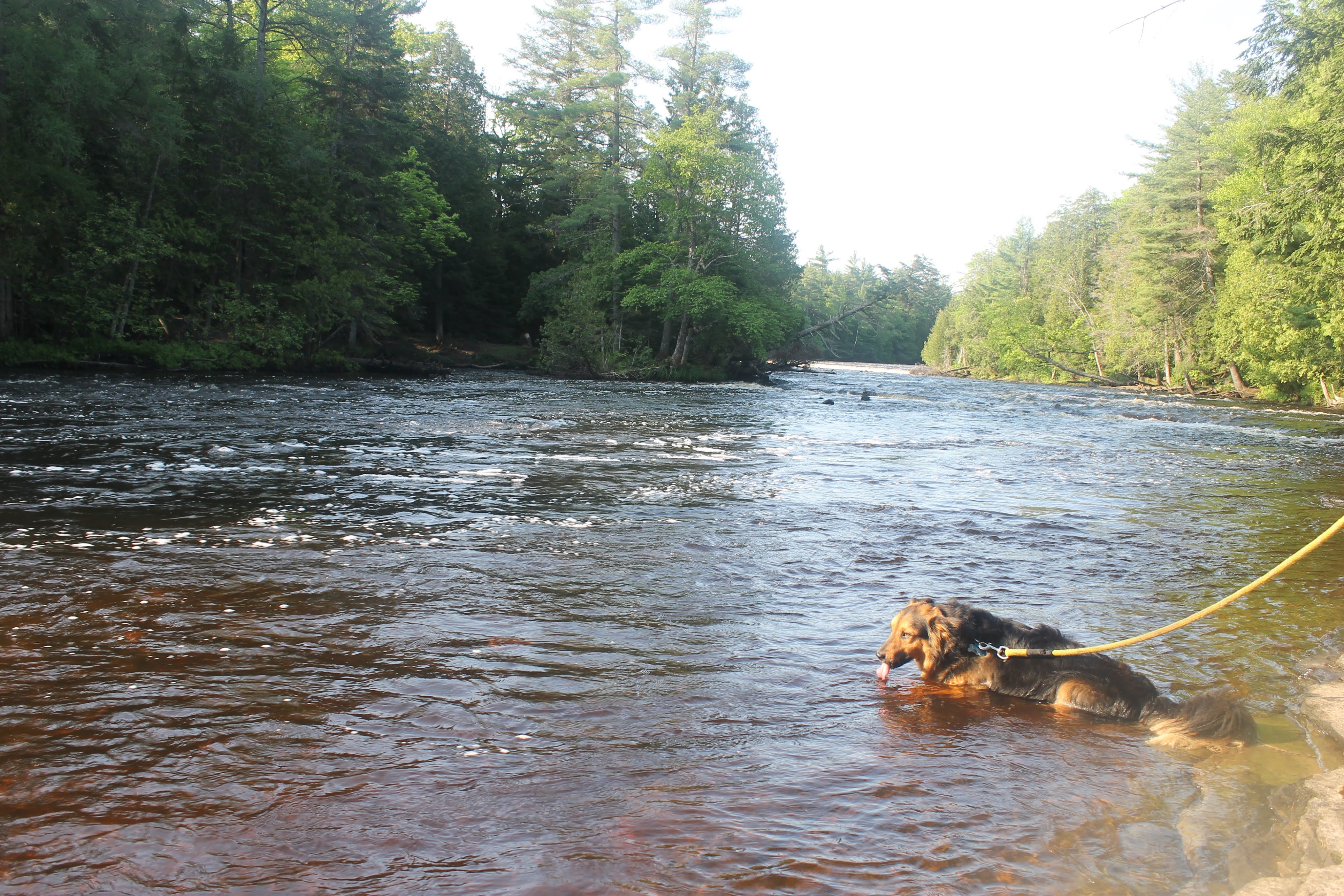 The trail follows the river. Gob loves this because he takes a dip in the water whenever he gets a chance. We see one other couple. All they say is, “How do you like these mosquitos?” with a big smile on their faces and a small laugh at the end. From this, we determine that they must be from the mid-west. Only mid-westerners can be this sarcastic so early in the morning.
