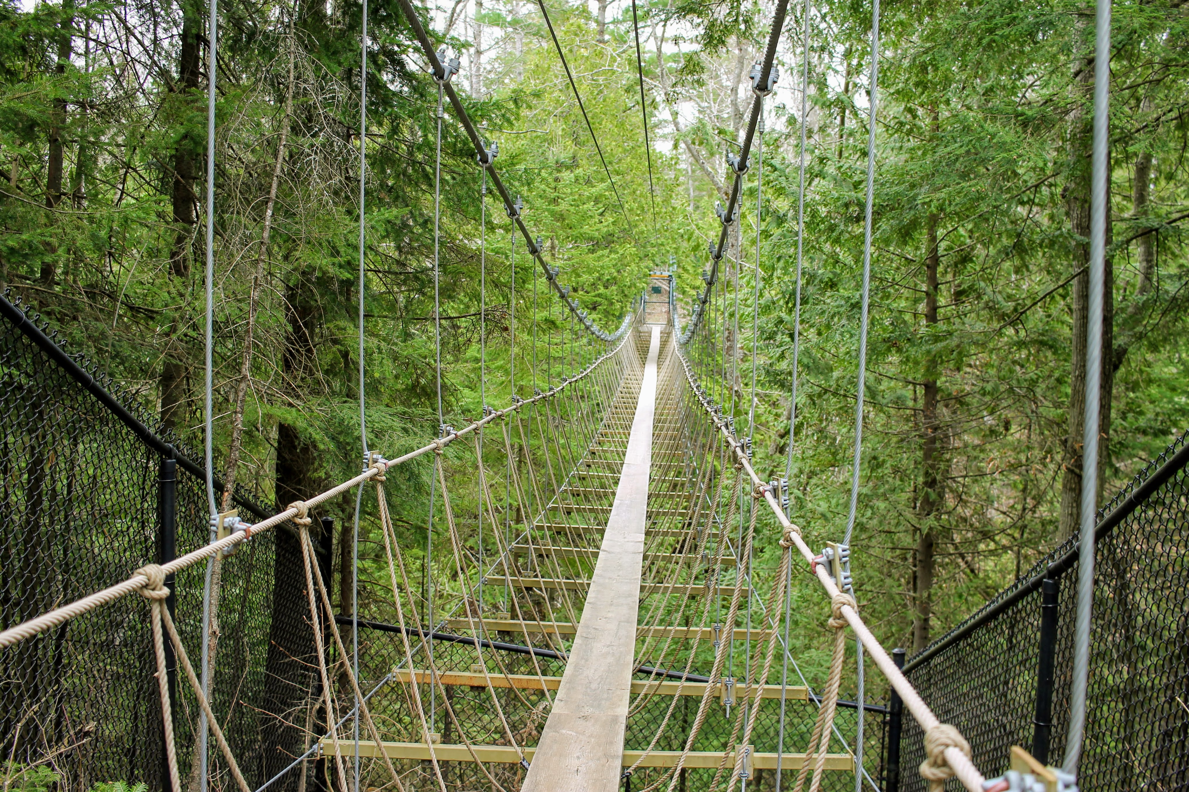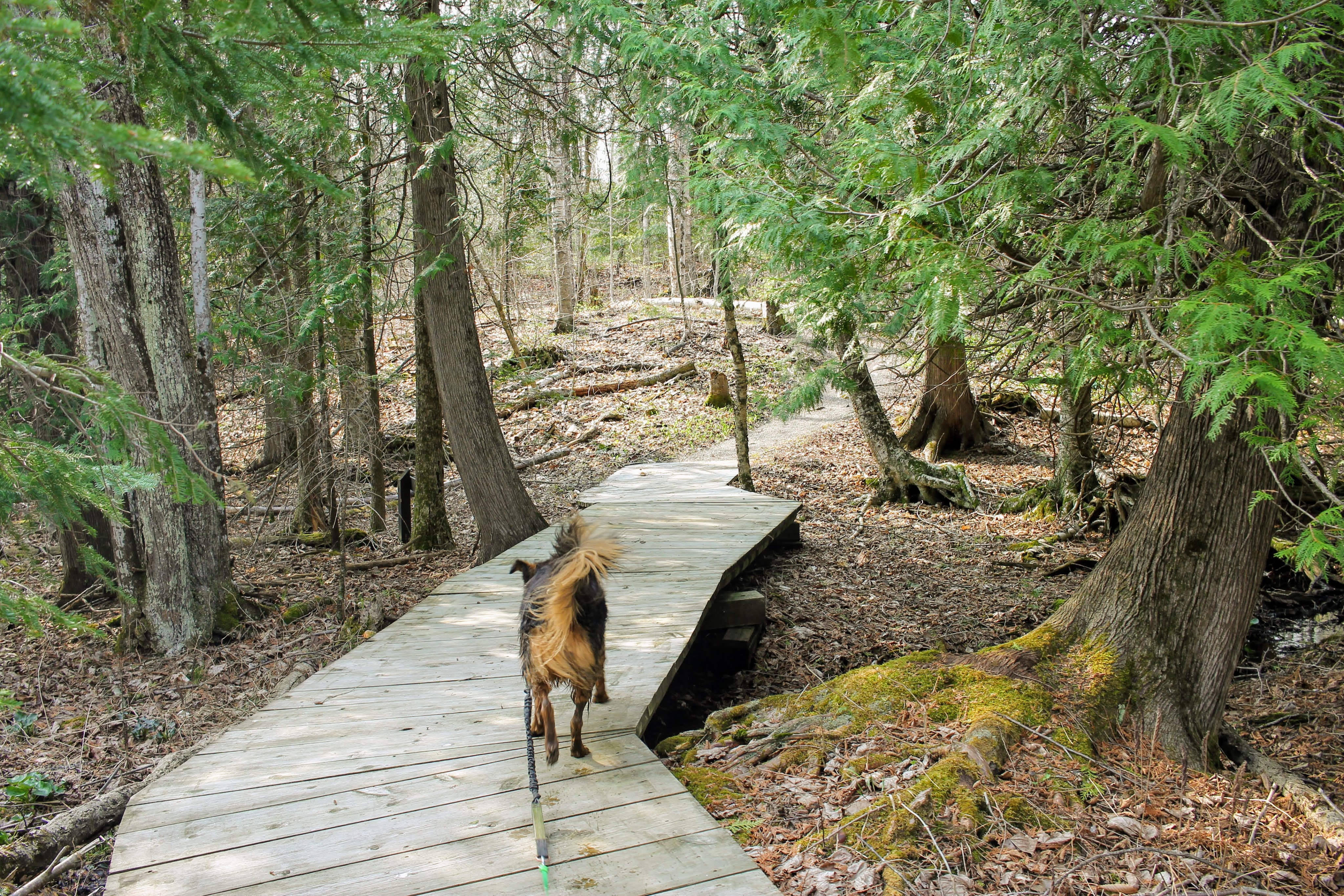 In the parking lot, we sit Gob down to go over the rules for this park. The website says that “well-behaved” dogs are allowed. So he needs to remain calm while we purchase our tickets. Our plan is to just walk the nature trails, so he doesn’t need to worry about the sawmill demonstrations or ropes course. Gob stares at us with his puppy smile, no signs of comprehension. We head in.
