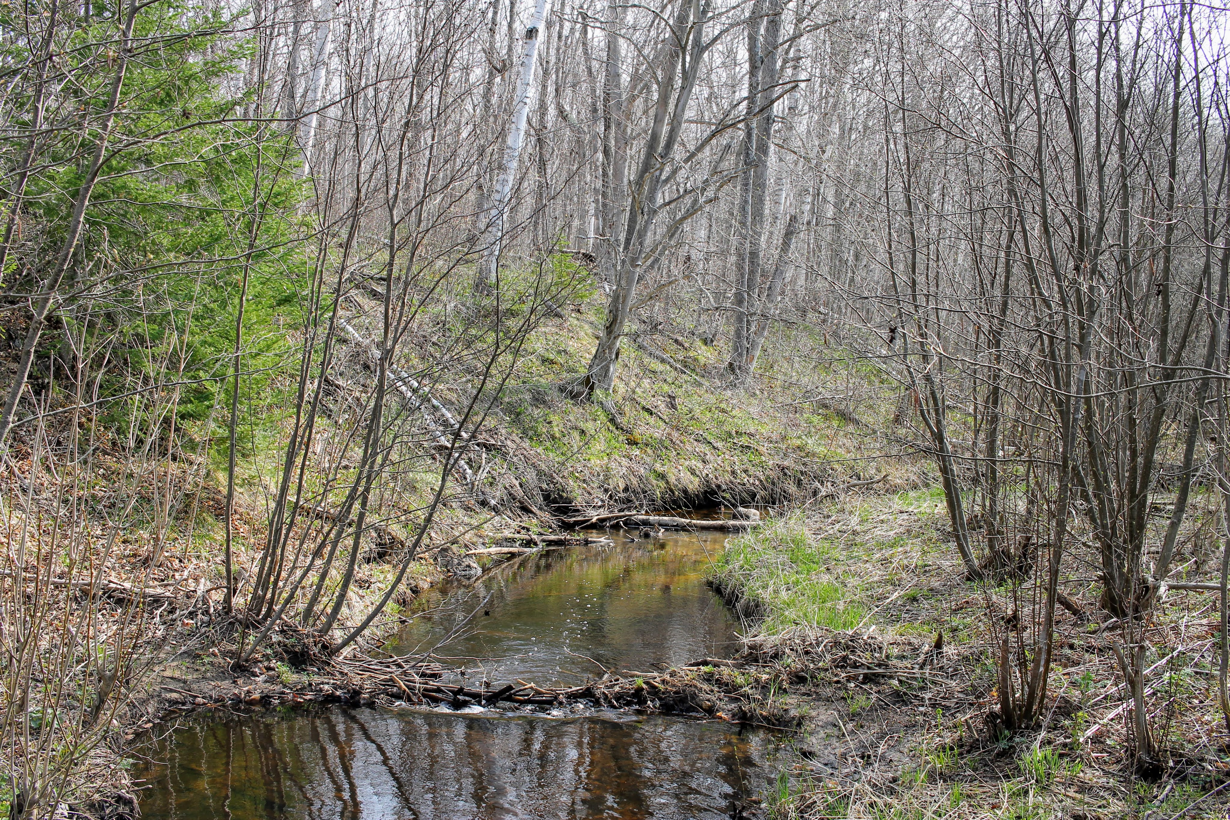 The park has just opened. There is one other family inside. We make a beeline for the 3-mile nature trail. It winds along a stream, and Gob wants so badly to go in. But he resists.