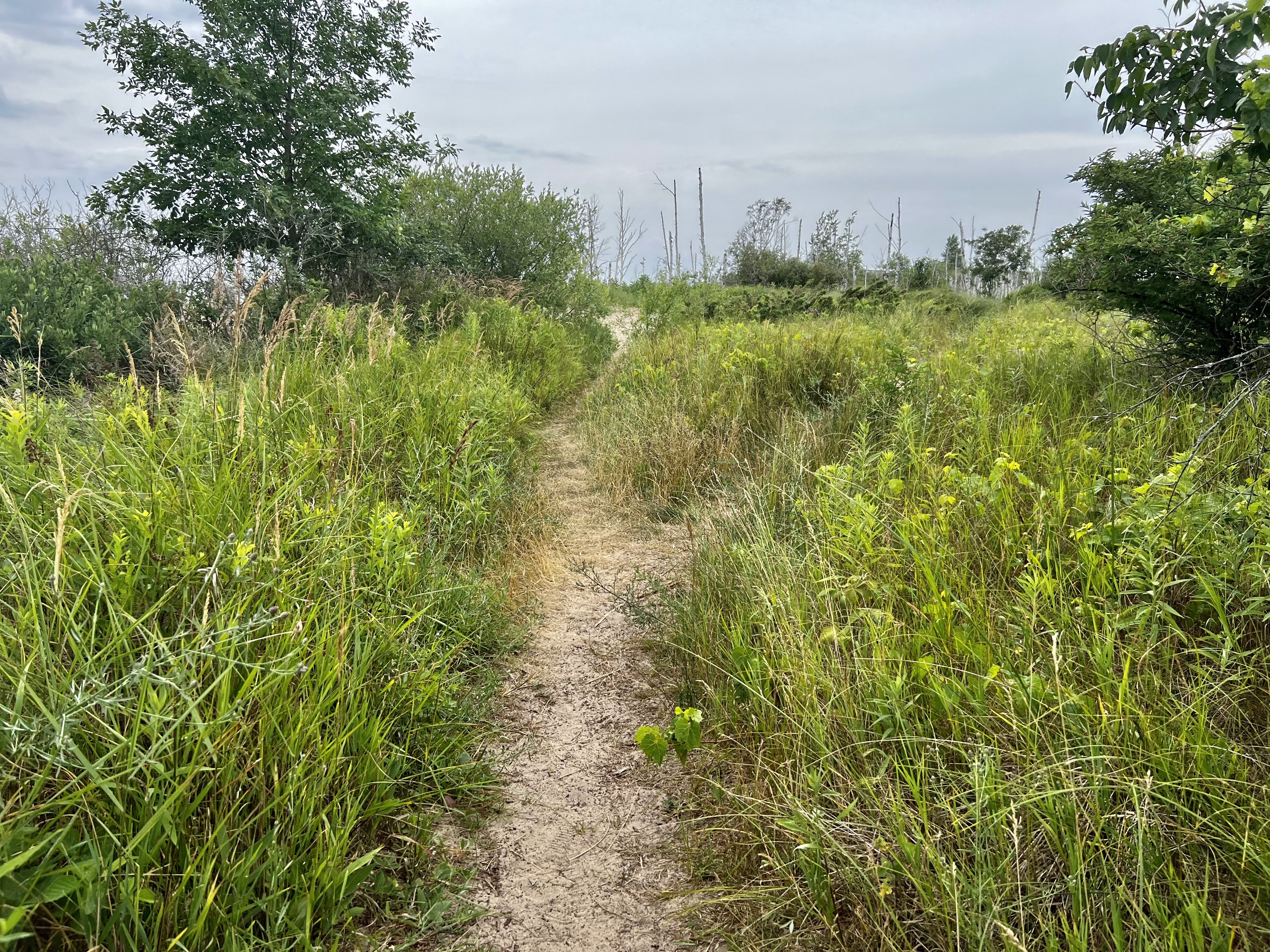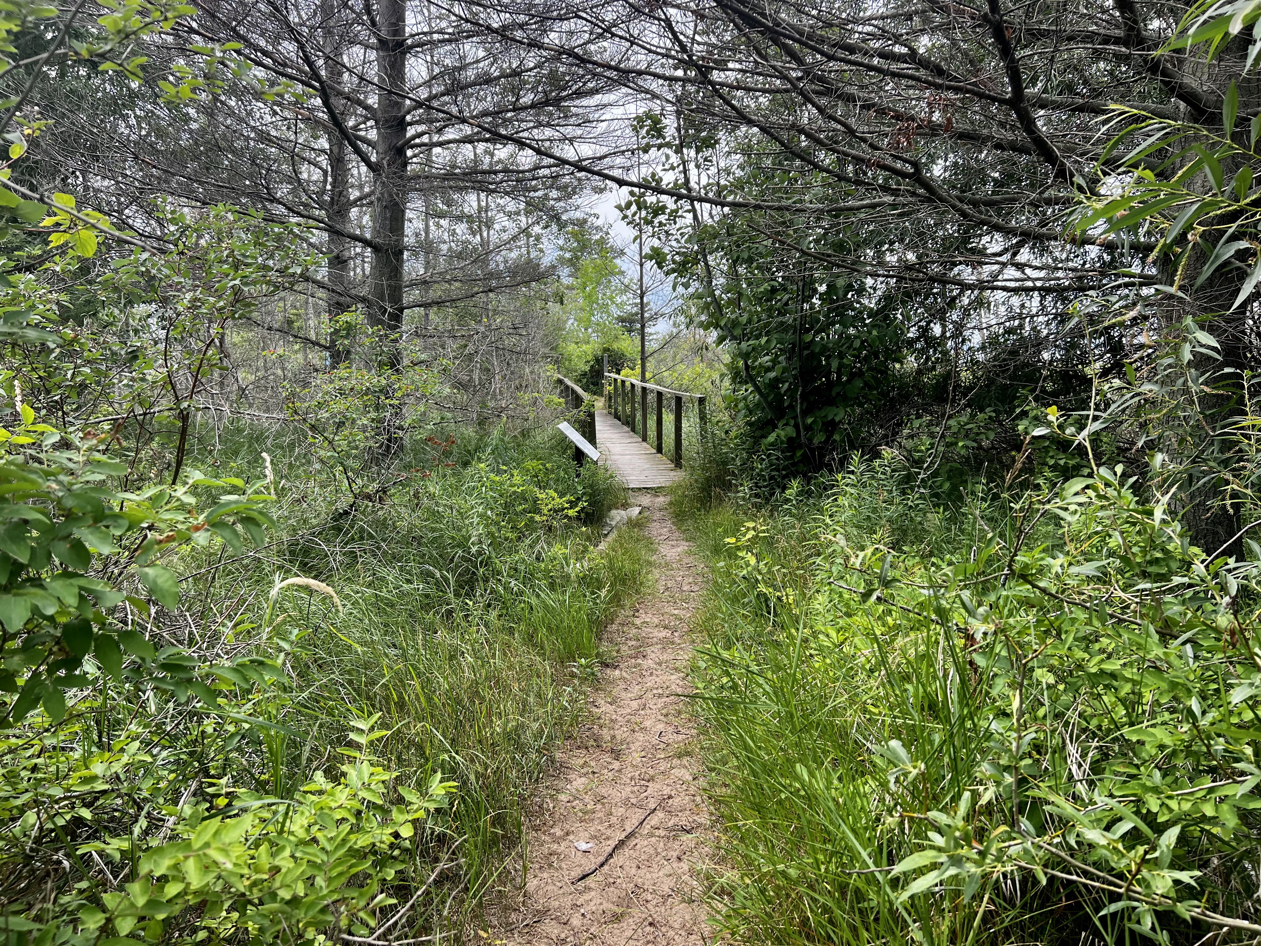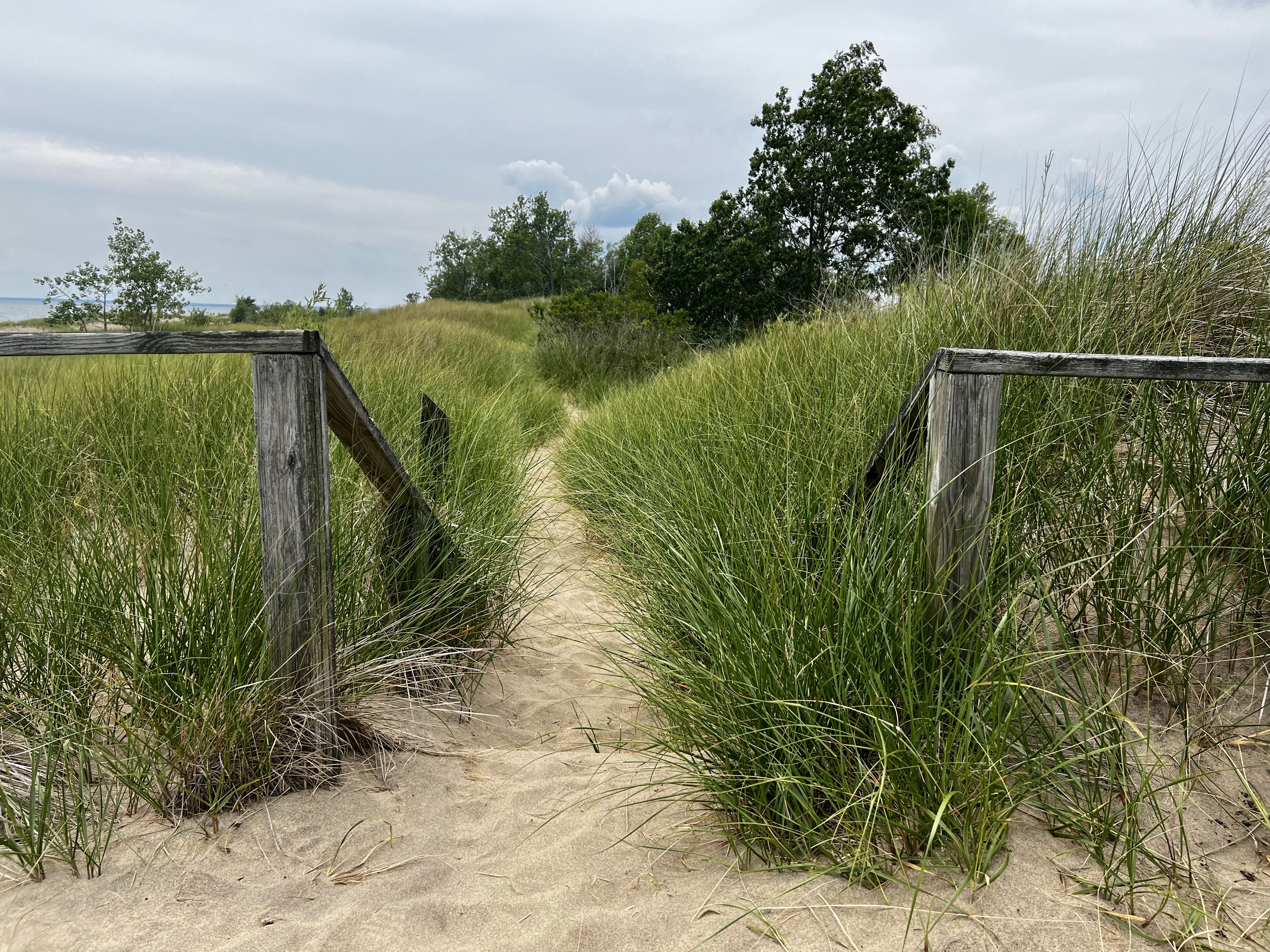 I’m a few hours further south, back on the main mitten. But the clouds are still overhead. I decide to start with the nature trail. The trail goes through the middle of this mini-peninsula. I catch glimpses of water on either side as I walk along the boardwalk.