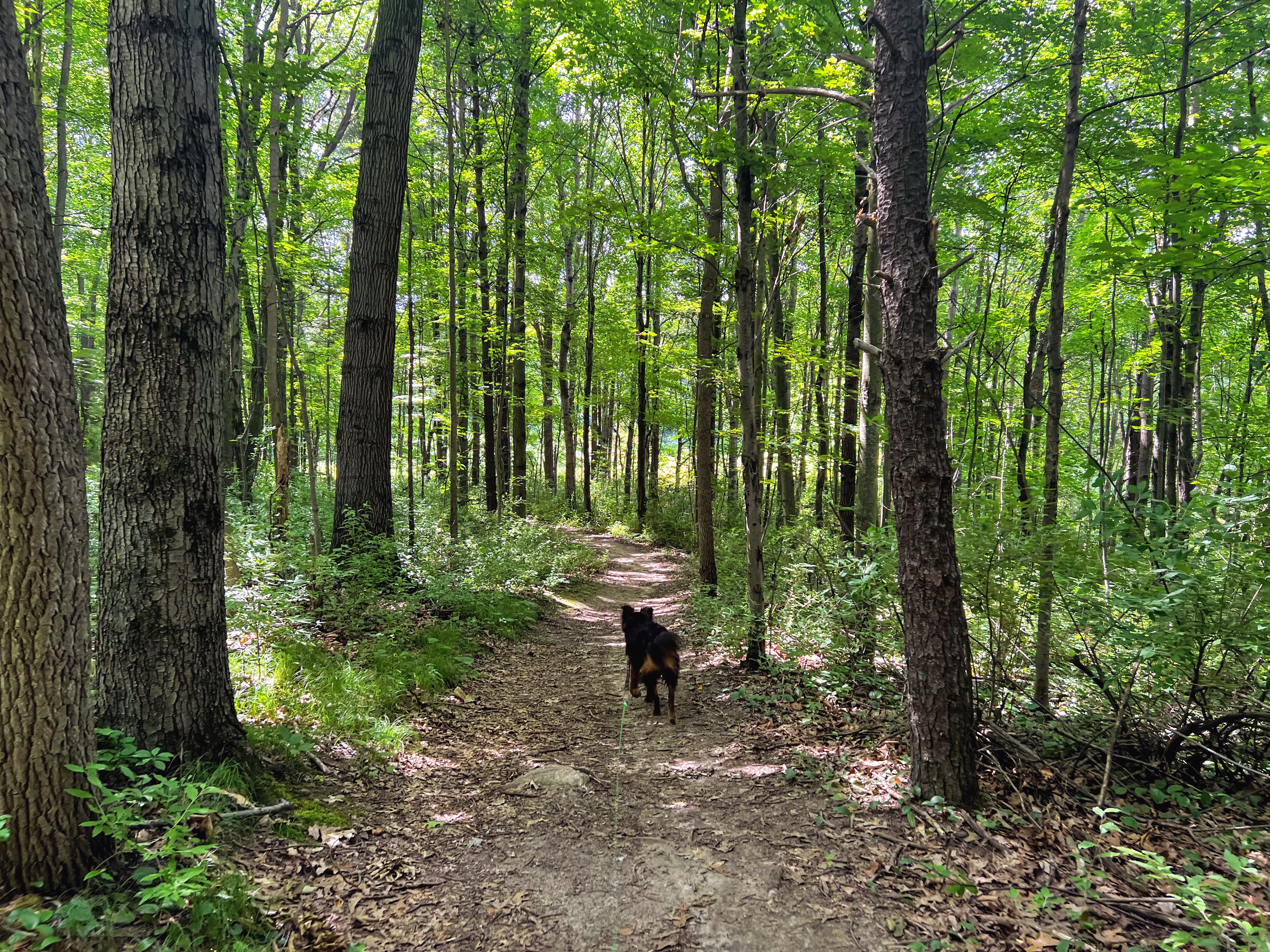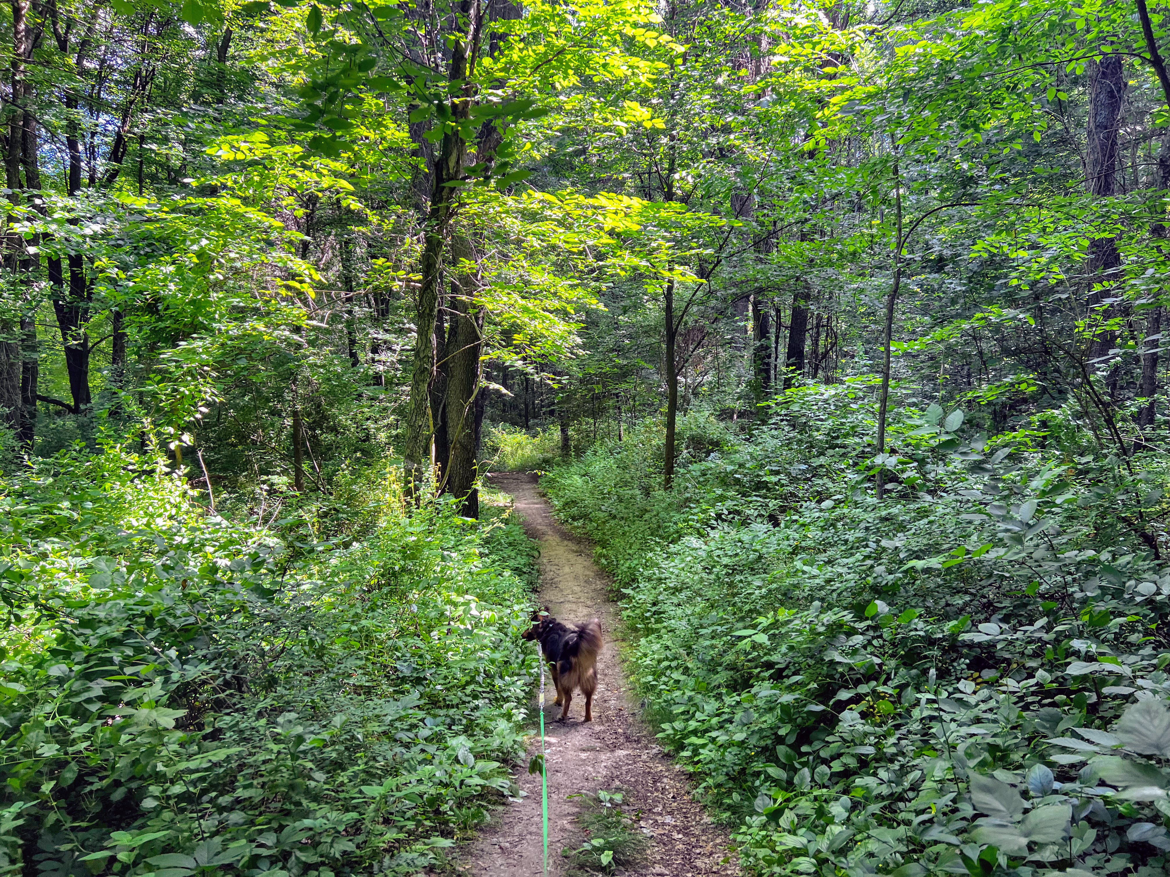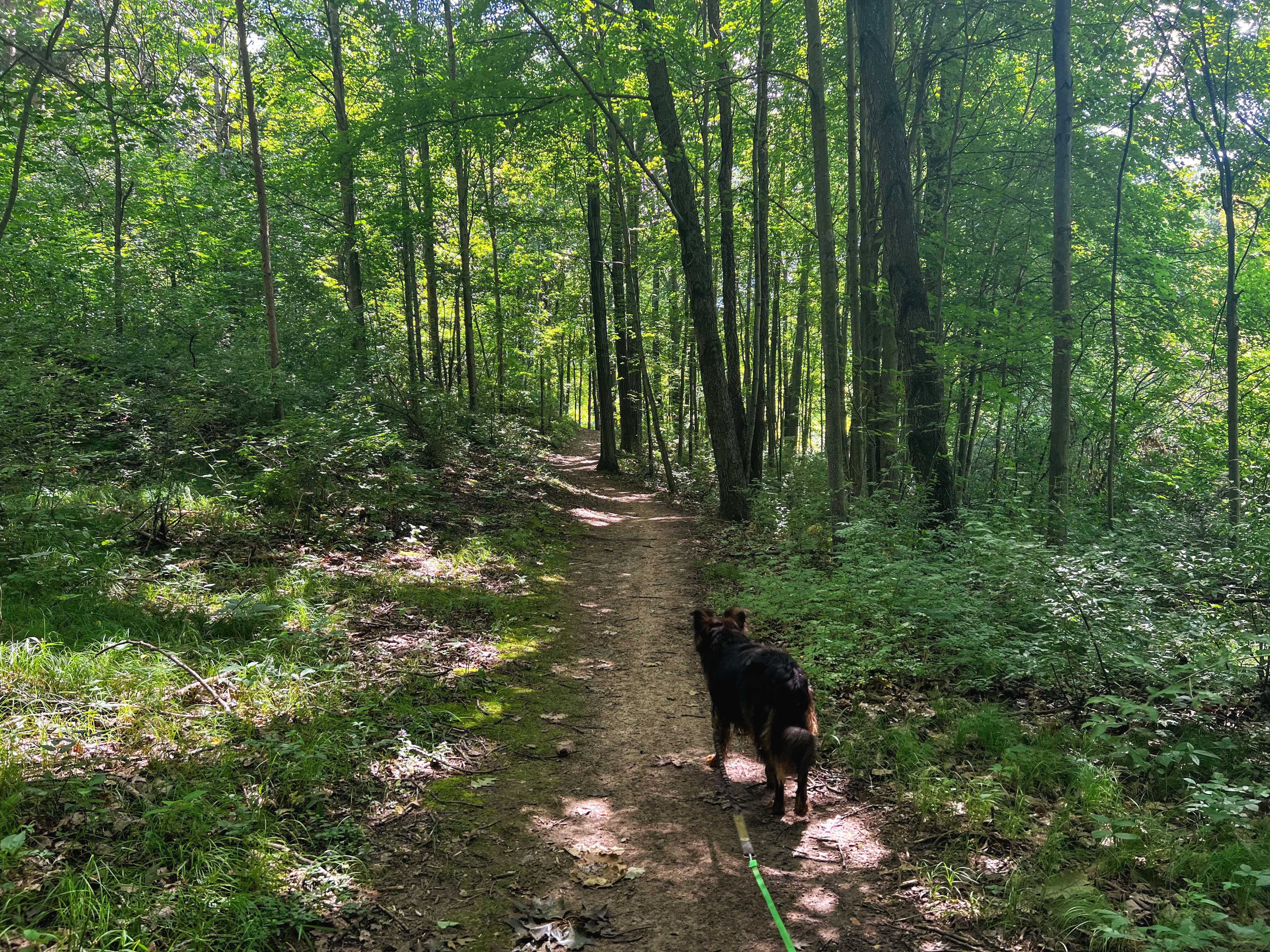 But our next loop takes us around a lake, and I know Gob wants to take a dip. With every step we take, Gob looks as me with eyes that say, “Are we there yet?” And I tell him “Soon”. And finally, I’m telling the truth. He can smell the water and picks up the pace. All but pulling me down the final hill and into the water with him. I let him soak for a few minutes, but then the bugs start to, well, bug me. So I convince him to continue down the trail. I have to at least attempt the full loop. Poor old Gob is ready to be done though. He drags behind me like the pitiful old man dog he is. I let him take one more soak, as we turn back to hike the final mile back to our car.