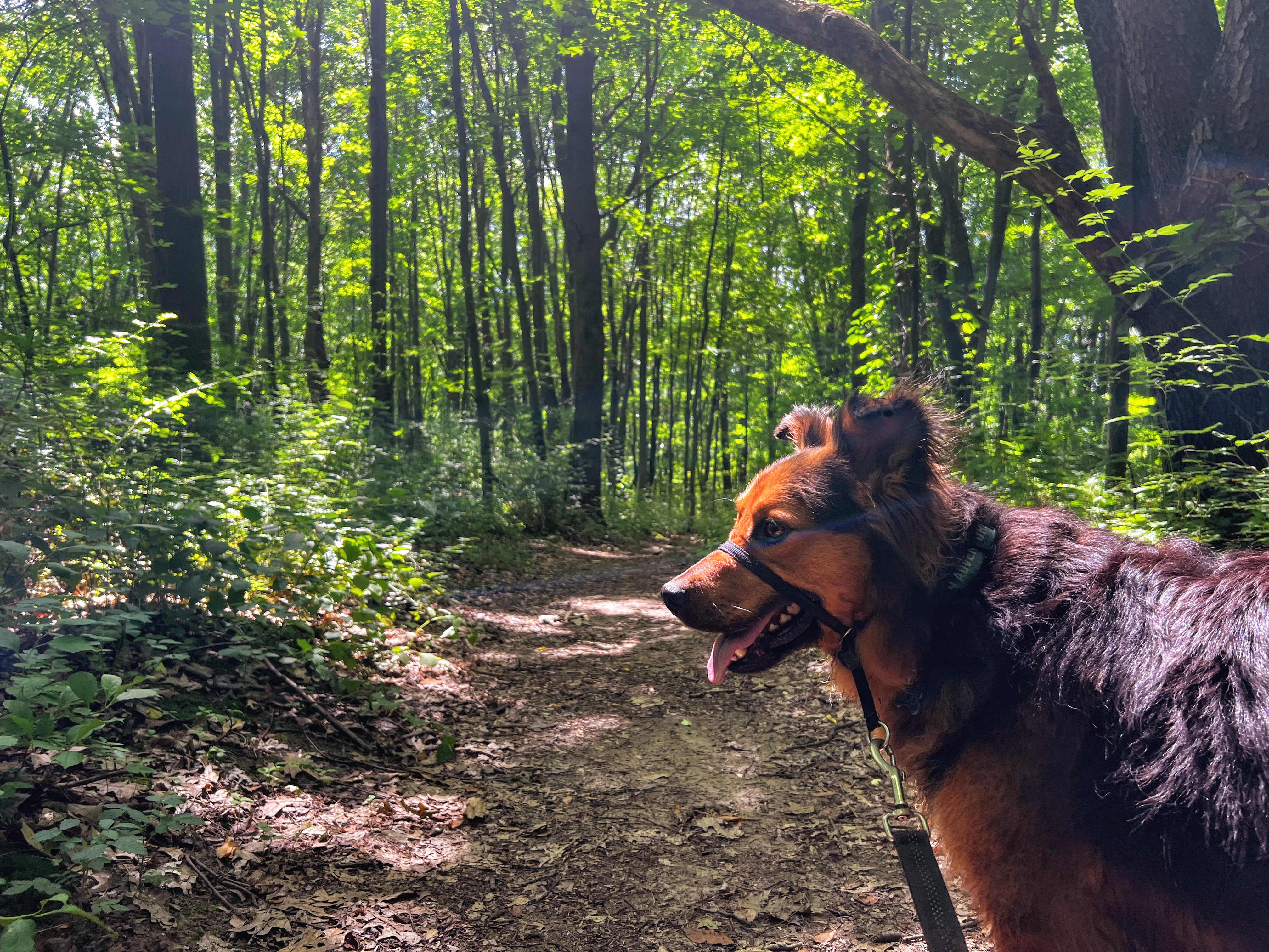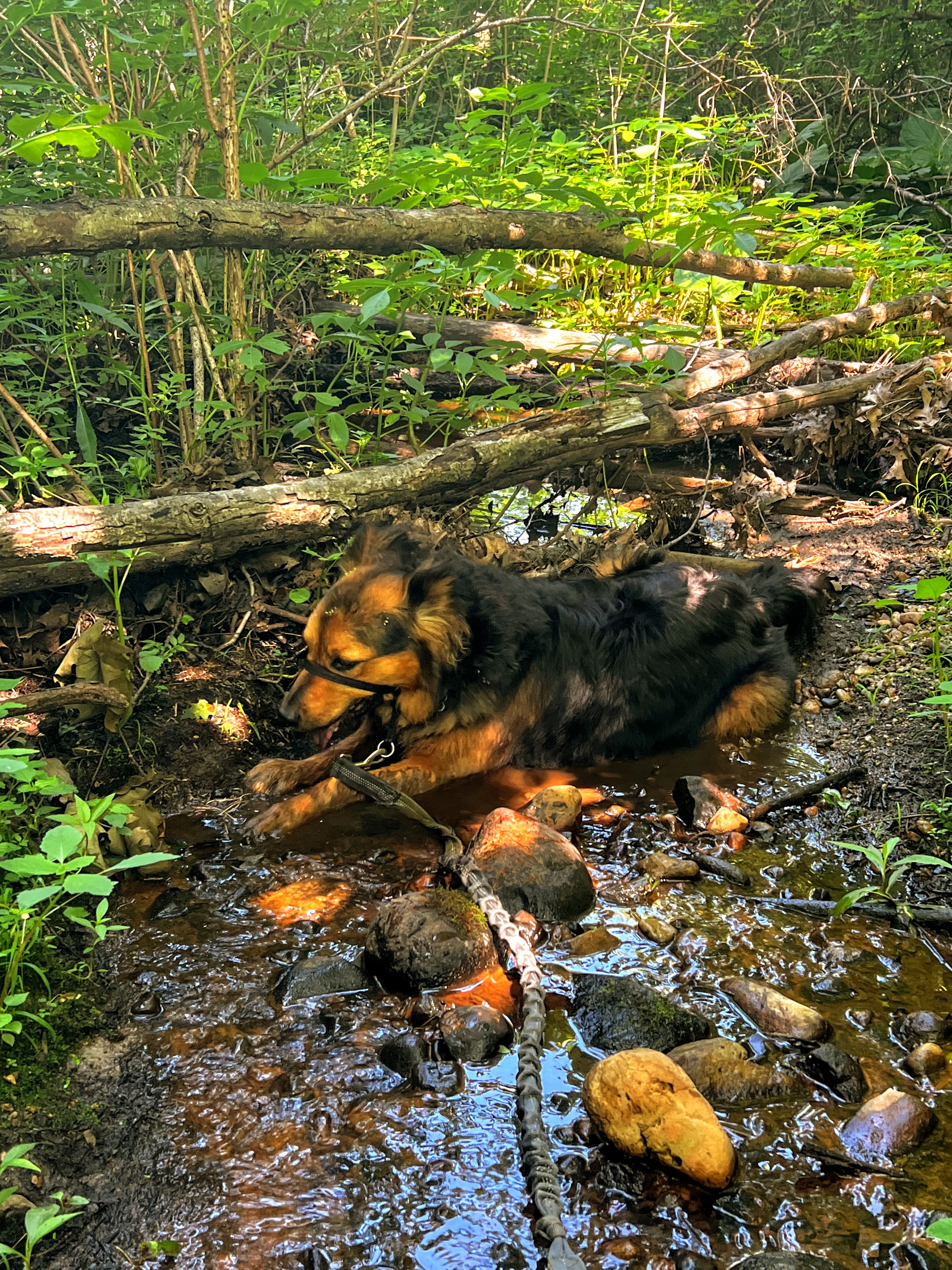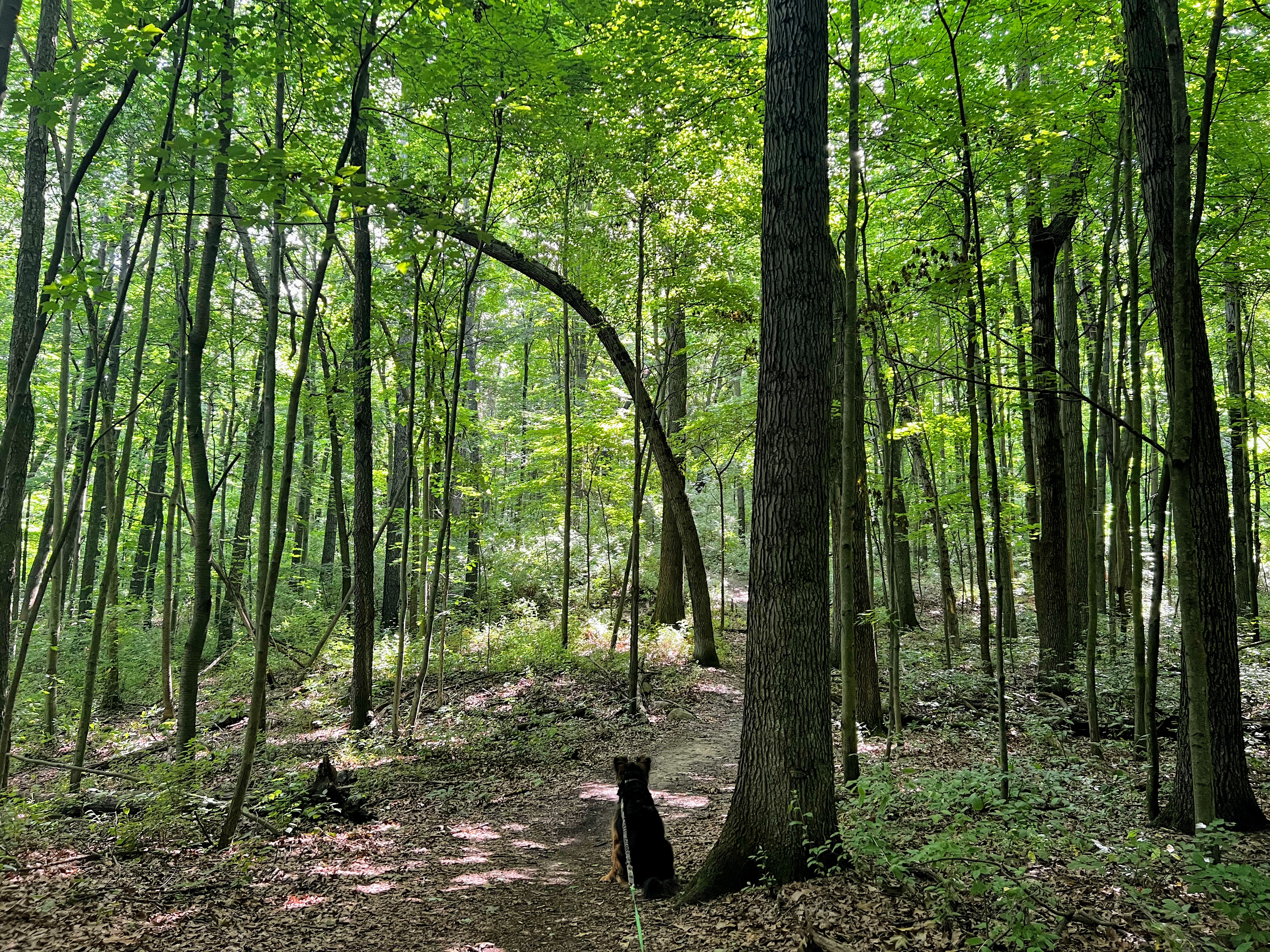 It’s been a while since Gob’s last true hike. And he is definitely ready for it. My plan is to hit the trail early. Like 8 AM. Both to avoid people but also because it’s supposed to be HOT today. But to nobody’s surprise, we roll up to the trailhead at 11 AM. Because neither of us like mornings. And it’s already quite toasty out. I apply copious amounts of sunscreen and pack water for our 7-mile hike. But even with our preparation, Gob begins to slow down after a few miles. He is stopping to lay in the shade when I pause for pictures. And he is overjoyed when he finally finds a small creek to cool off in. We complete the first of our two loops and contemplate calling it quits.